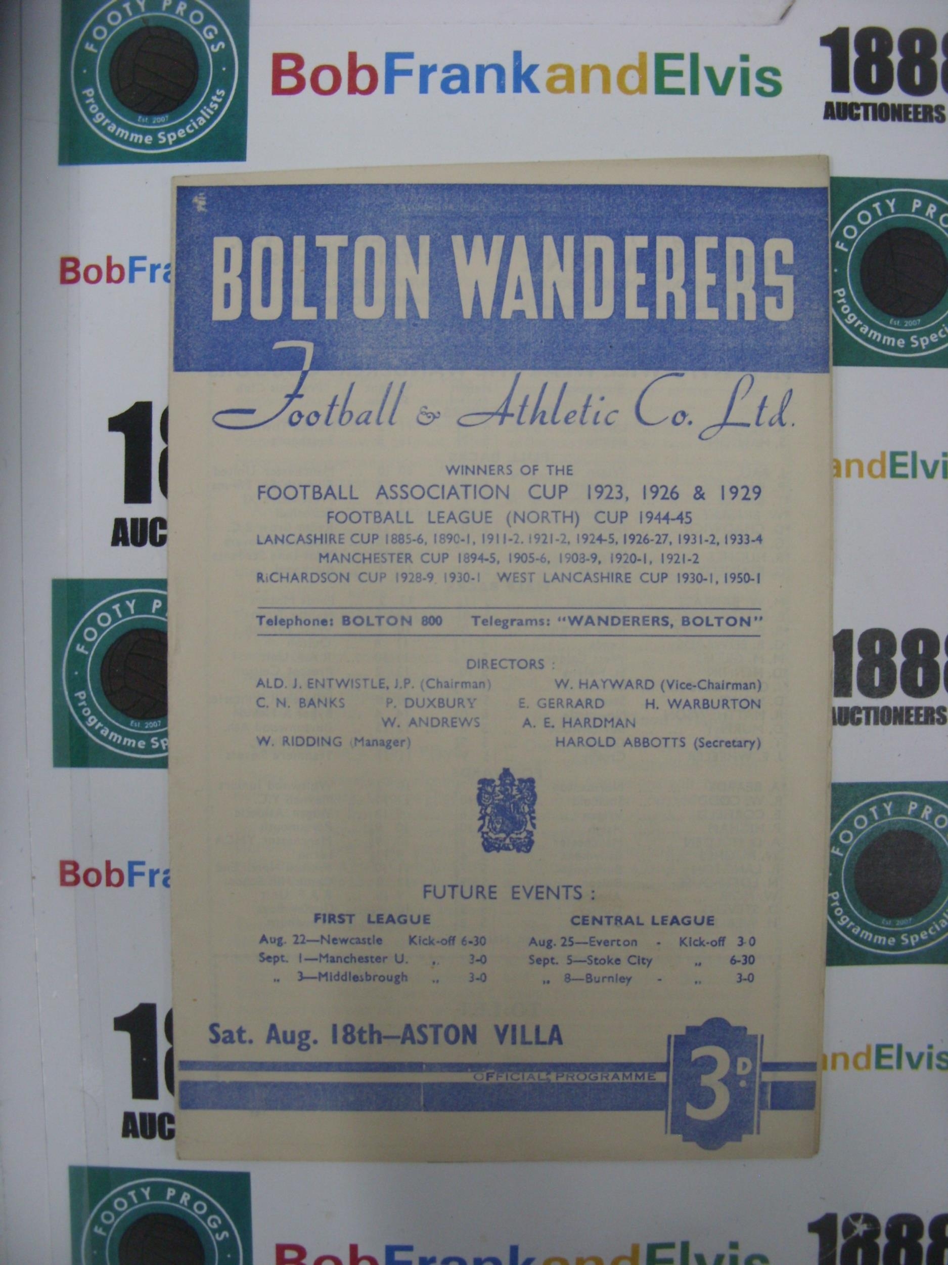 BOLTON WANDERERS, 1951/1952, a football programme from the game versus Aston Villa, played on 18/08/1952 (pin hole in corner, team changes).