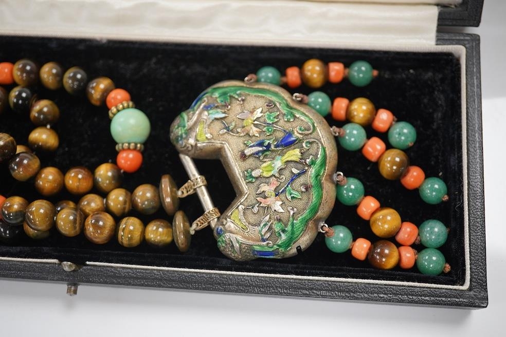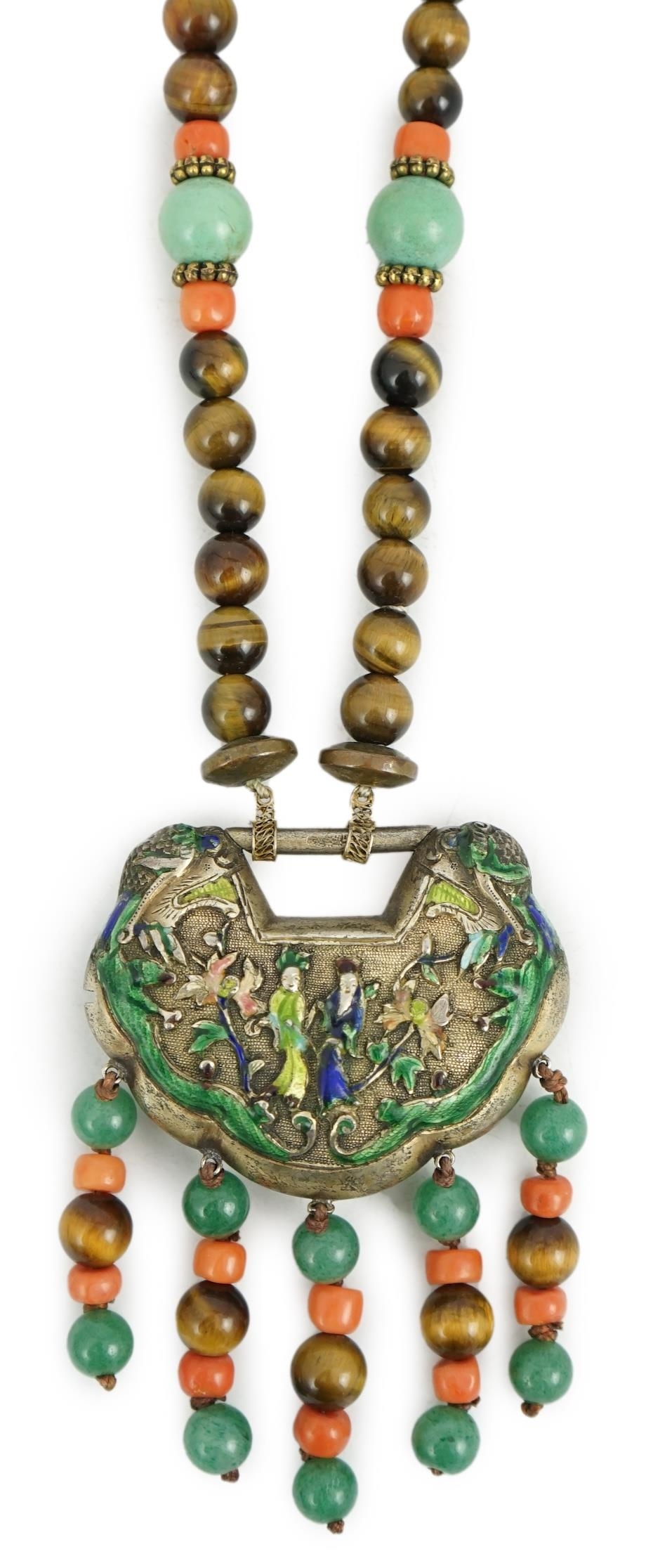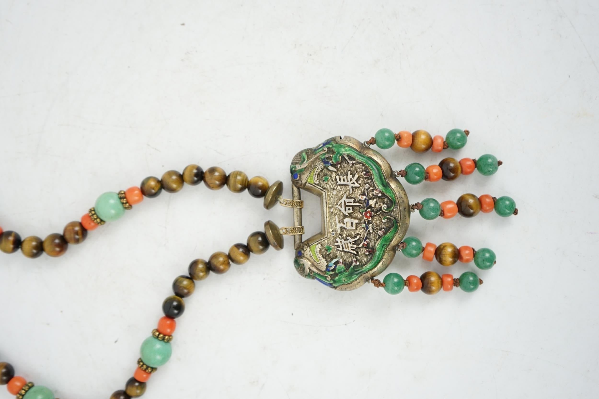 A Chinese silver and enamel amulet tiger's eye, coral and turquoise bead necklace, housed in a liberty box. Condition - good