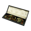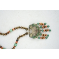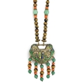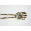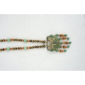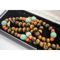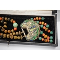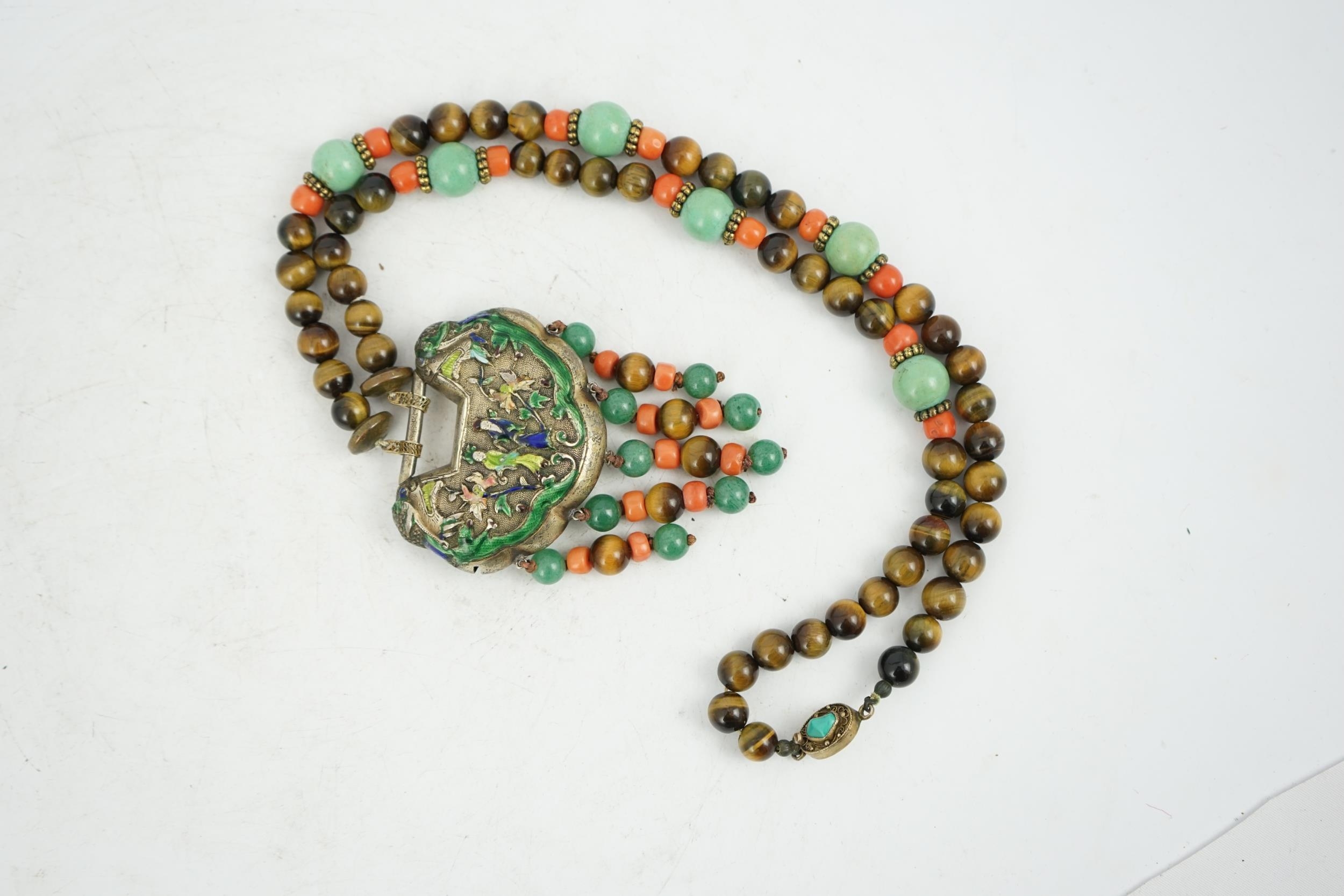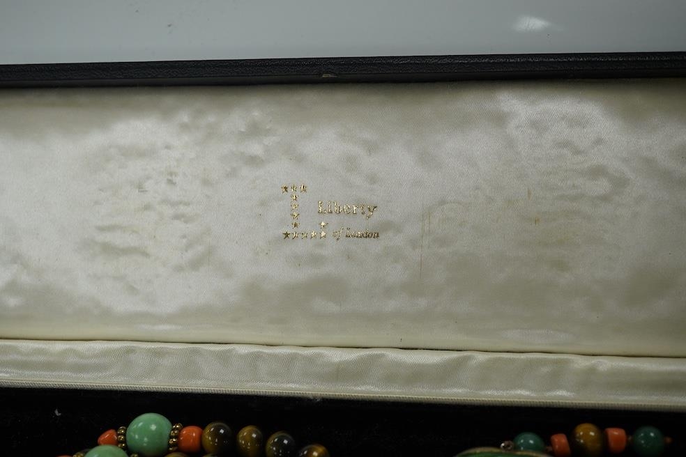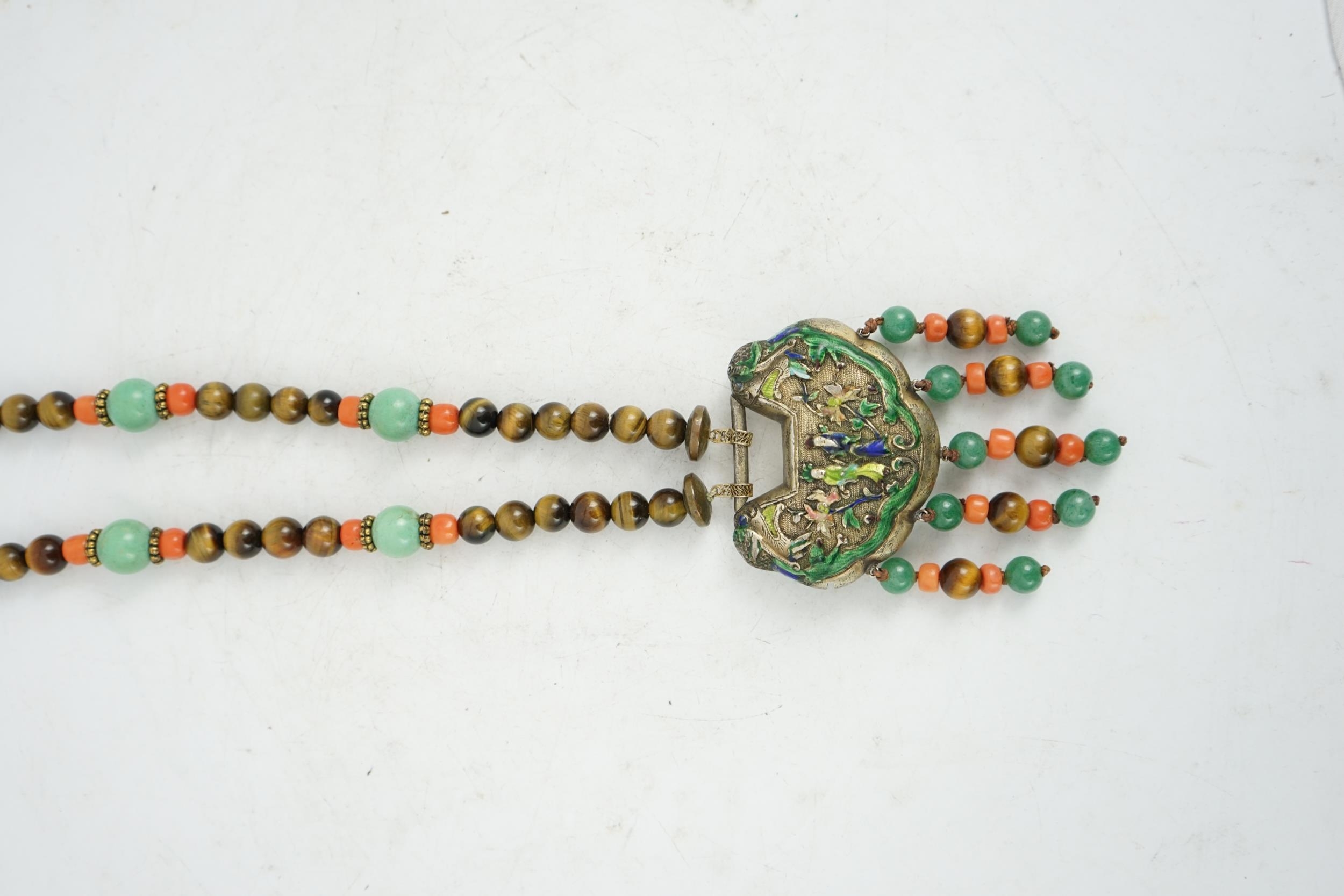 A Chinese silver and enamel amulet tiger's eye, coral and turquoise bead necklace, housed in a liberty box. Condition - good