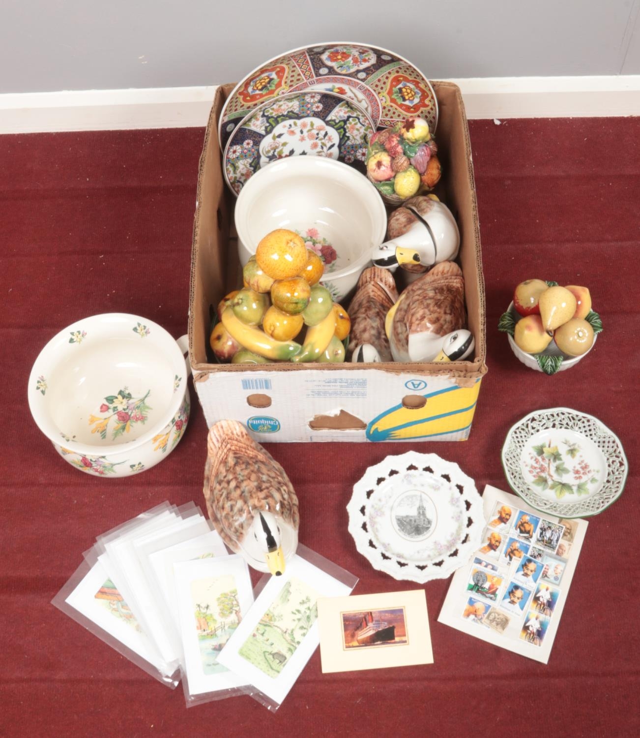 A box of miscellaneous. Includes Portuguese ceramics, modern Imari style plates, Gandhi stamps etc.