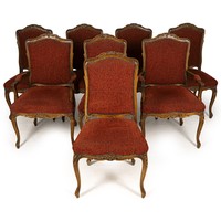 Each padded back within a conforming frame surmounted by a carved cresting, stuff-over seat, carved apron, on cabriole legs, distress