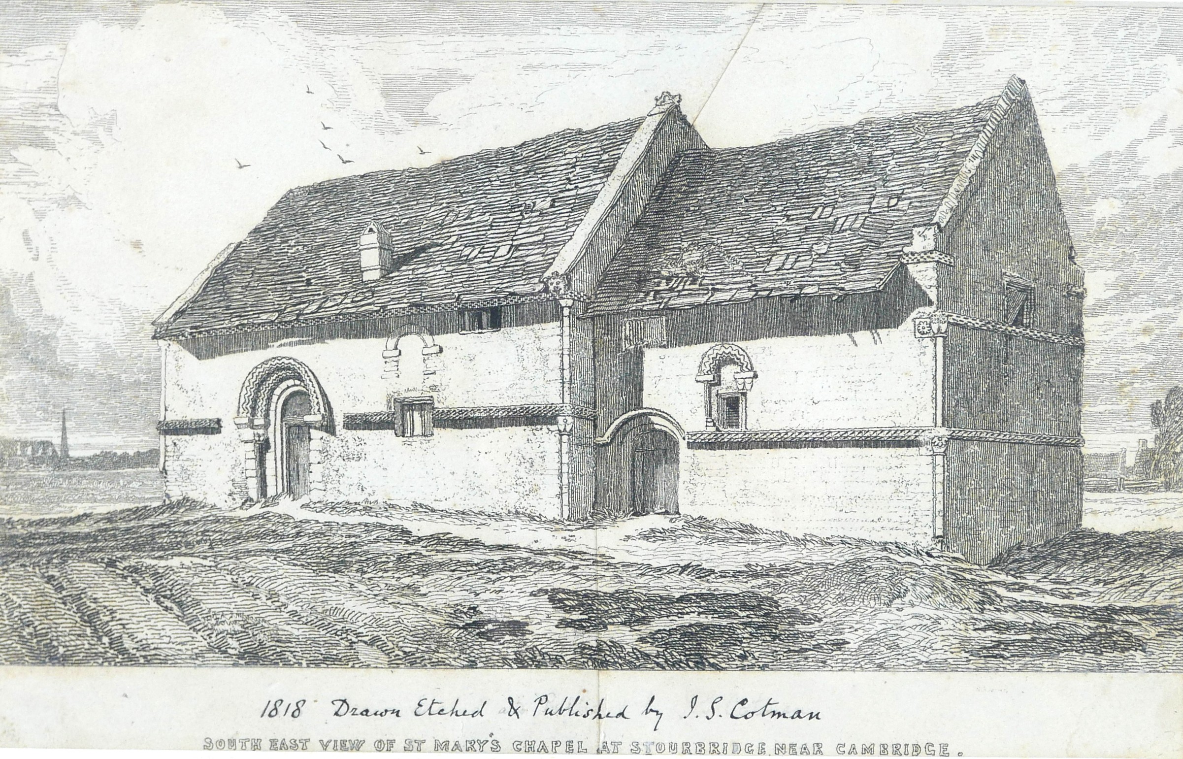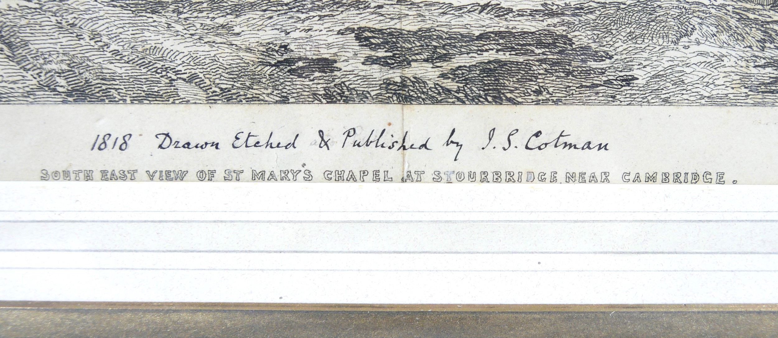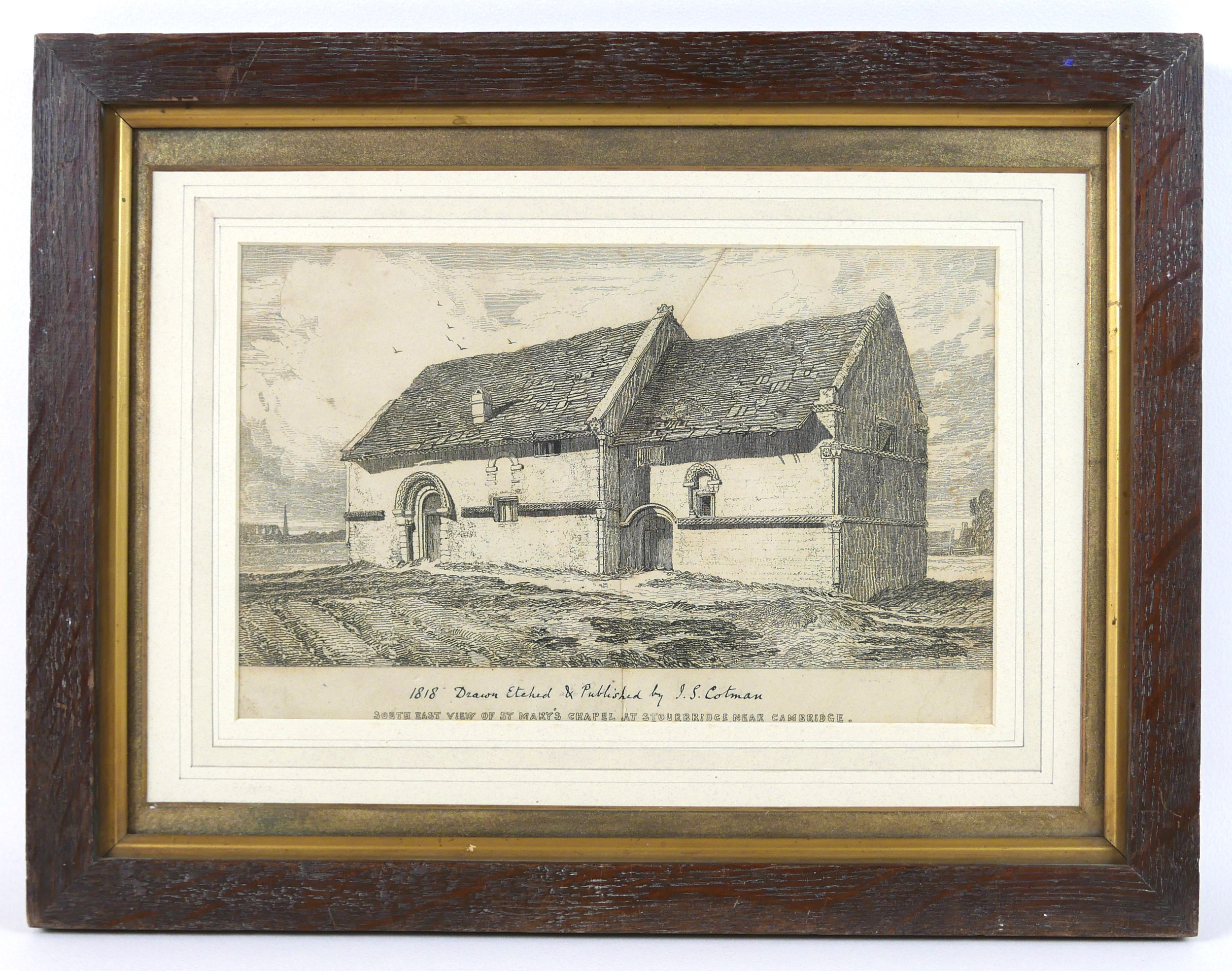 After John Sell Cotman (British, 1782-1842): 'South East View of St Mary's Chapel at Stourbridge near Cambridge', etching, with inked legend to lower margin, 17 by 27cm, mounted and in oak frame, 32 by 42cm.