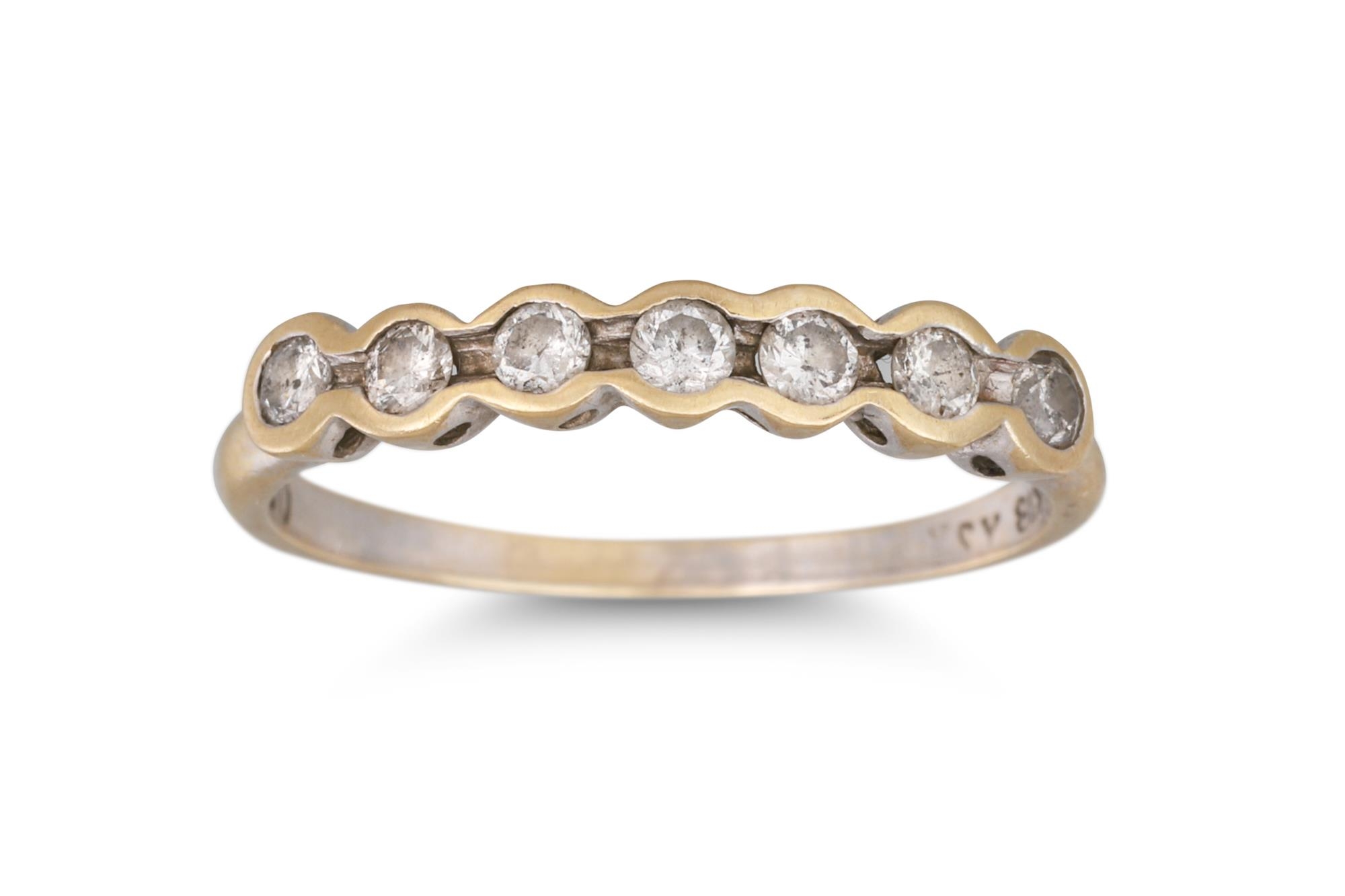 A SEVEN STONE DIAMOND BAND RING, mounted in 18ct gold. Estimated: weight of diamonds 0.25ct. Size J - K