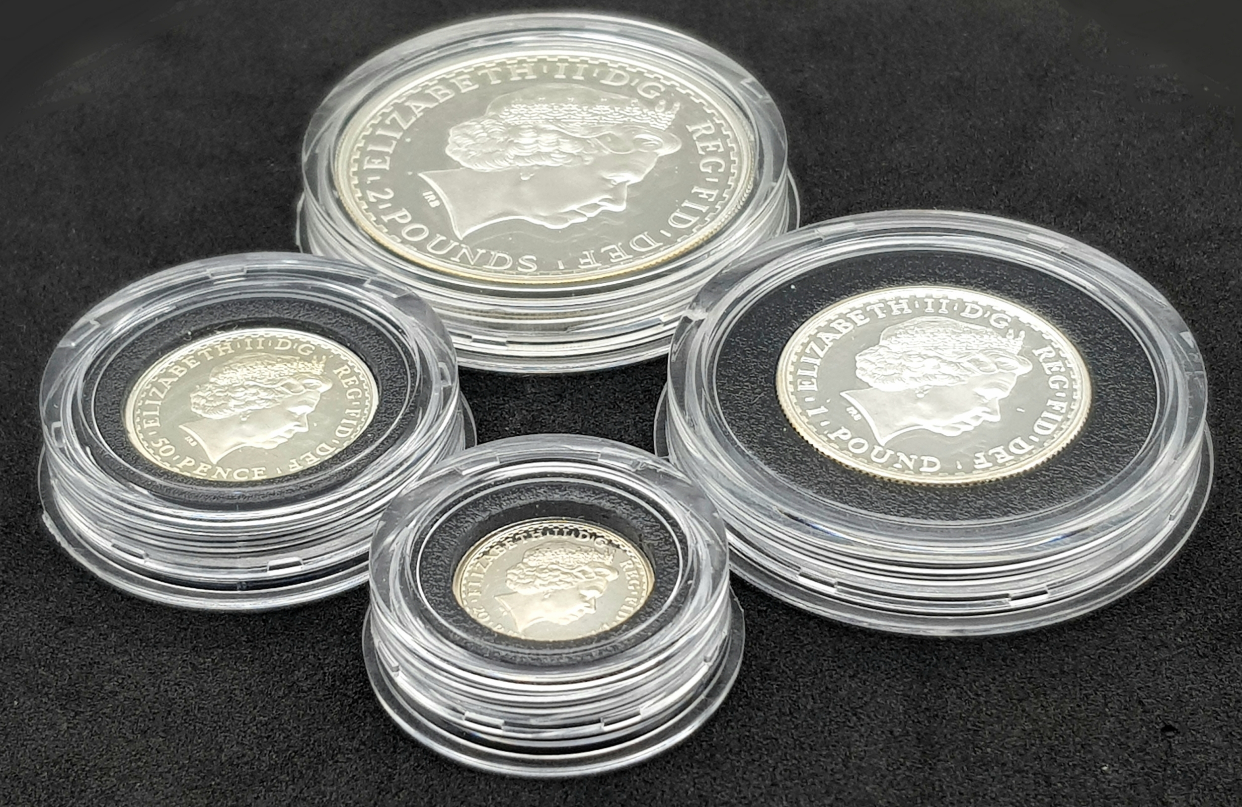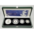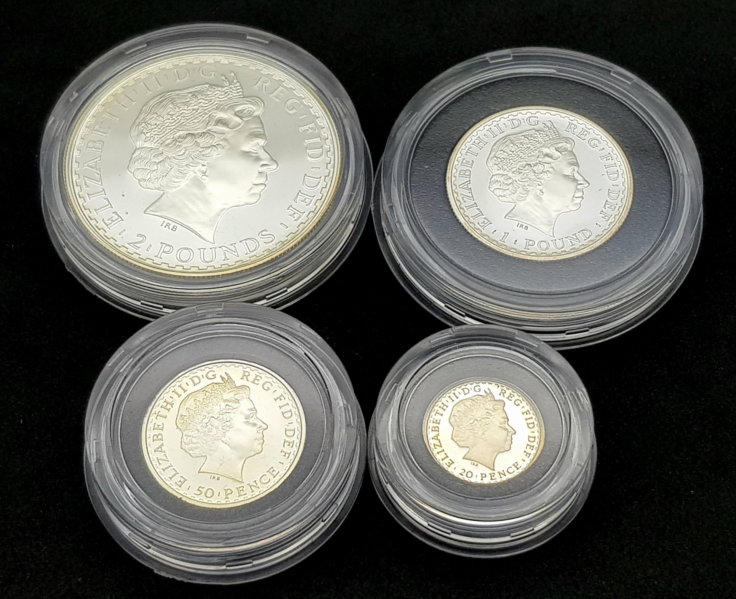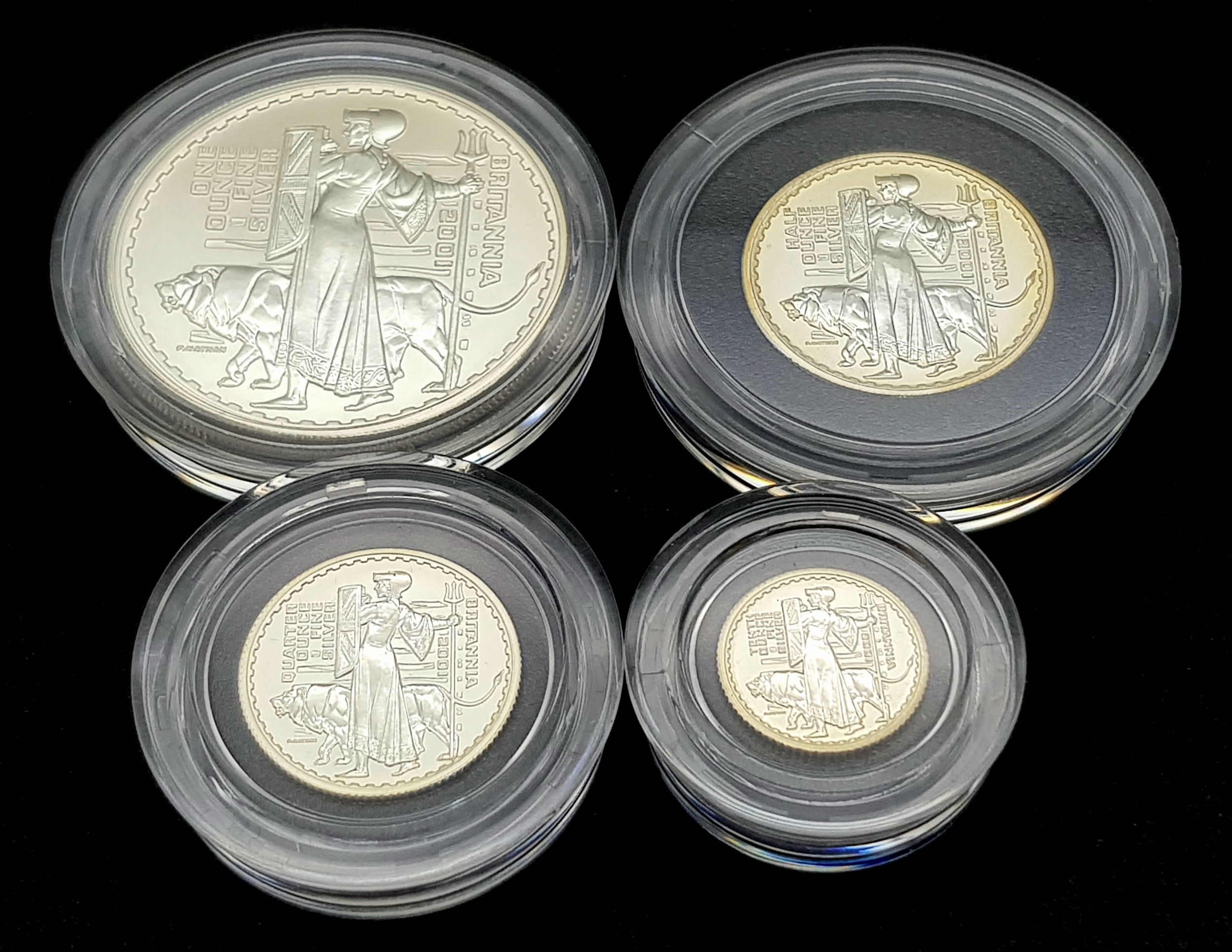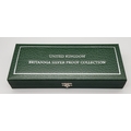 A 2001 Royal Mint United Kingdom Britannia Silver Proof Collection. £2 - 32.45g, £1 - 16.22, 50 pence - 8.11g, 20 pence - 3.24g. 60.2g total weight. Comes with a certificate of authenticity and presentation case. In excellent condition. A wonderful coin collectible or gift to hand down to loved ones.