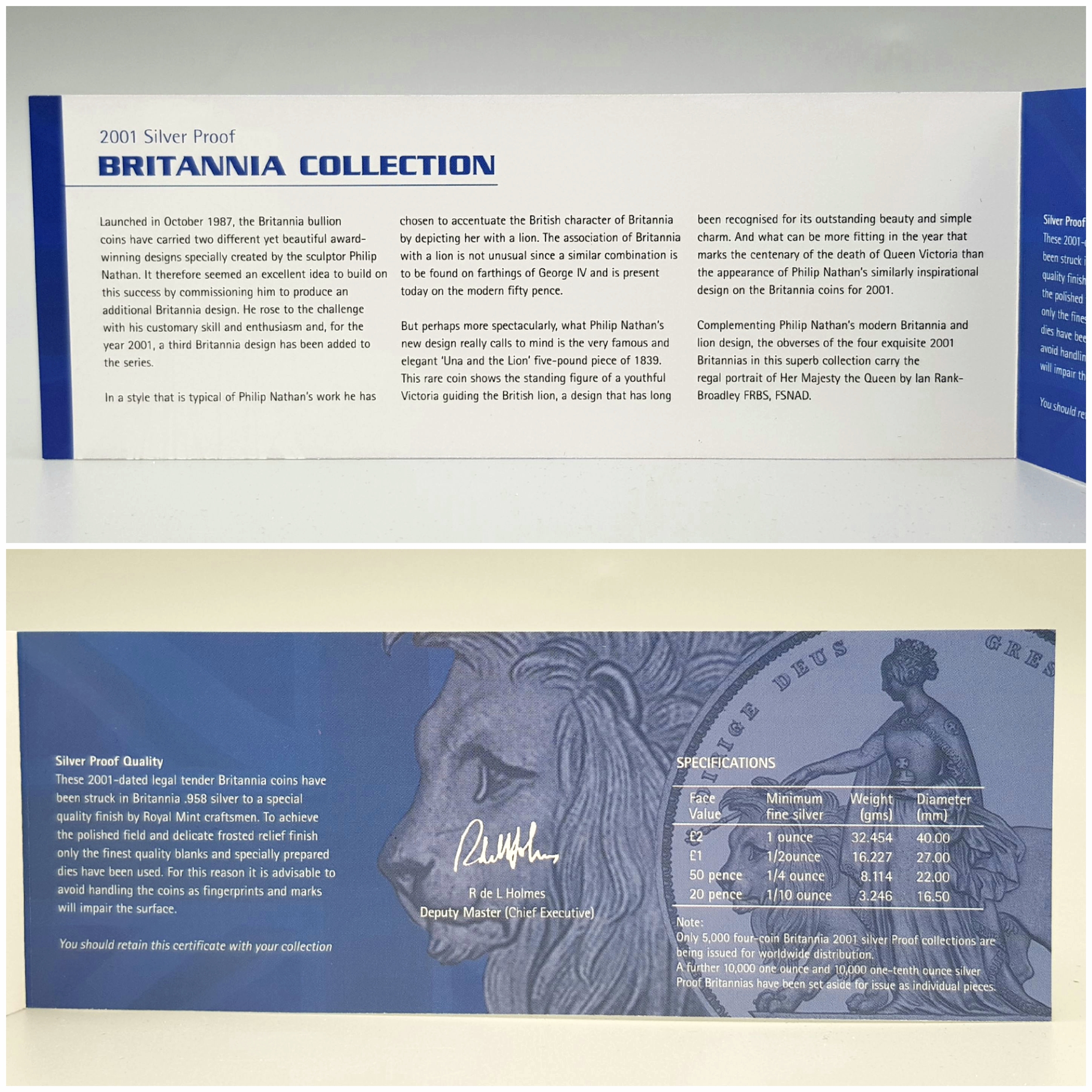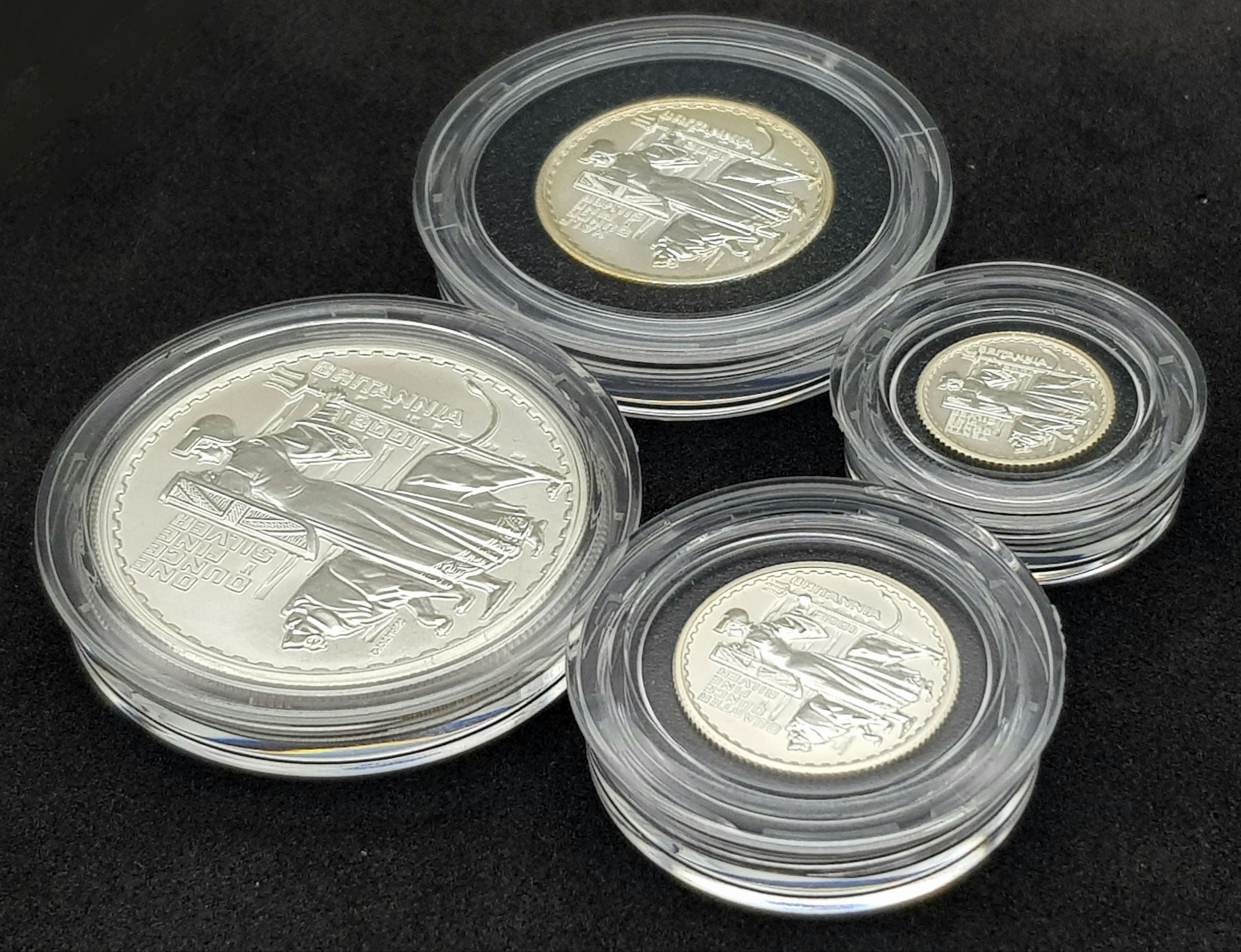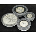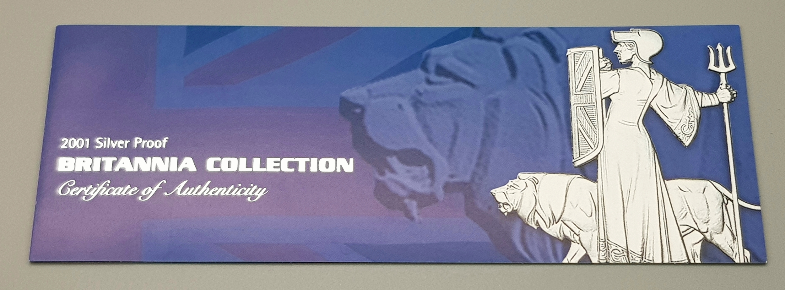 A 2001 Royal Mint United Kingdom Britannia Silver Proof Collection. £2 - 32.45g, £1 - 16.22, 50 pence - 8.11g, 20 pence - 3.24g. 60.2g total weight. Comes with a certificate of authenticity and presentation case. In excellent condition. A wonderful coin collectible or gift to hand down to loved ones.