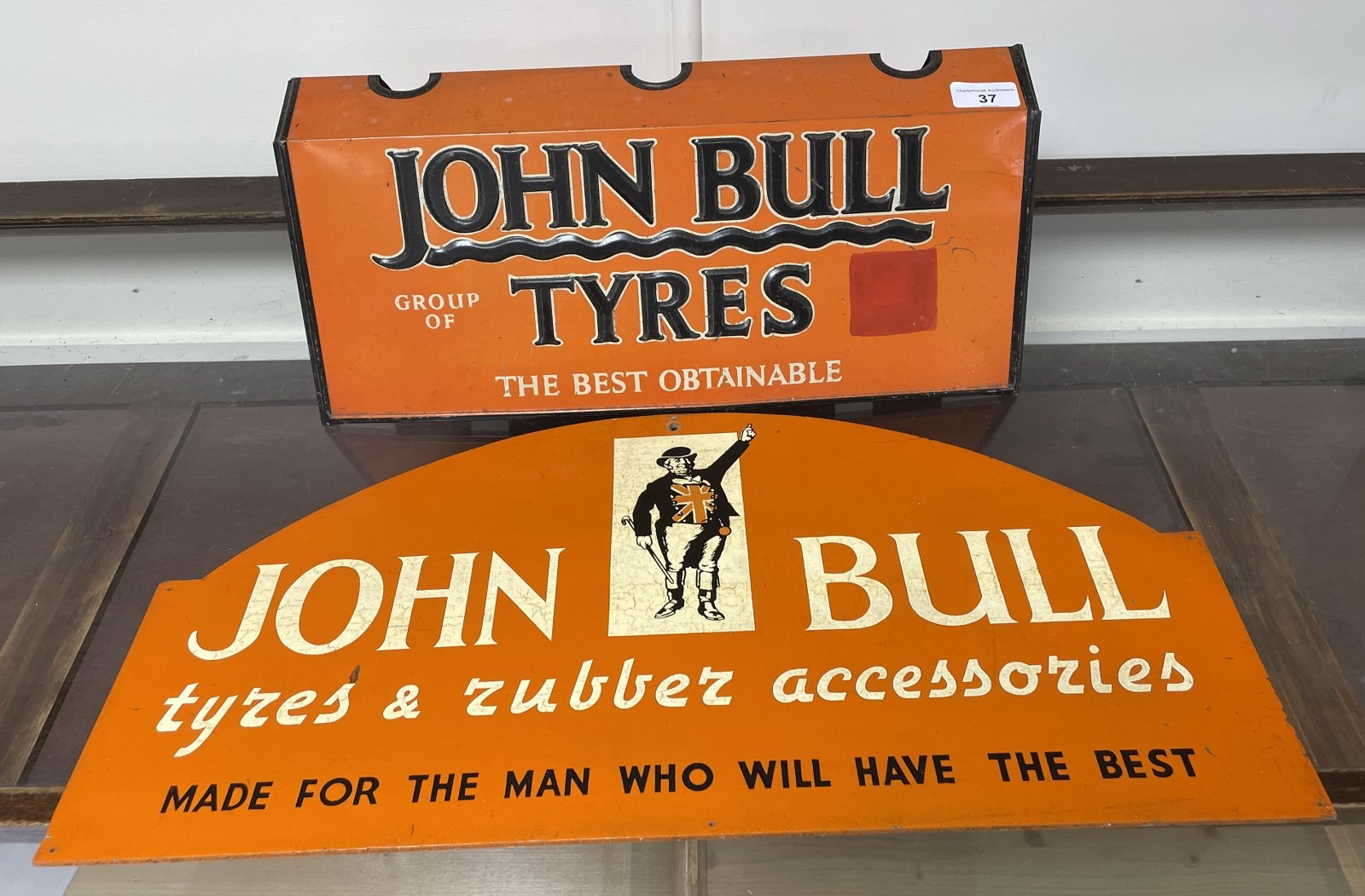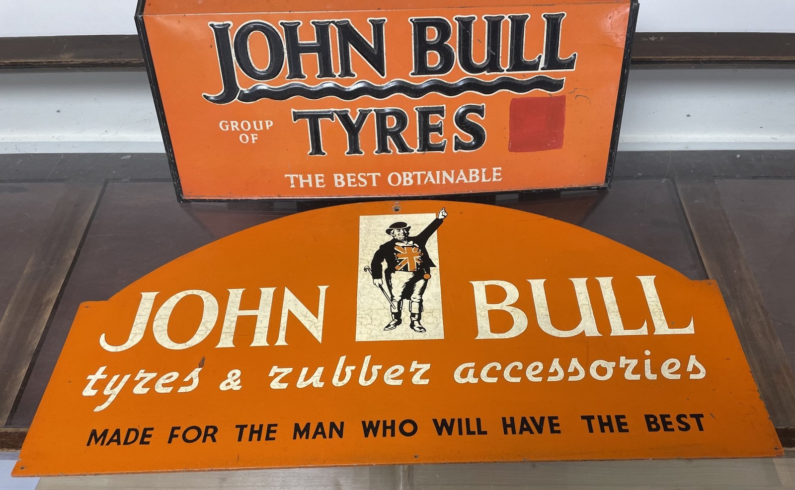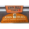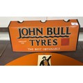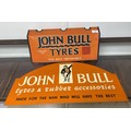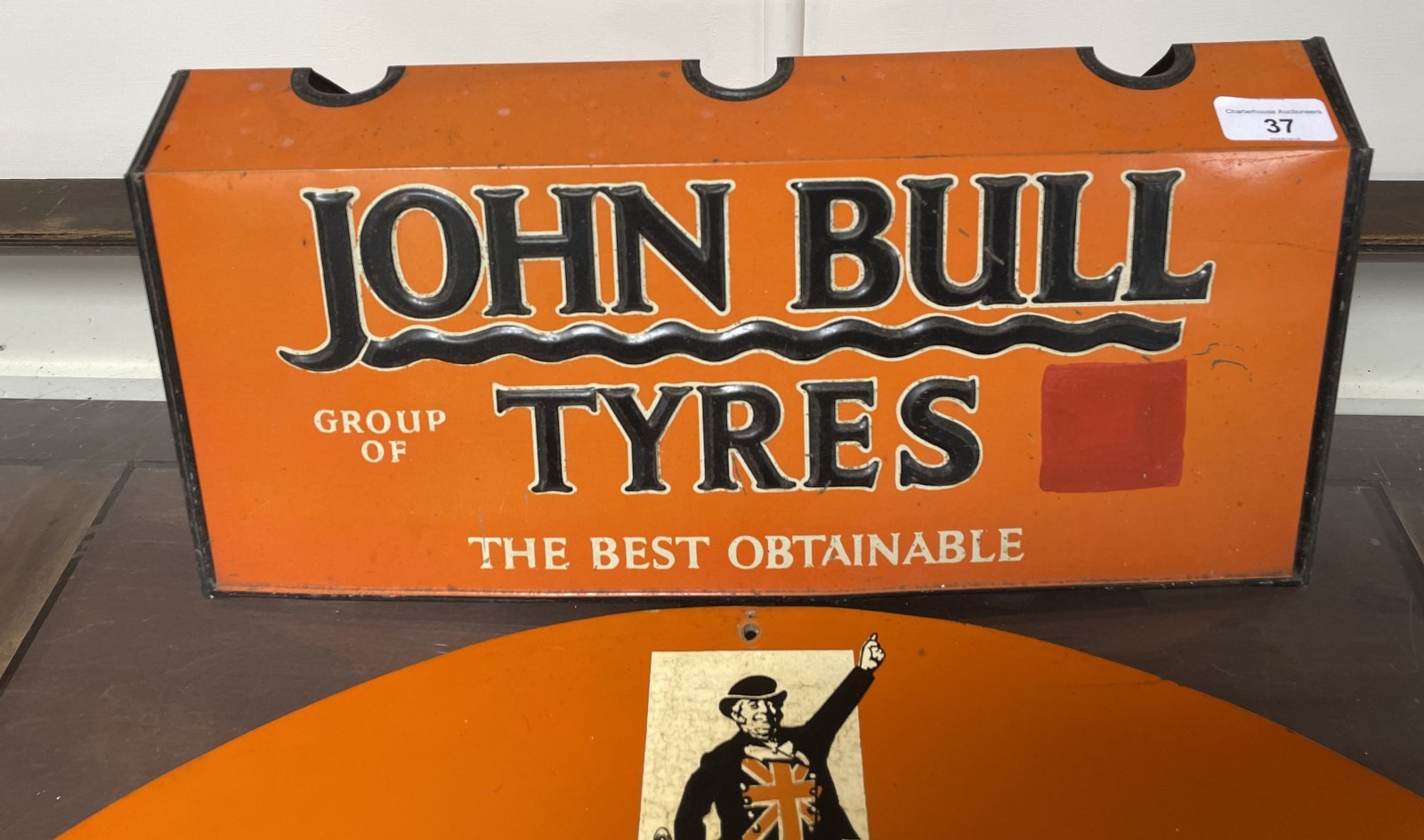 A John Bull Tyres metal stand, 44 cm wide, and a John Bull plaque, 56 cm wide