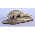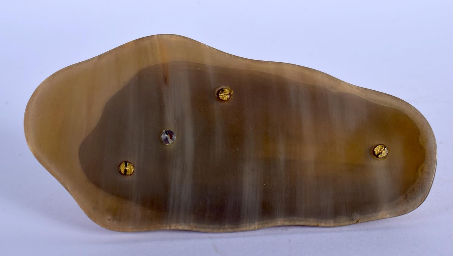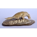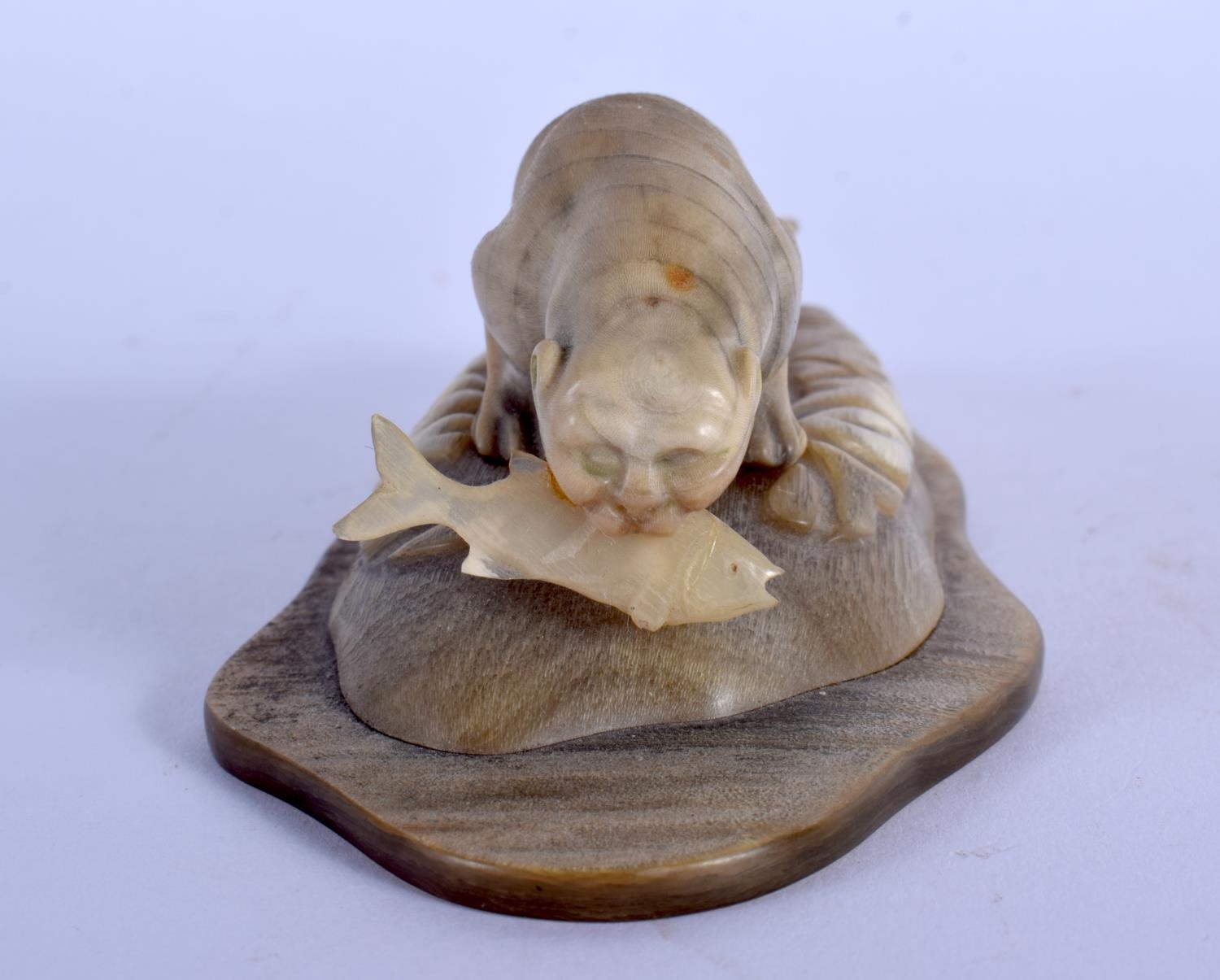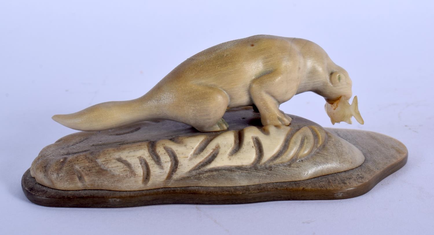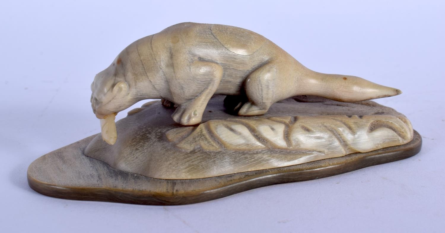A VERY UNUSUAL EARLY 20TH CENTURY NORTH AMERICAN CARVED HORN FIGURE possibly Inuit, formed with a sabe tooth plucking a fish. 11 cm x 3 cm.