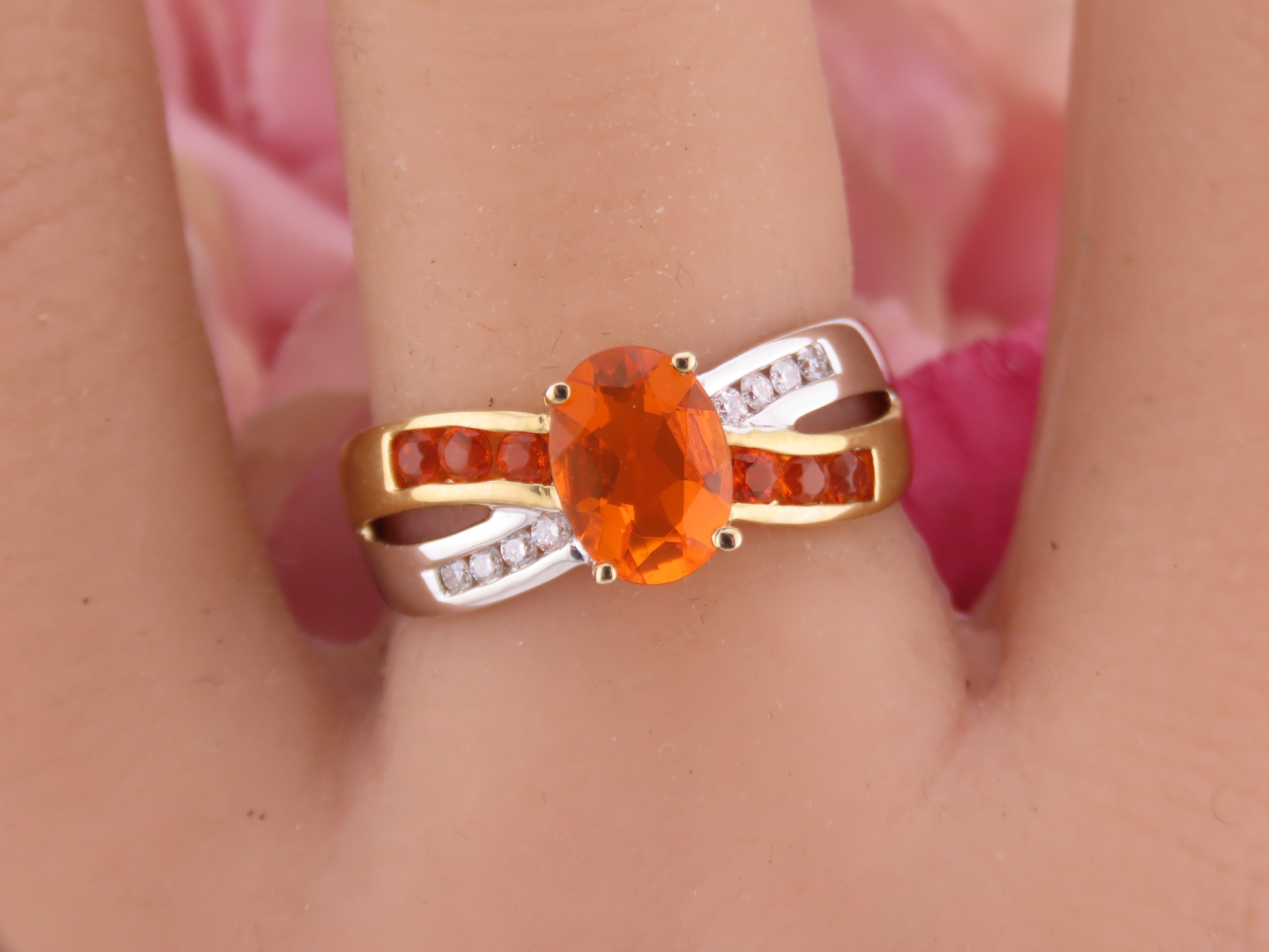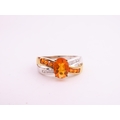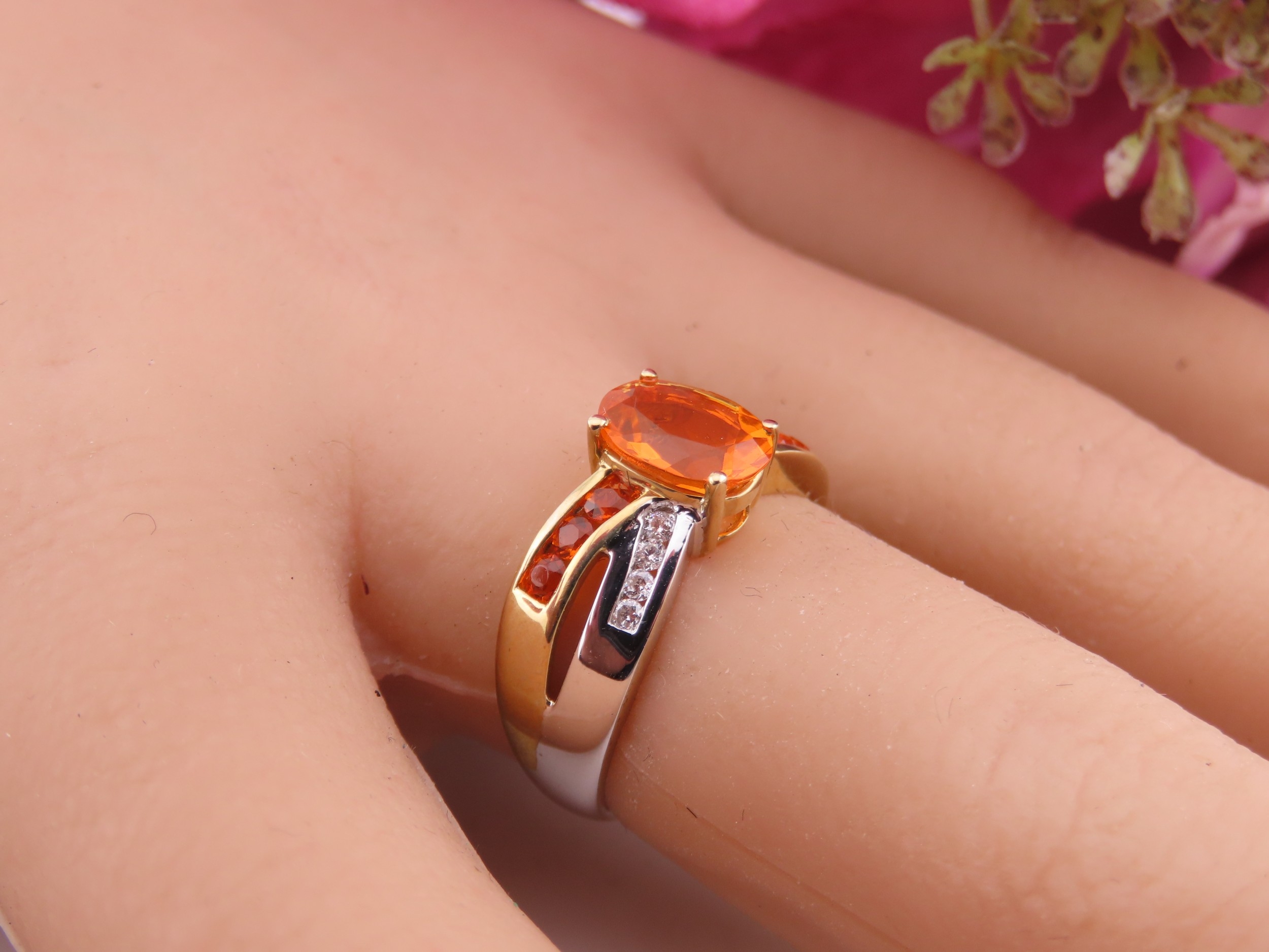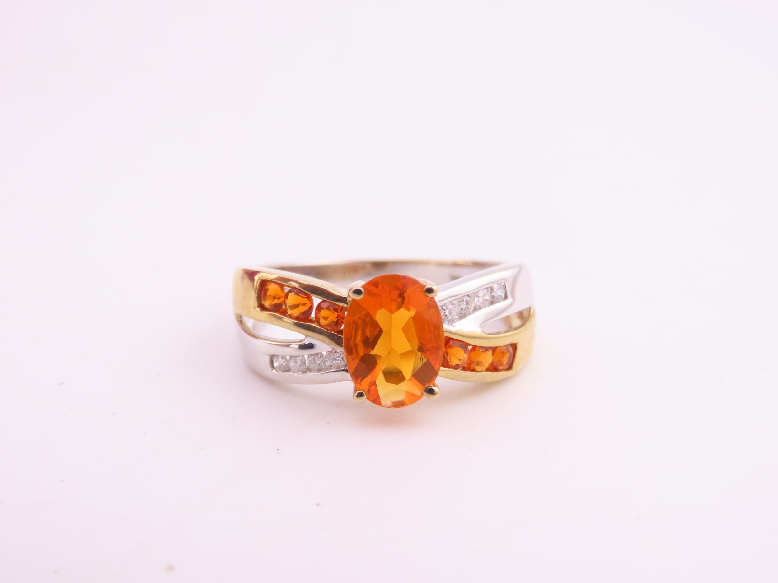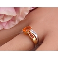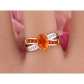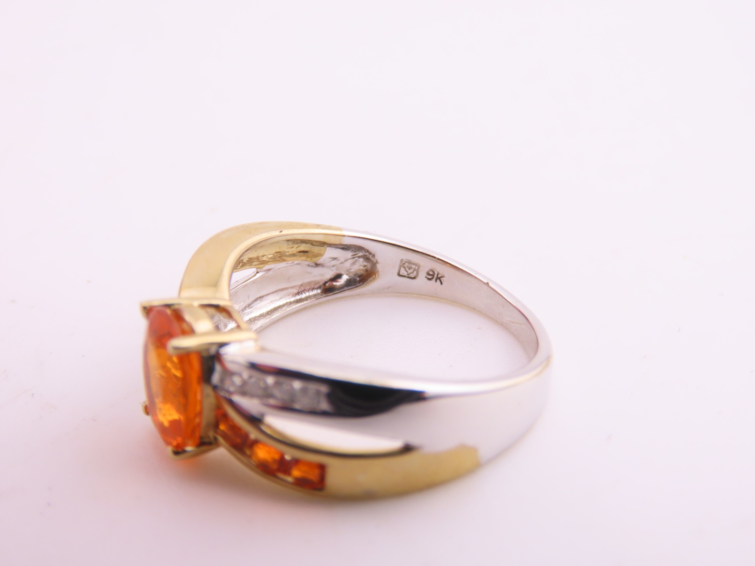 A 9ct yellow and white gold ring set with an oval fire opal accented by small brilliant cut diamonds to the shoulders. Ring size M. Gross weight 2.9 grams.
