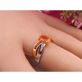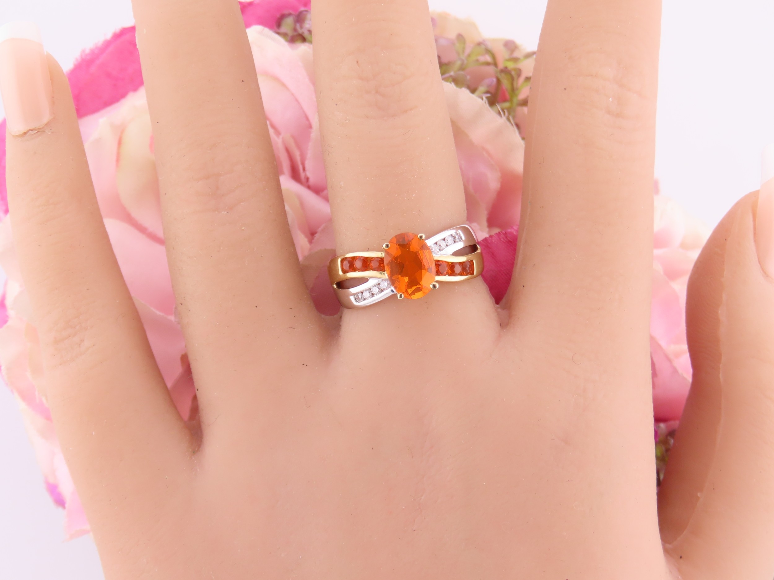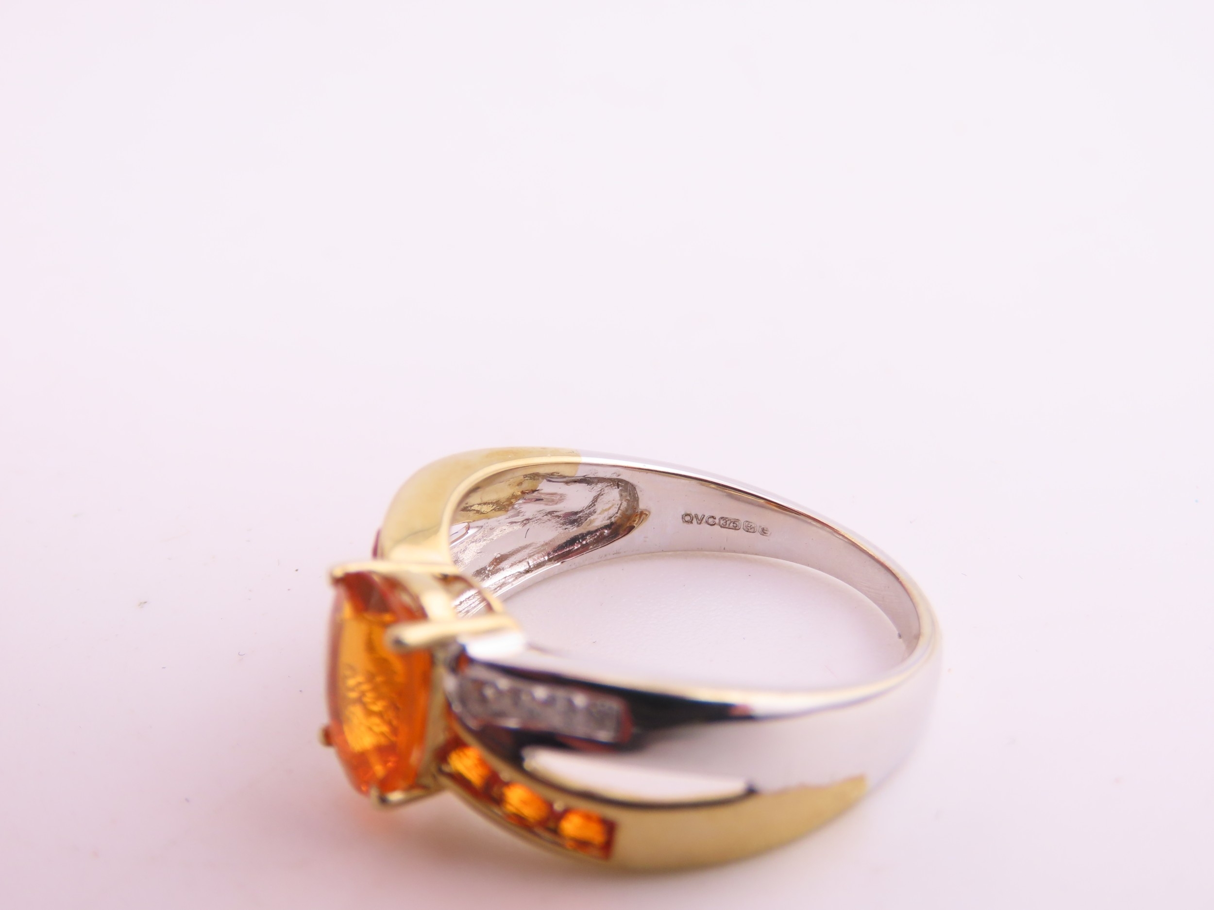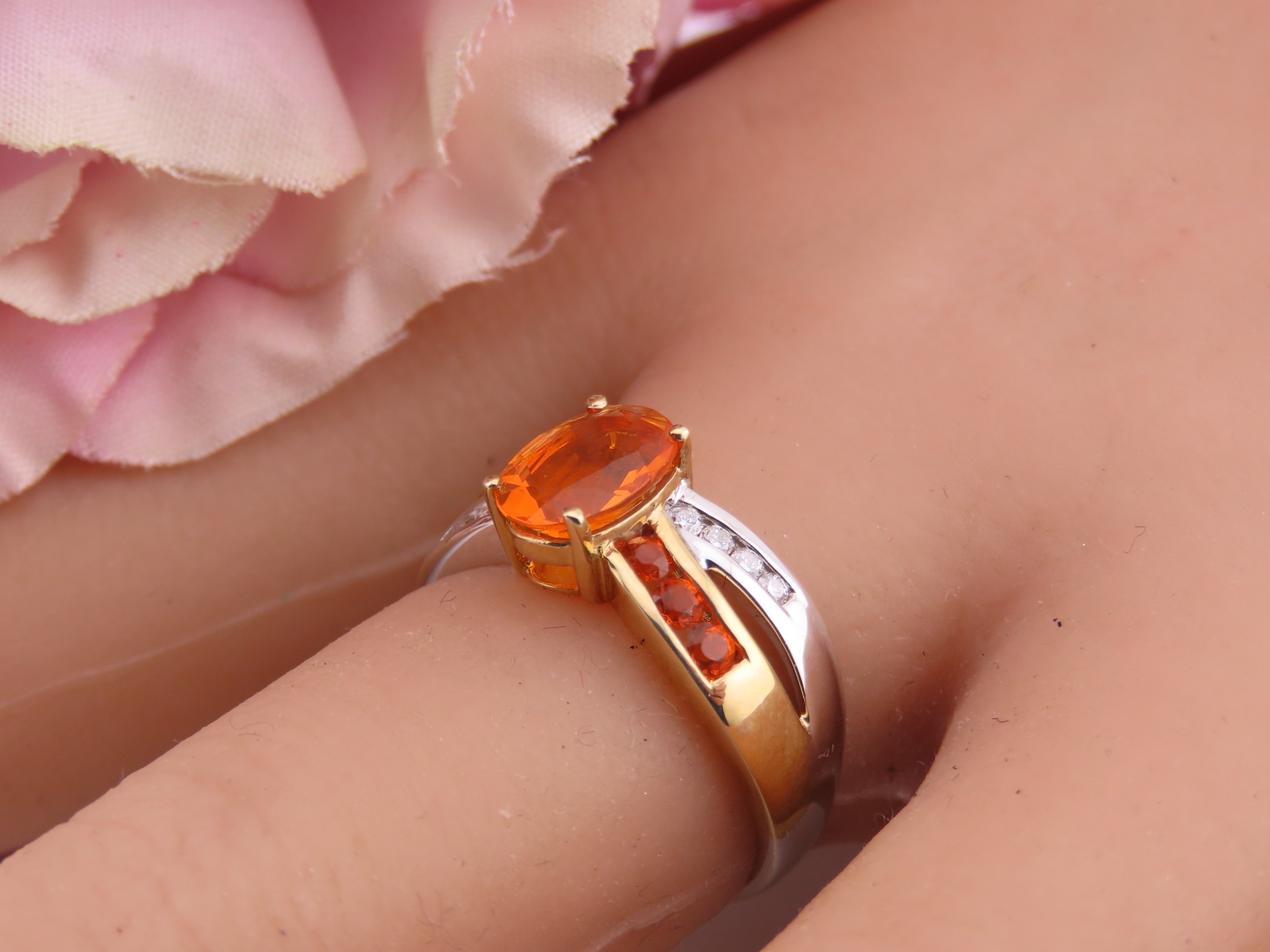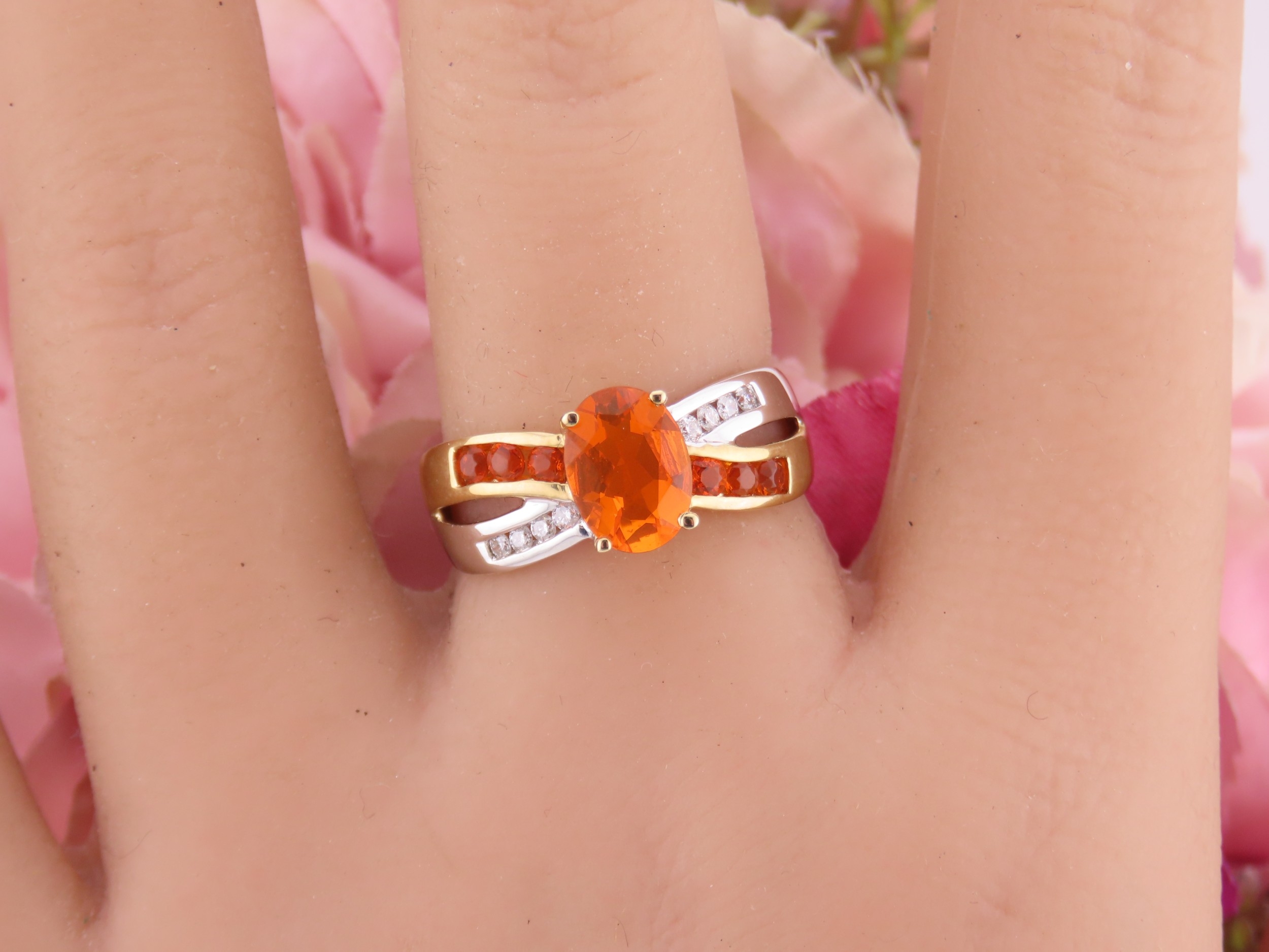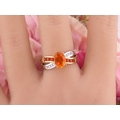 A 9ct yellow and white gold ring set with an oval fire opal accented by small brilliant cut diamonds to the shoulders. Ring size M. Gross weight 2.9 grams.