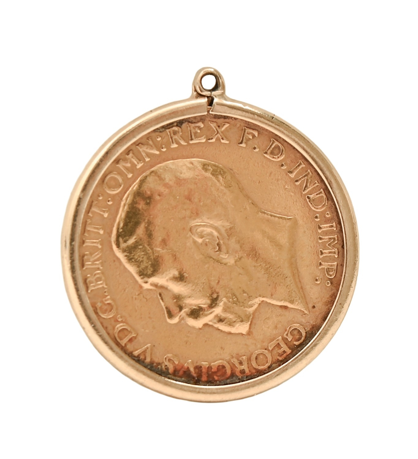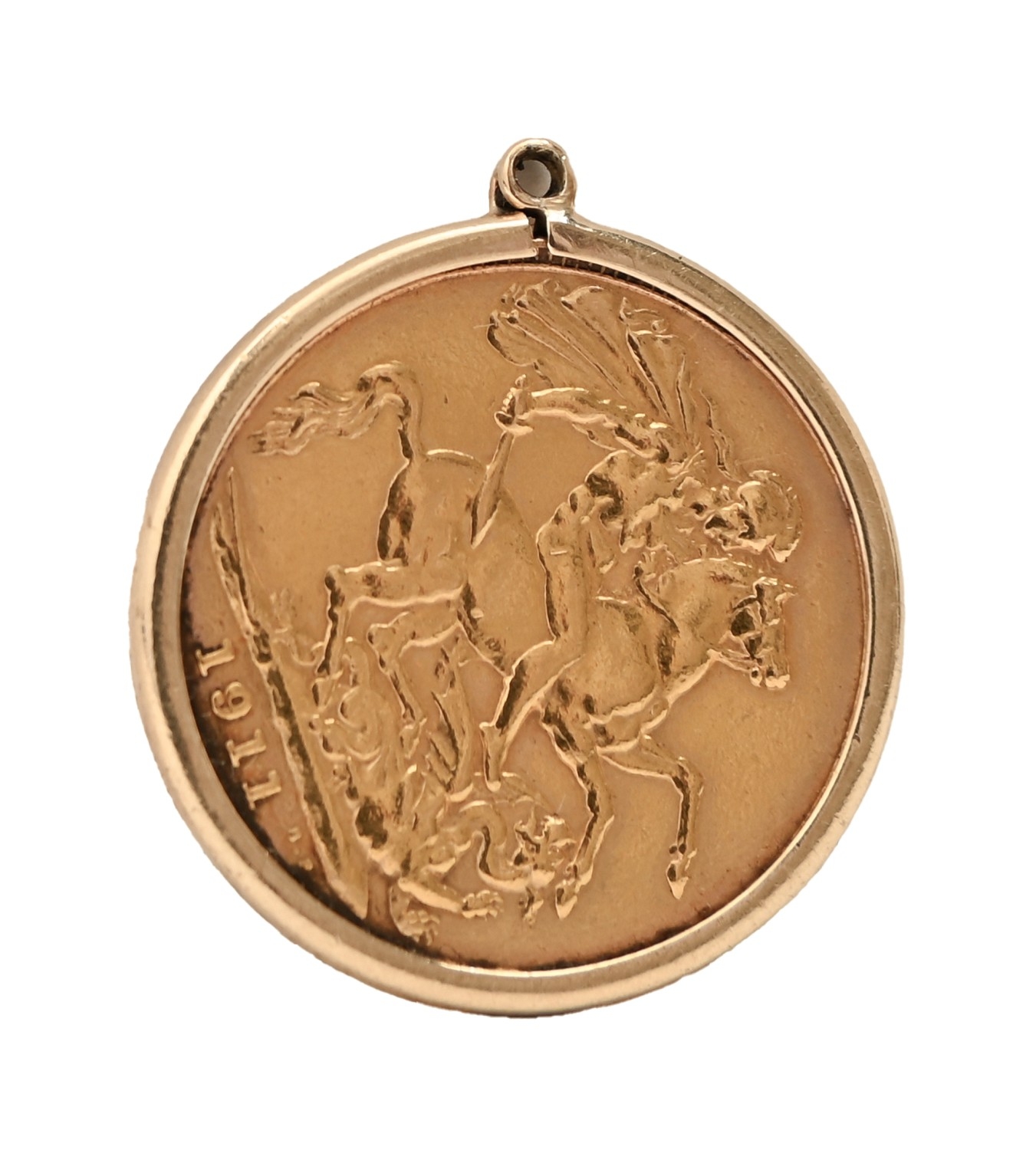 Gold coin. Sovereign 1911, mounted in gold, 8.8g