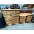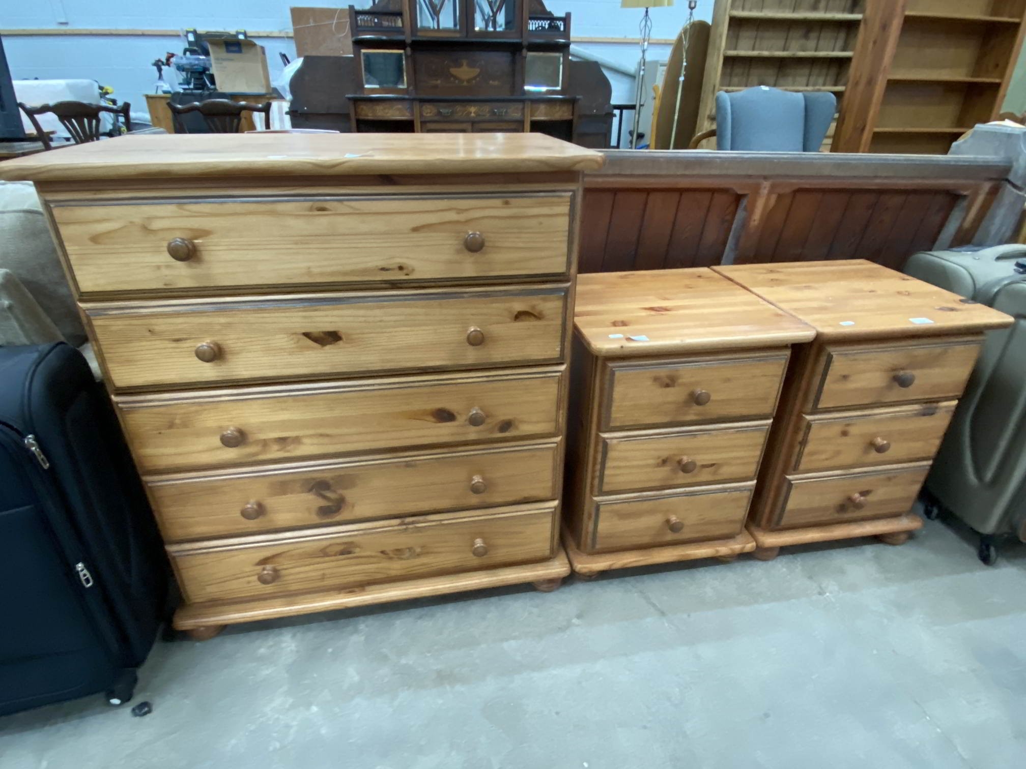 Pine five drawer chest 94H 83W 45D and a pair of matching three drawer pine bedside chests 62H 45W 45D