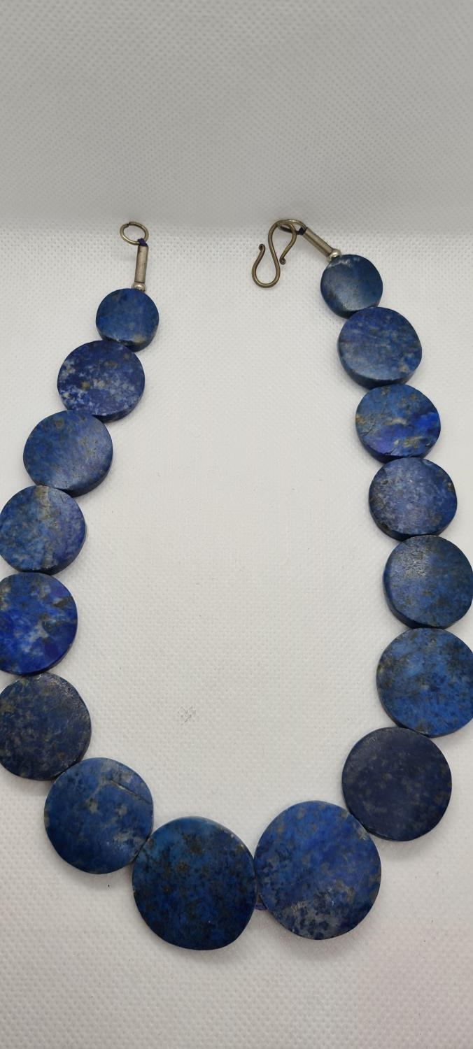 Lapis Lazuli gemstone necklace with silver mounts and clasp.