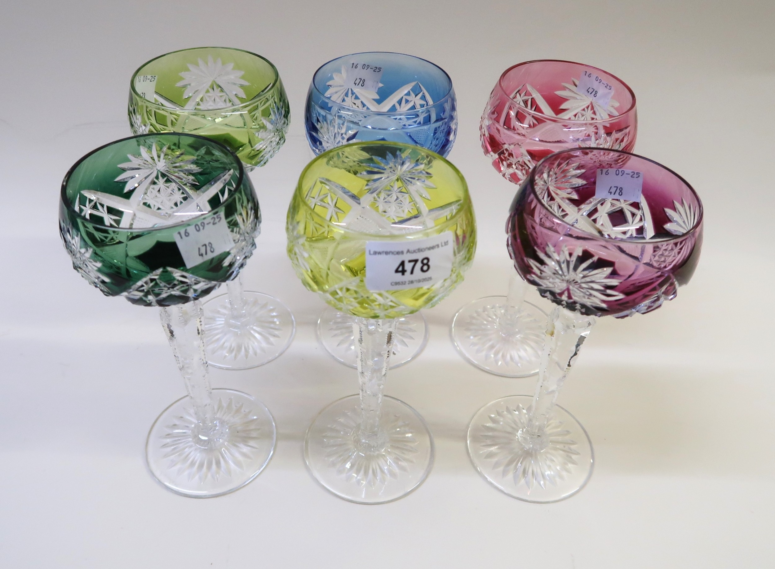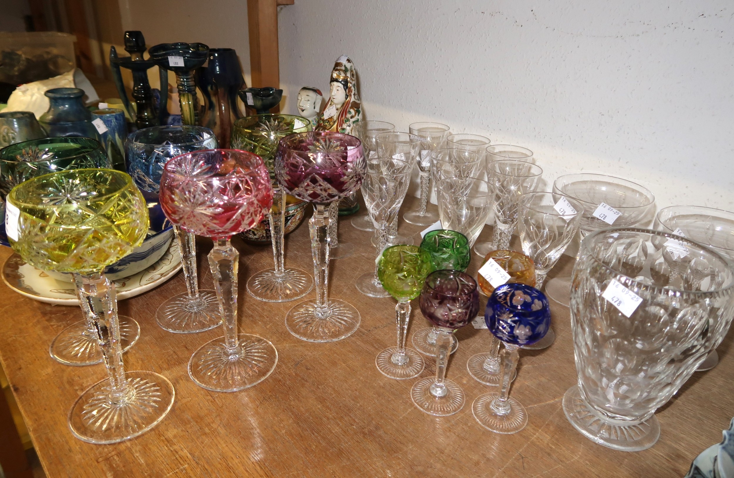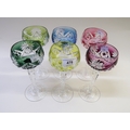 Set of six harlequin coloured overlay Hock glasses, five similar smaller glasses and a small quantity of other miscellaneous glassware