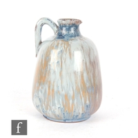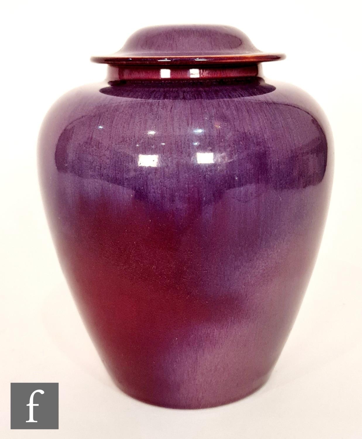 Ashby Potters Guild - An early 20th Century Arts and Crafts vase and cover, the tapering body decorated in a tonal purple with fissuring, clouding and curtains showing a deep red beneath, the lid of shallow domed form decorated in a similar glaze, impressed oval mark, height 19cm, S/D.