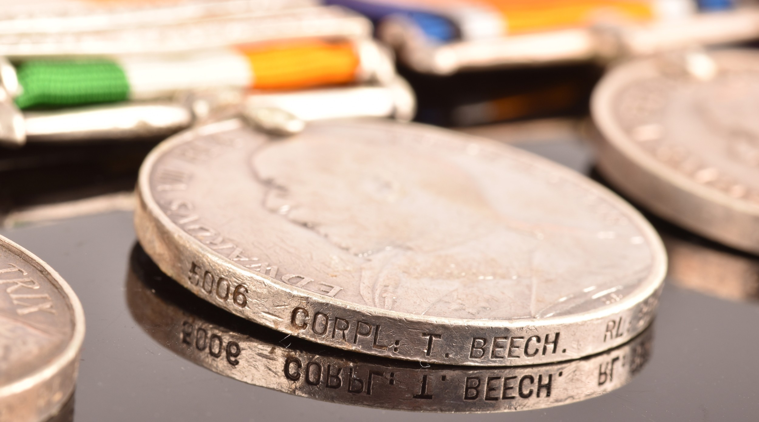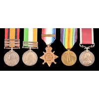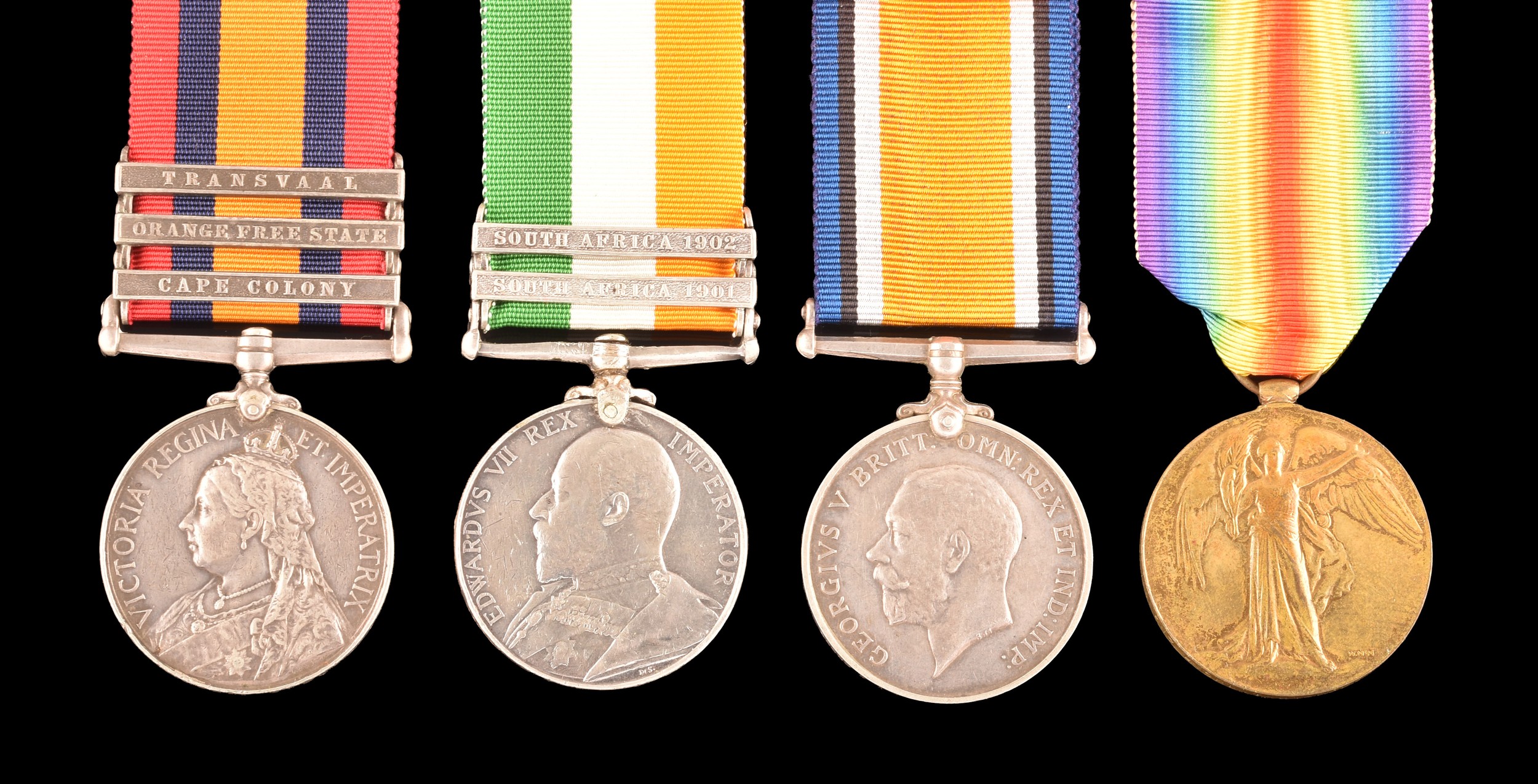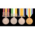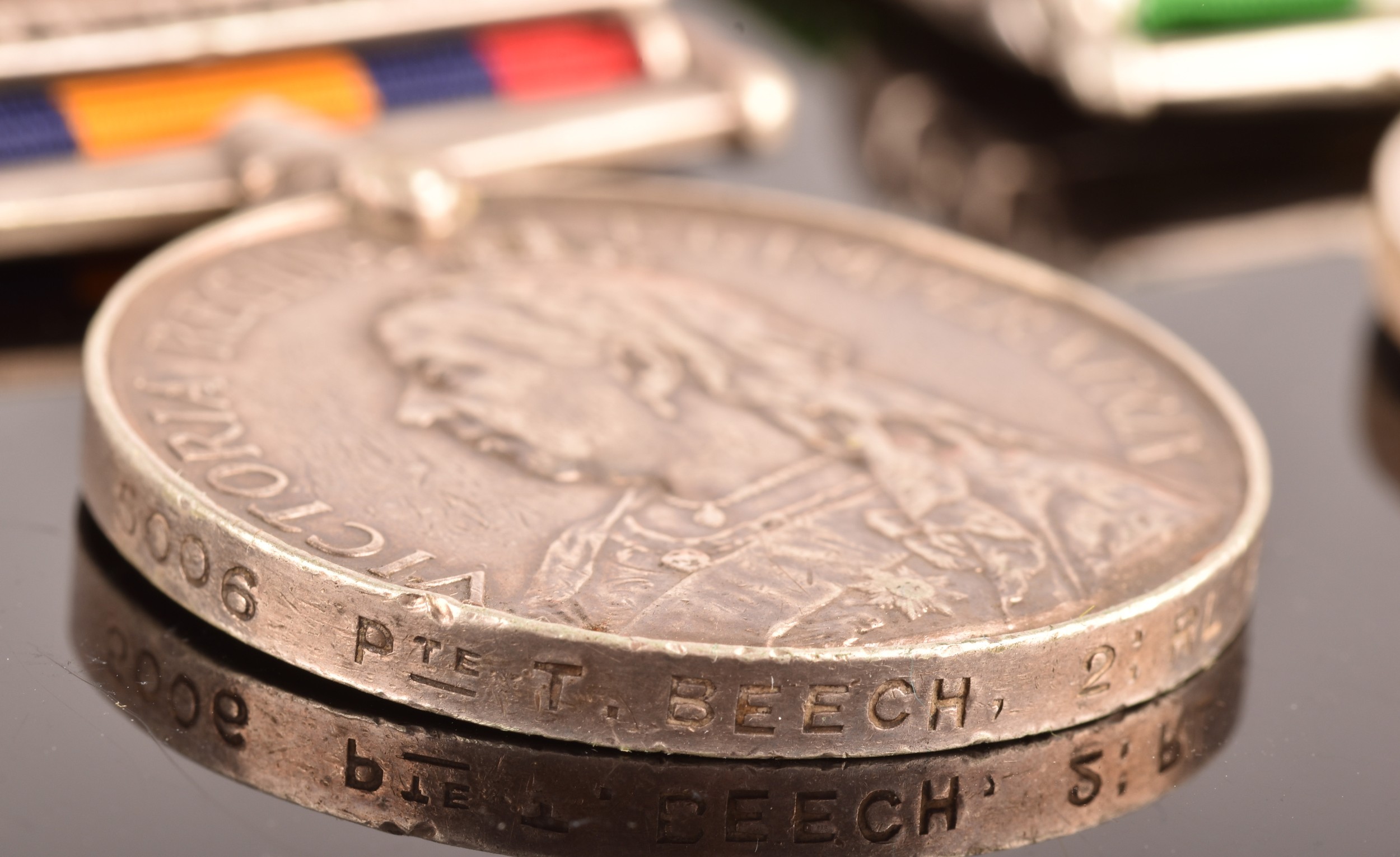 A Boer and Great War four medal group awarded to: 5006 Private T. Beech Berkshire and Bedfordshire Regiments. Comprising: a Queen’s South Africa QSA medal with 3 clasps Cape Colony, Orange Free State, Transvaal (5006 Pte. T. Beech 2: Rl: Berks: Regt); a King's South Africa KSA medal with 2 clasps South Africa 1901 and South Africa 1902 (5006 Corpl. T. Beech Rl: Berks: Regt); the British War Medal (36587 A. Cpl. T. J. Beech Bedf. R.) and the Victory Medal (36587 A. Cpl. T. J. Beech Bedf. R.).