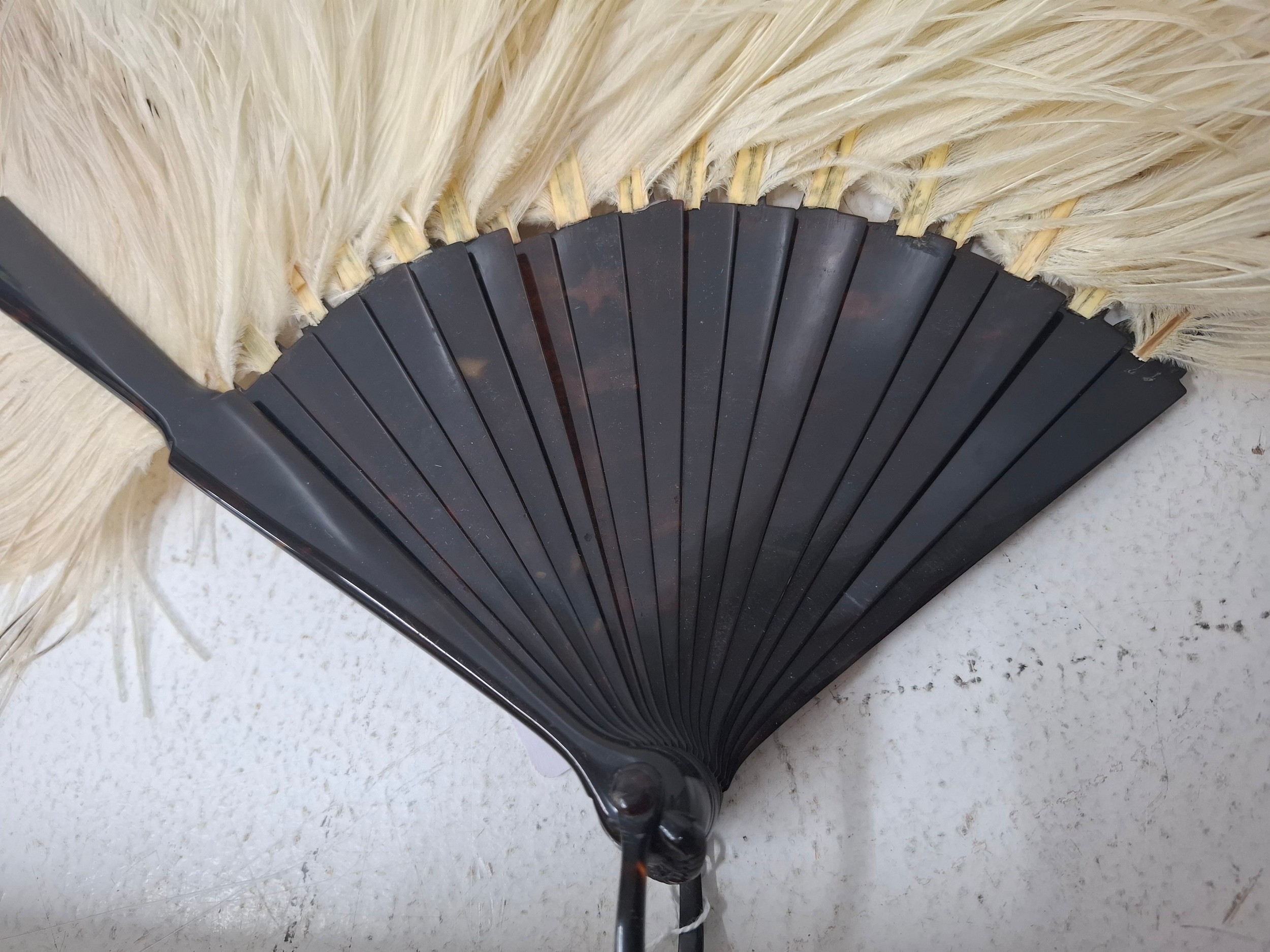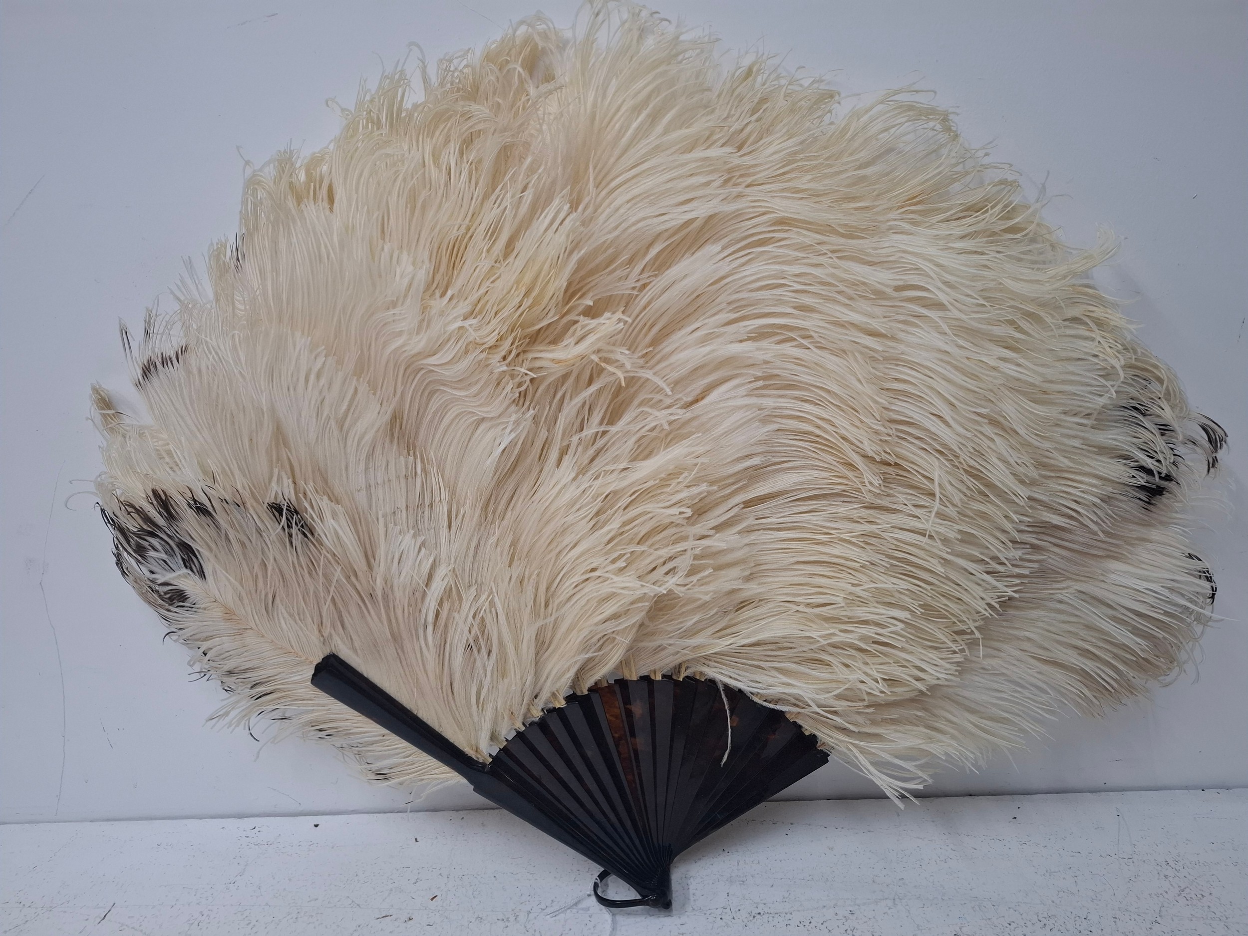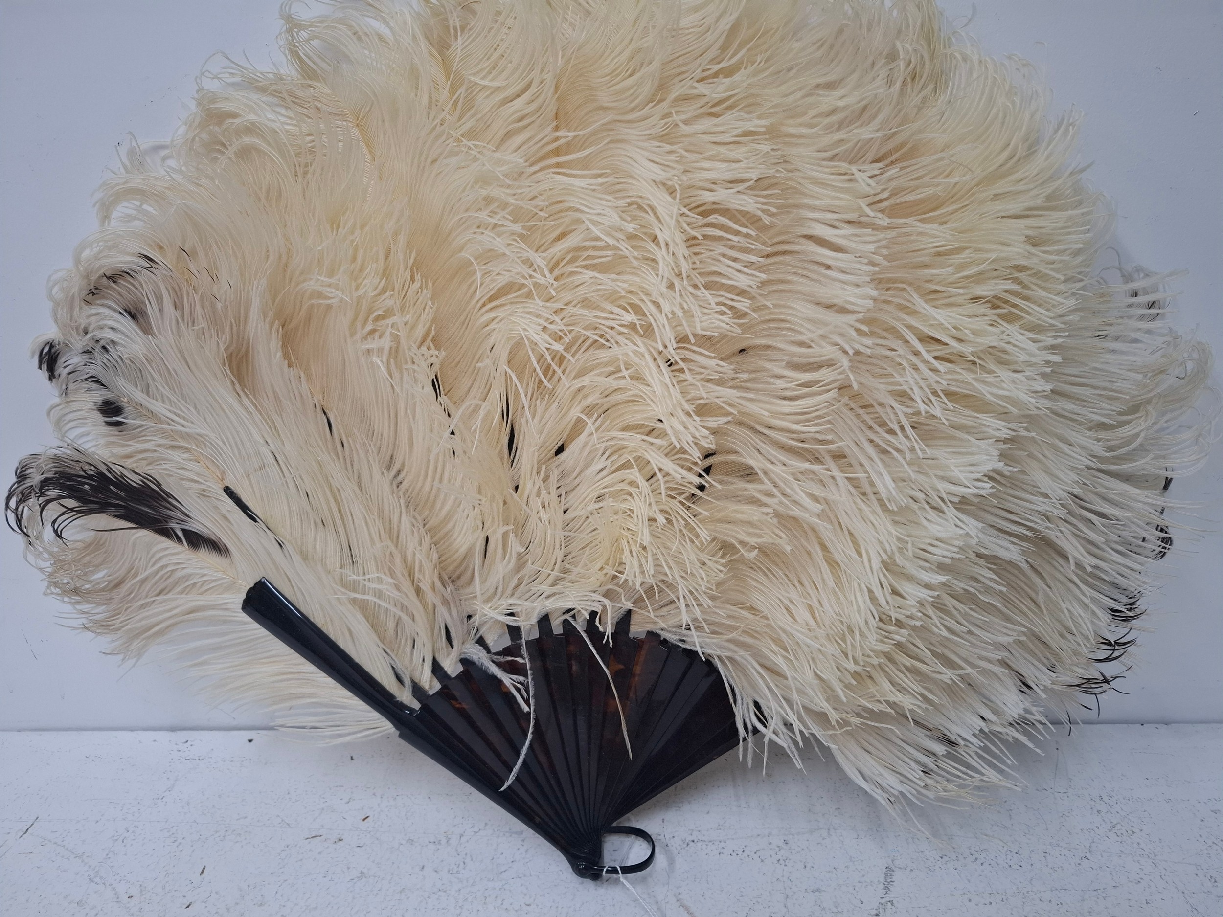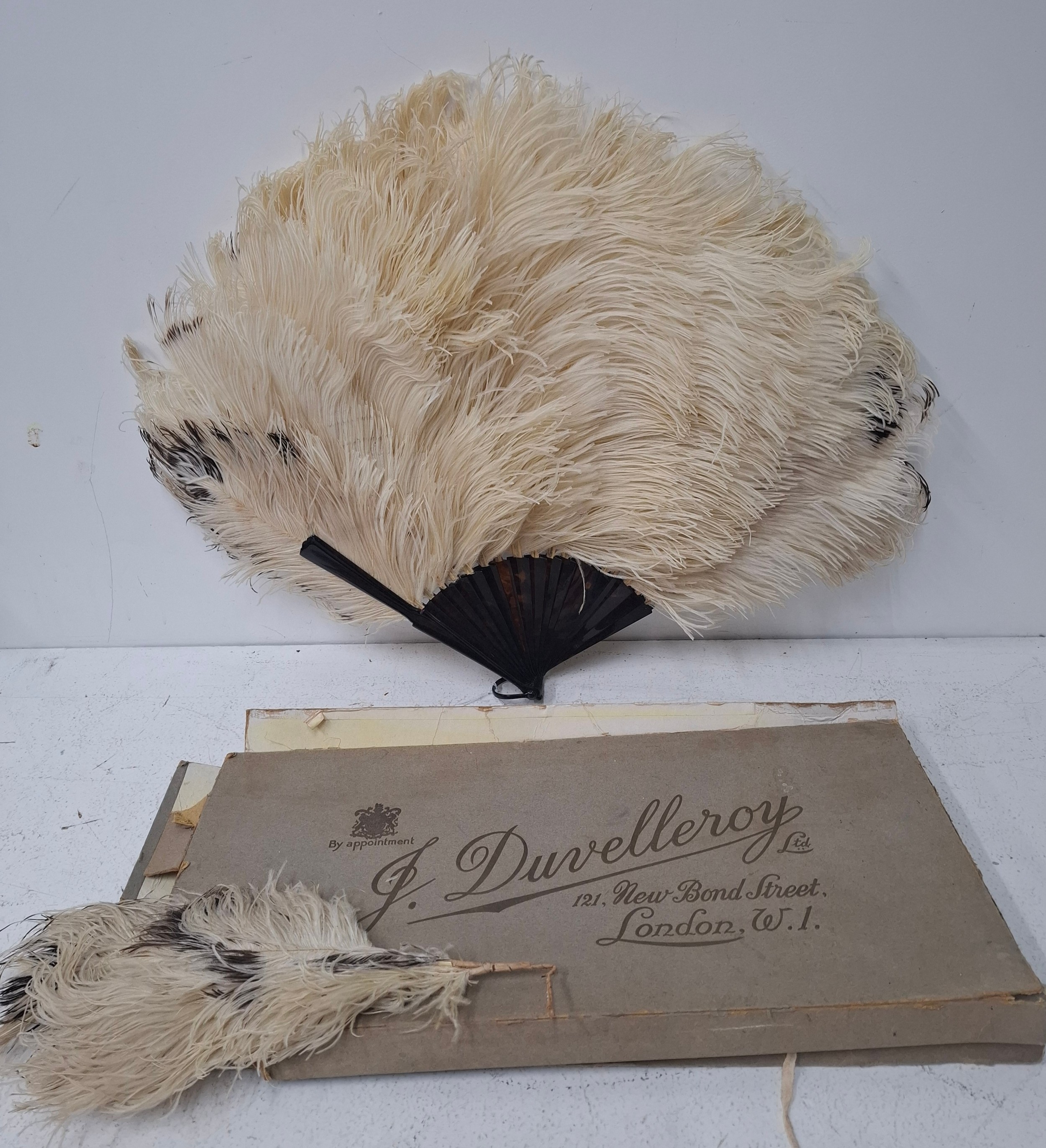 An early 20th Century tortoiseshell and cream ostrich feather fan having 2 guards and 18 sticks together with an original Duvelleroy, Bond Street fan box