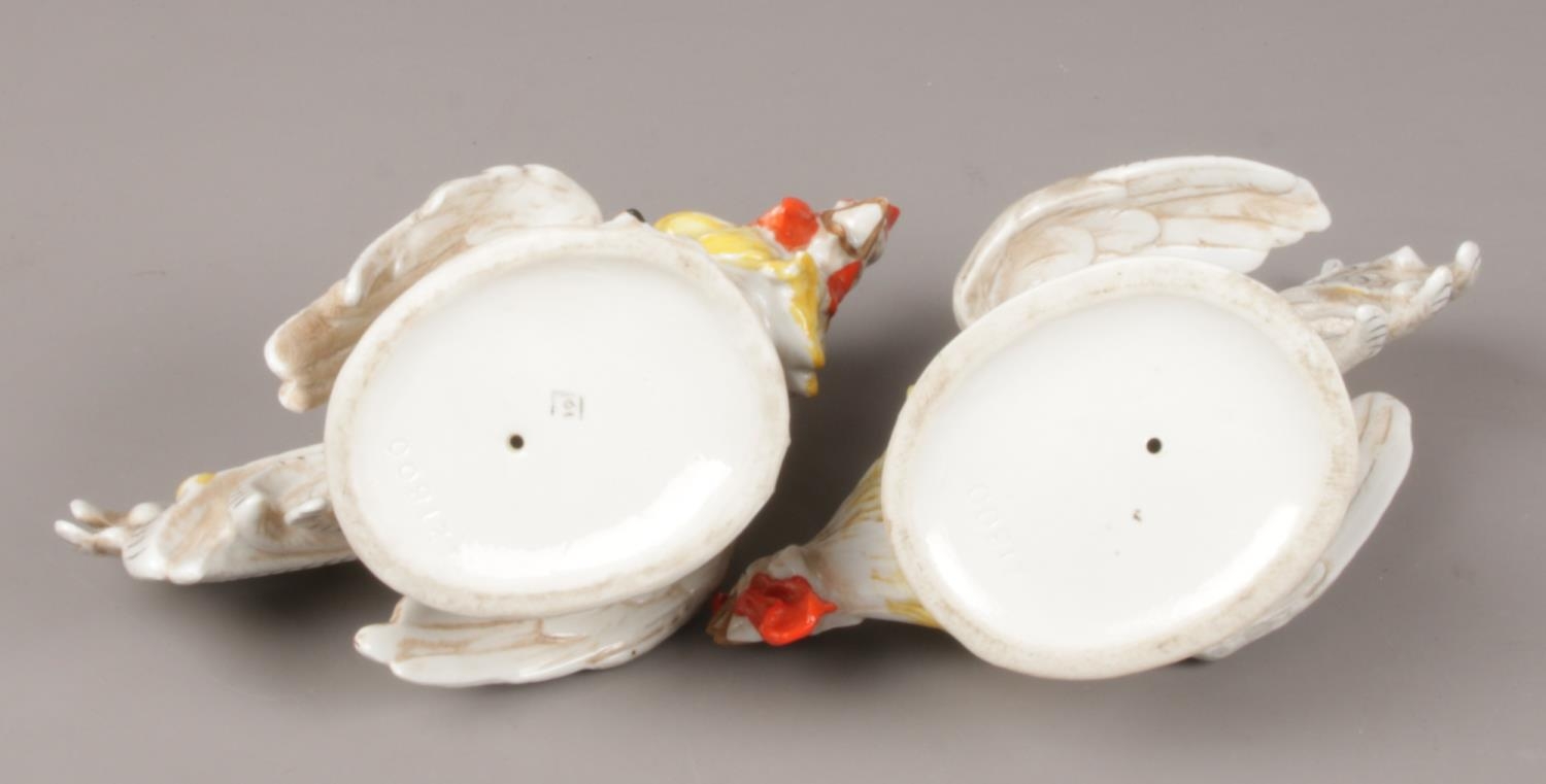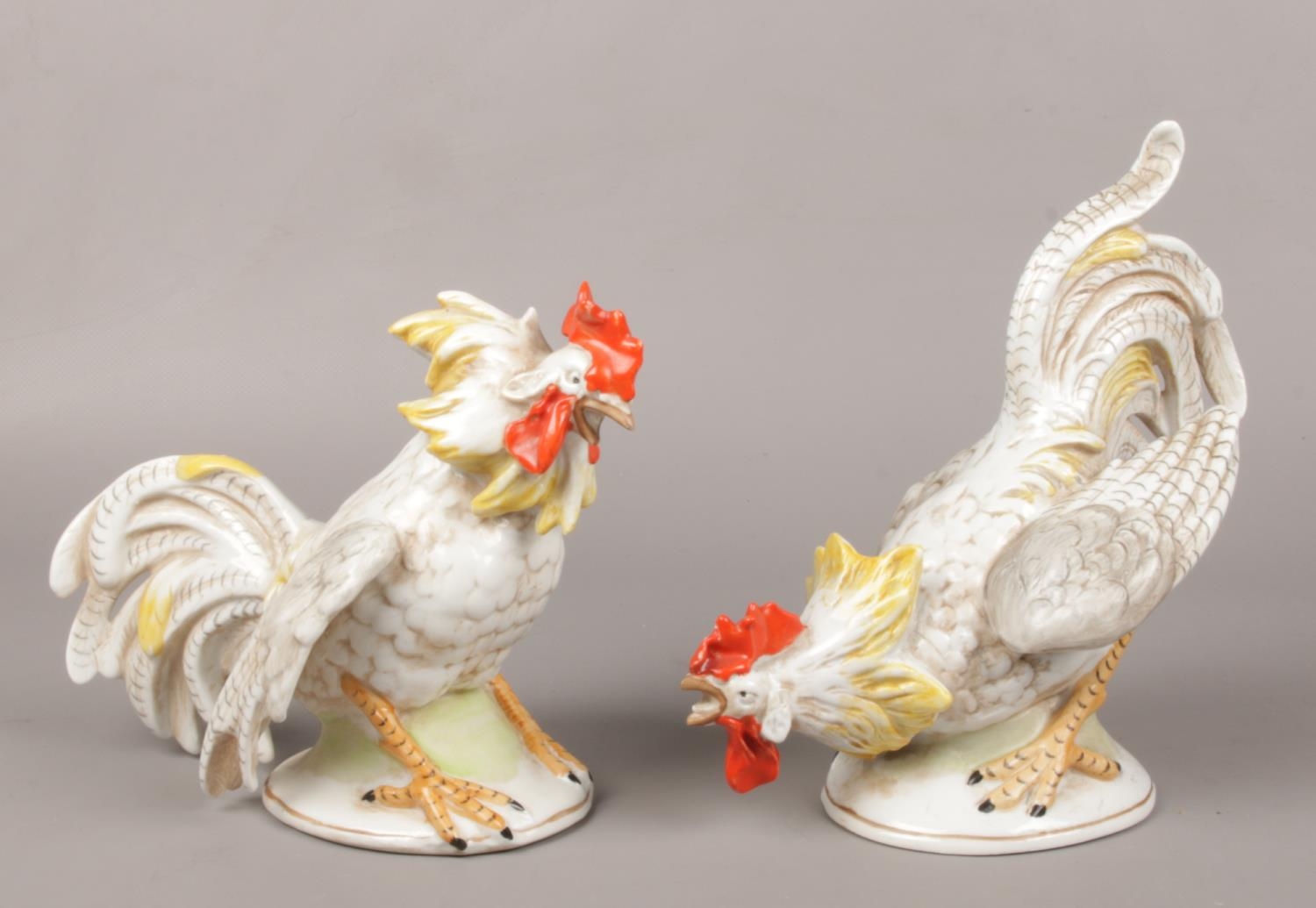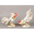 A pair of mid 20th century Continental porcelain models of cockerels decorated in coloured enamels. Impressed numbers to the underside, 19cm.
