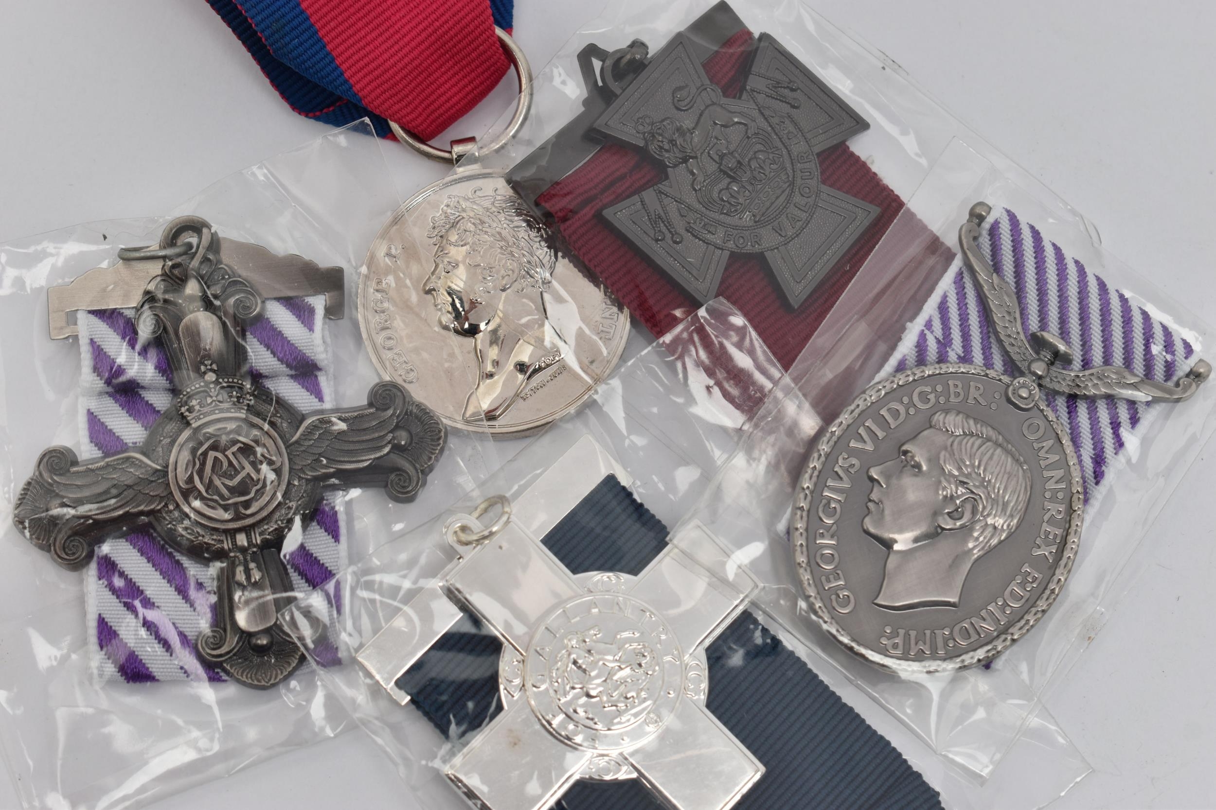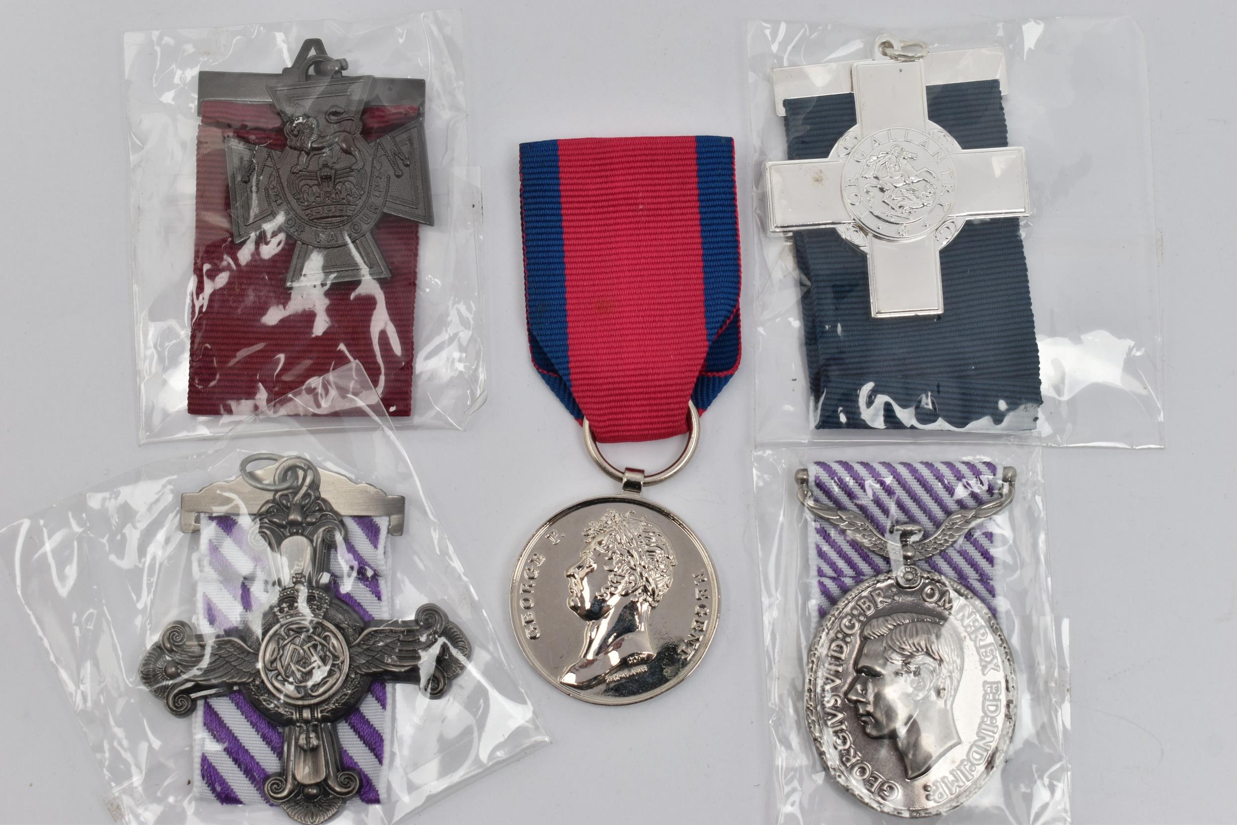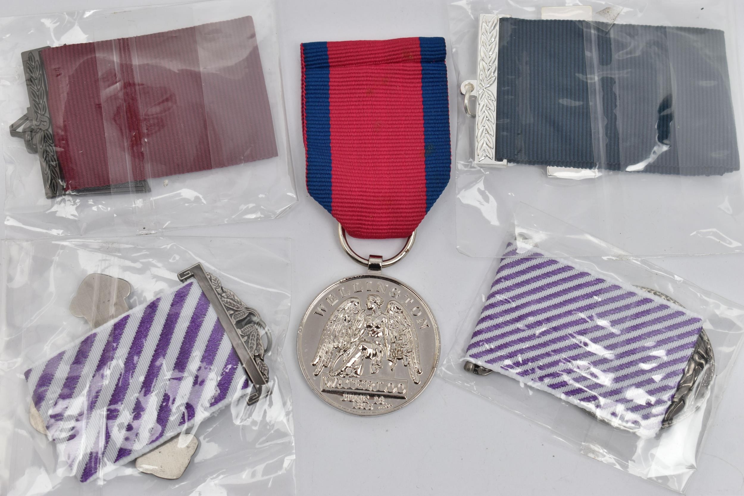 FIVE REPLICA MEDALS WITH RIBBONS