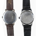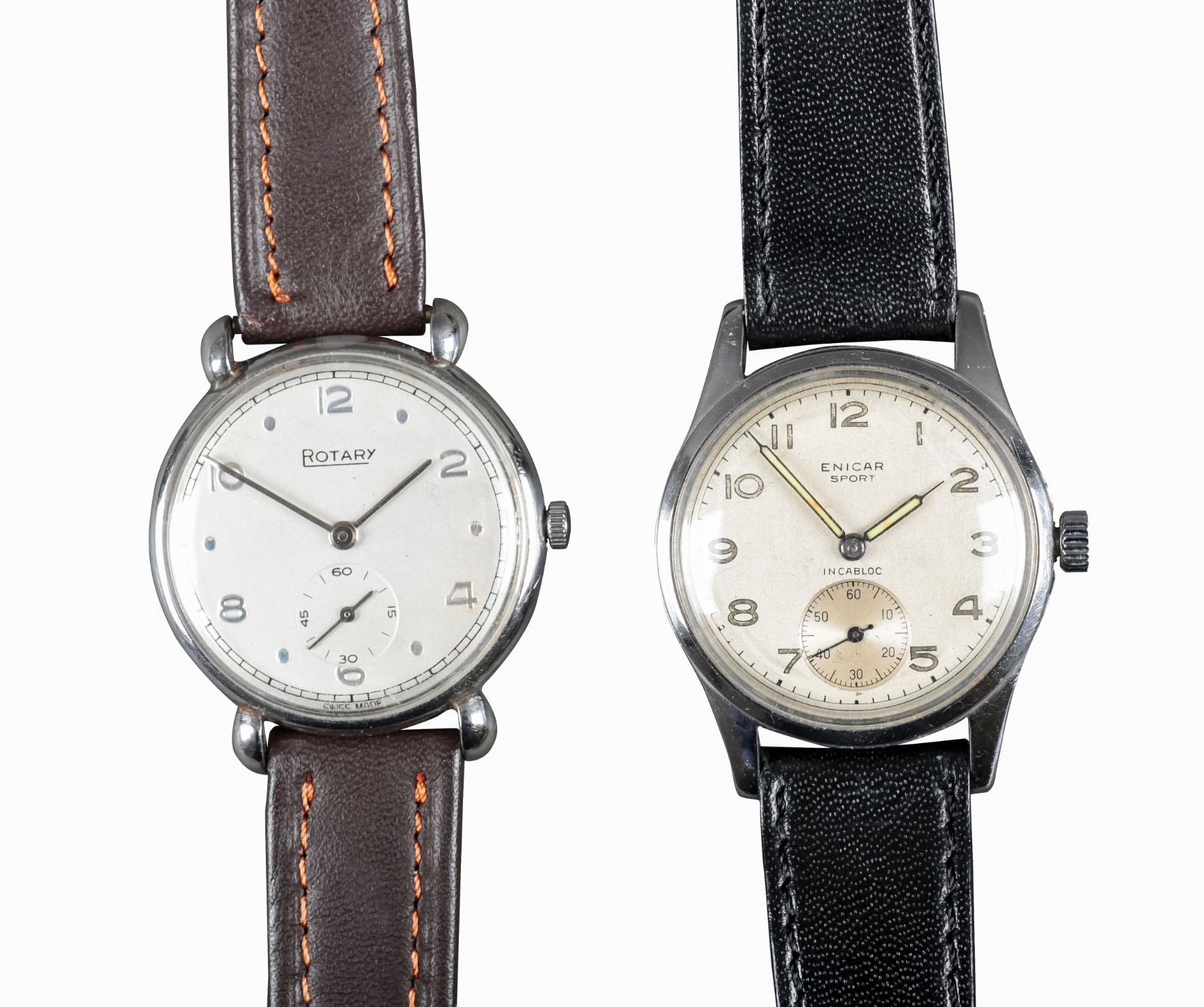 with manual wind movement, silver dial, black luminous Arabic numerals, dark steel luminous hands, with subsidiary seconds dial, on a black leather strap, circa 1940s, case diameter approx. 32mm; together with a Rotary stainless steel wristwatch (2)