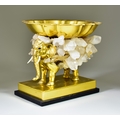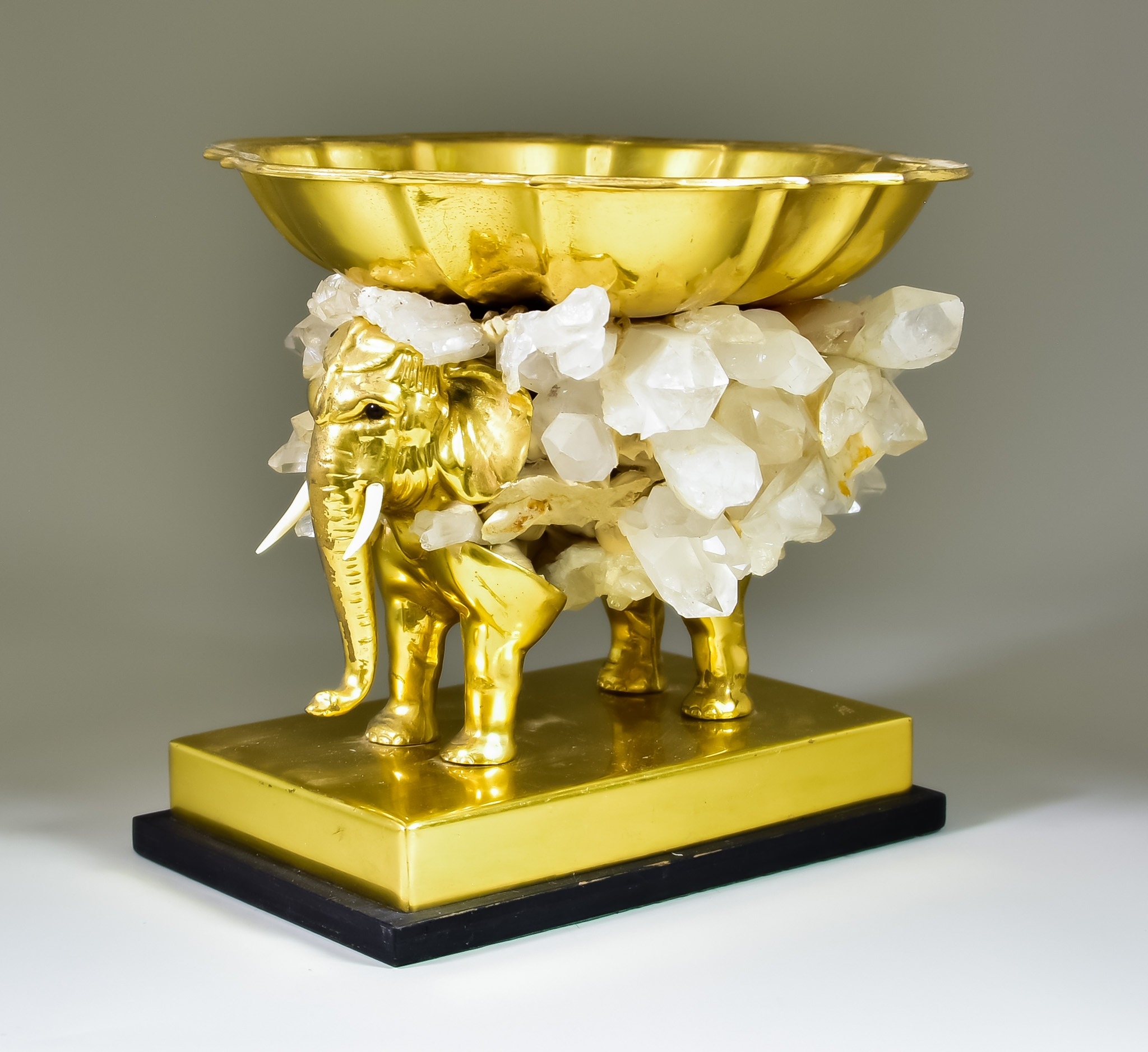 An Unusual Gold Coloured Plated Metal Elephant, supporting a gold coloured plated metal tray, the body of the elephant formed of numerous single terminator crystals on plated metal base, 250mm wide x 230mm high