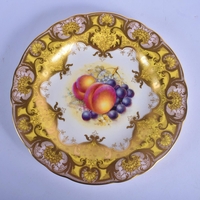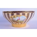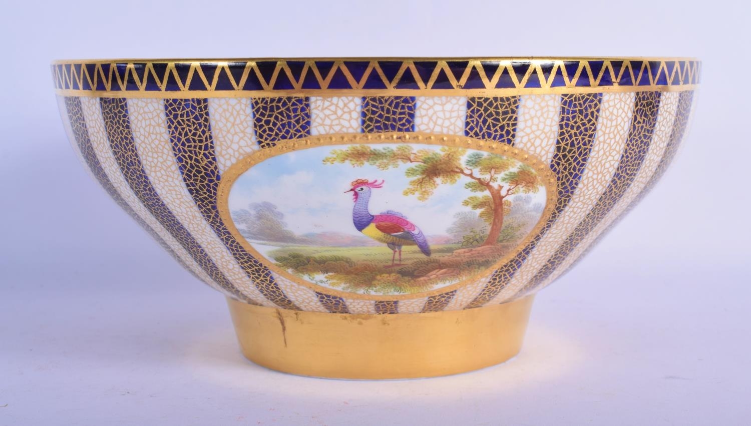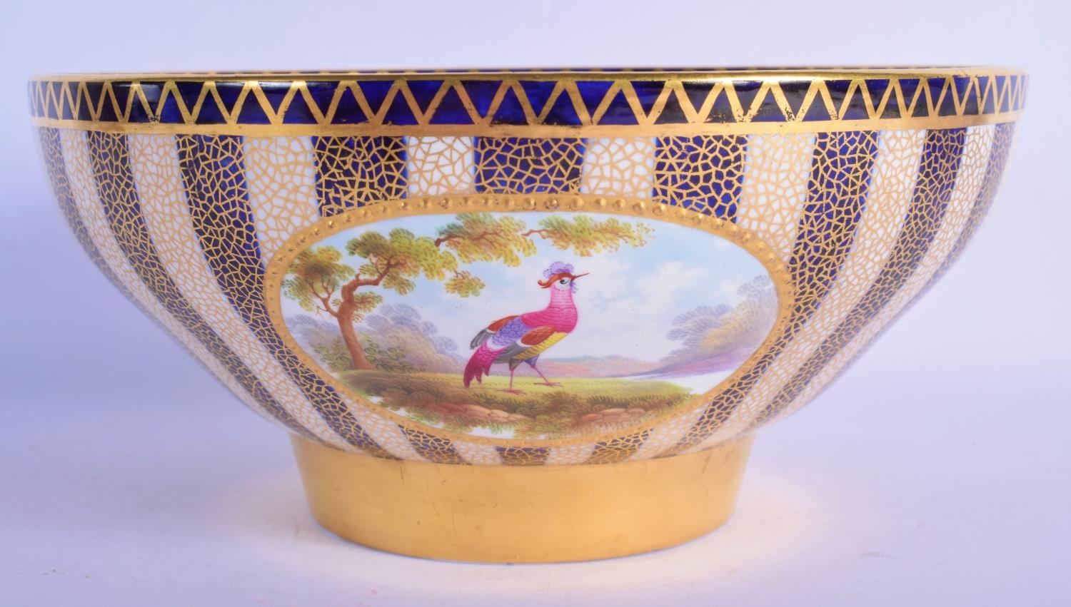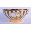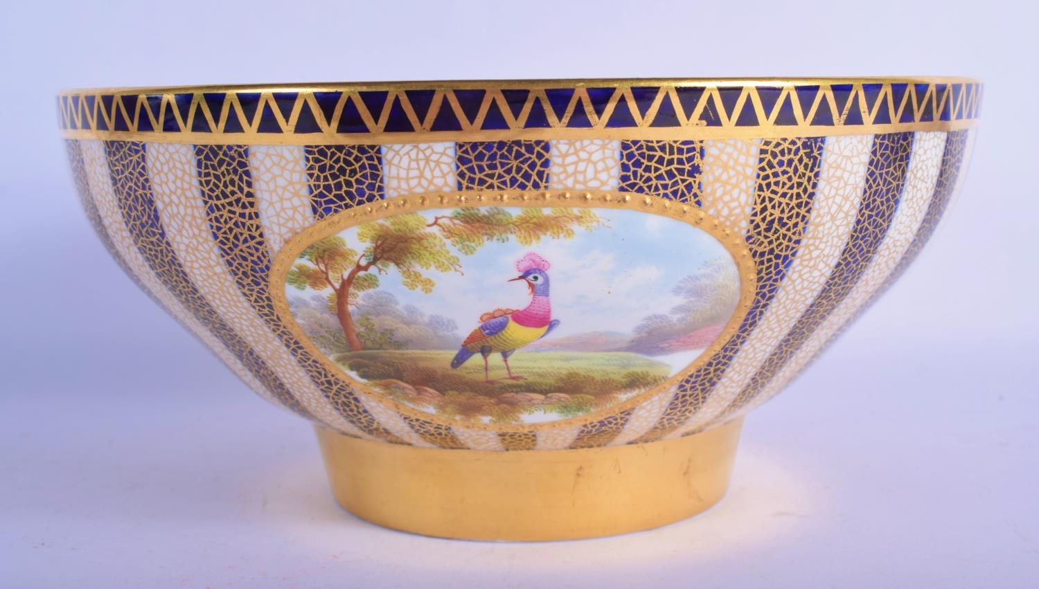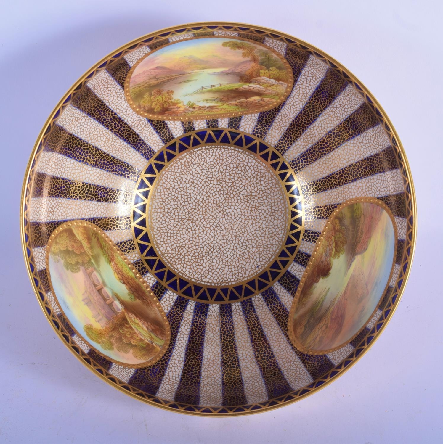 Early 20th c. Aynsley fine bowl with three interior landscape panels and three exterior panels painted with birds between alternating blue and white gilt stripes four panels signed R.J.K. for Richard J. Keeling. 11cm x 23cm