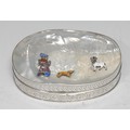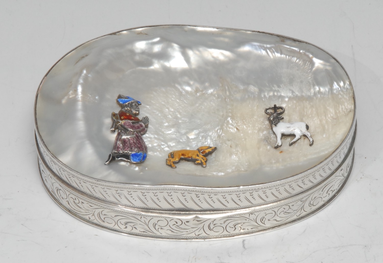 An Austrian silver oval table snuff box, the hinged cover applied in enamel with the Conversion of Placidus, upon a mother of pearl shell ground, the side and base engraved with scrolling foliage, C-scrolls and trellis, 9cm wide, c.1900
