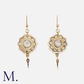A Pair of Antique Diamond Earrings in yellow gold, set with old cut diamonds weighing over 2.0ct in total. Each earring centred with an old cut diamond of approximately 0.55ct and further diamonds in surround. With enamel detailing.