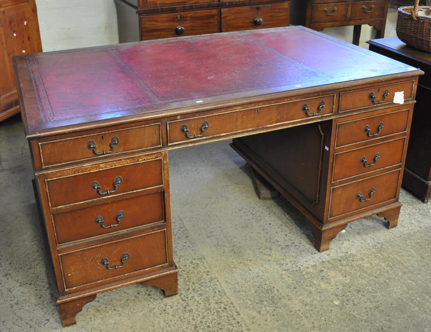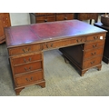 Early 20th Century mahogany knee hole desk with leather inset top and a bank of three drawers to each pedestal on bracket feet.