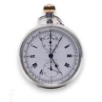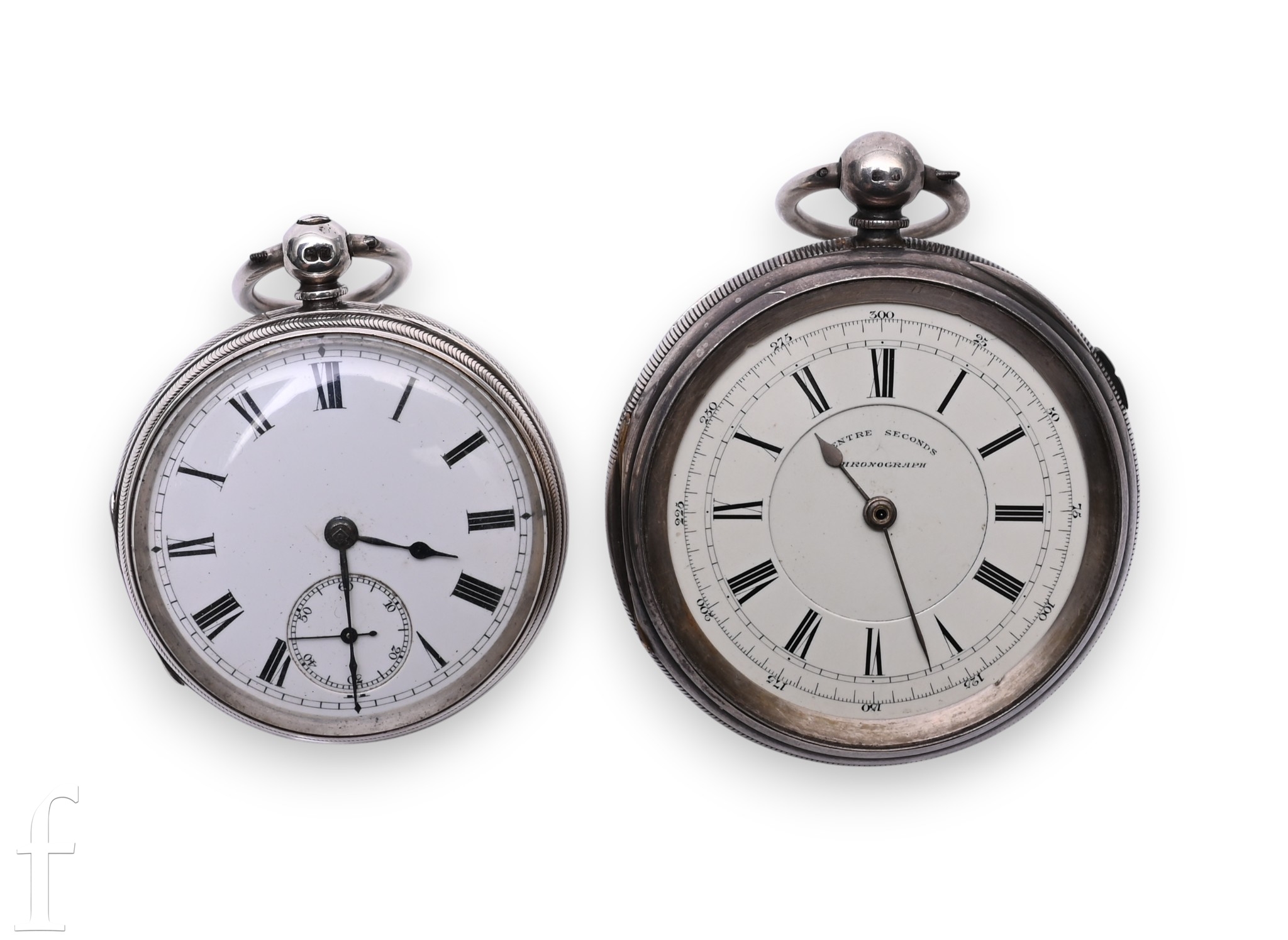 Both movements in working order at time of testing. Both with overall wear and markings commensurate with age and use. Unnamed fusee with heavy wear and rubbing to rear case design. Chronograph with detached later plastic face glass
