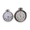 Two silver open face pocket watches, one unnamed with fusee movement, case hallmarked London 1869, the other by J W Reeley & Sons, with centre seconds chronograph, case hallmarked Chester 1886, largest 59mm diameter, total weight 288g. (2)