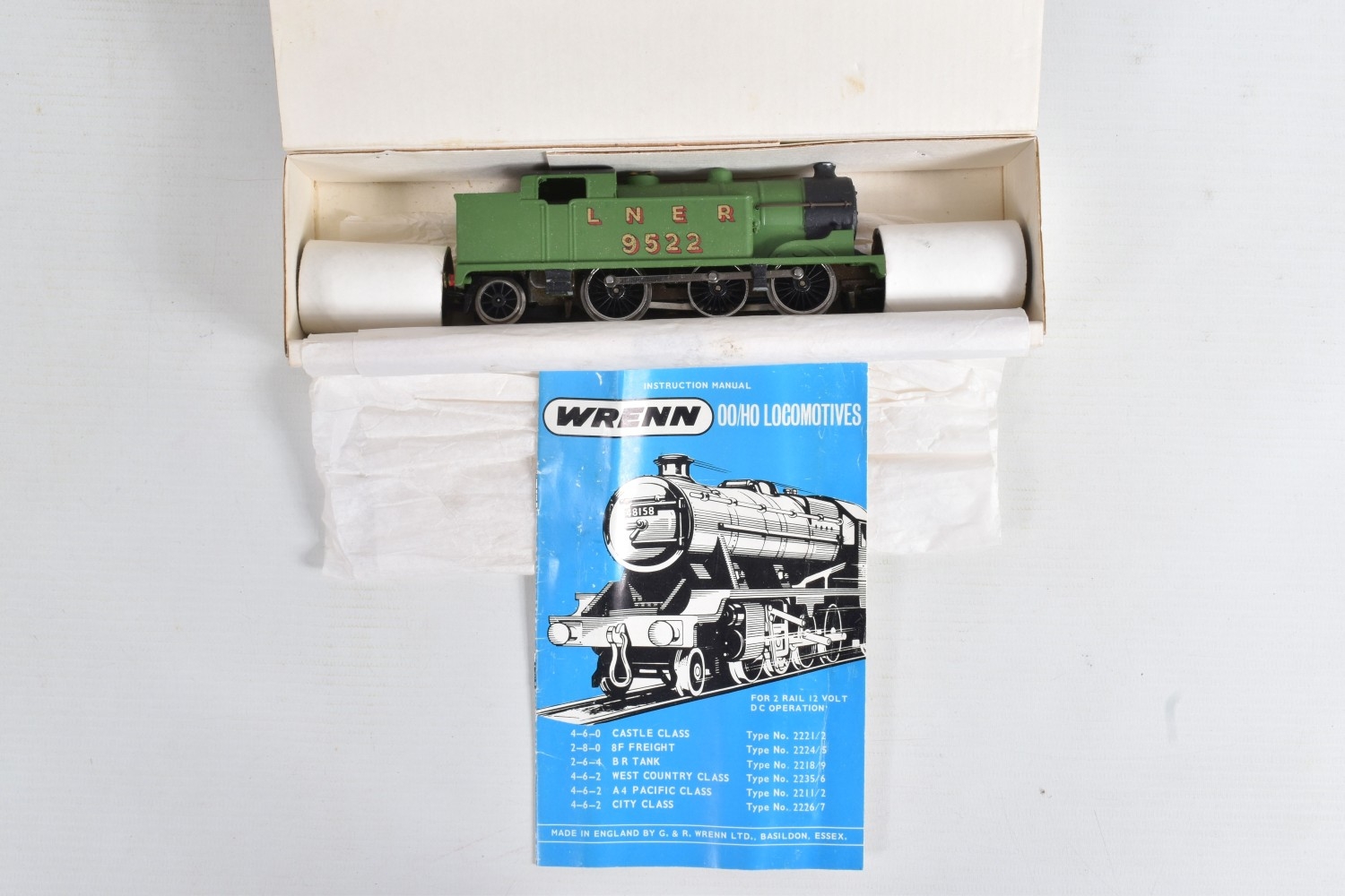 TWO BOXED WRENN RAILWAYS OO GAUGE TANK LOCOMOTIVES, class N2 0-6-2T No.9522, L.N.E.R. green livery (W2217) and class 4MT 2-6-4T No.2679, L.M.S. lined maroon livery (W2219), both appear complete and in fairly good with some minor paint loss and wear, slightly worse on class 4MT, both boxes with packing pieces and instructions but have damage, marking and wear, together with a copy of the 4th edition Wrenn Railways handbook, which has some damage and wear (3)