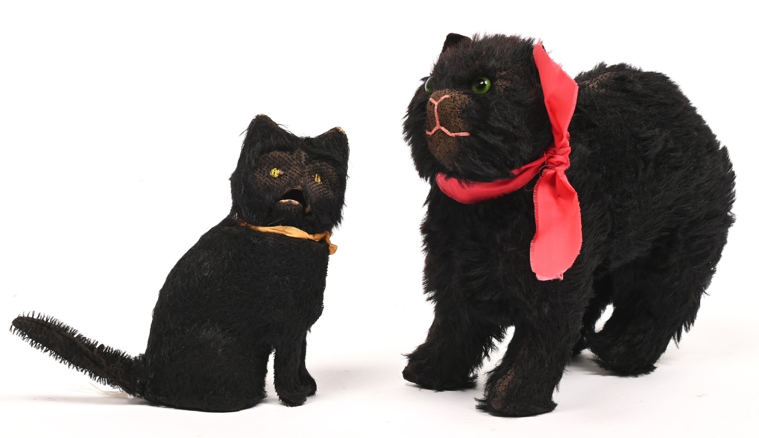 Vintage toys. A clockwork seated black cat, c1930s, 16cm h, and a contemporary stuffed mohair black cat, with glass eyes and felt ears, 25cm l (2)