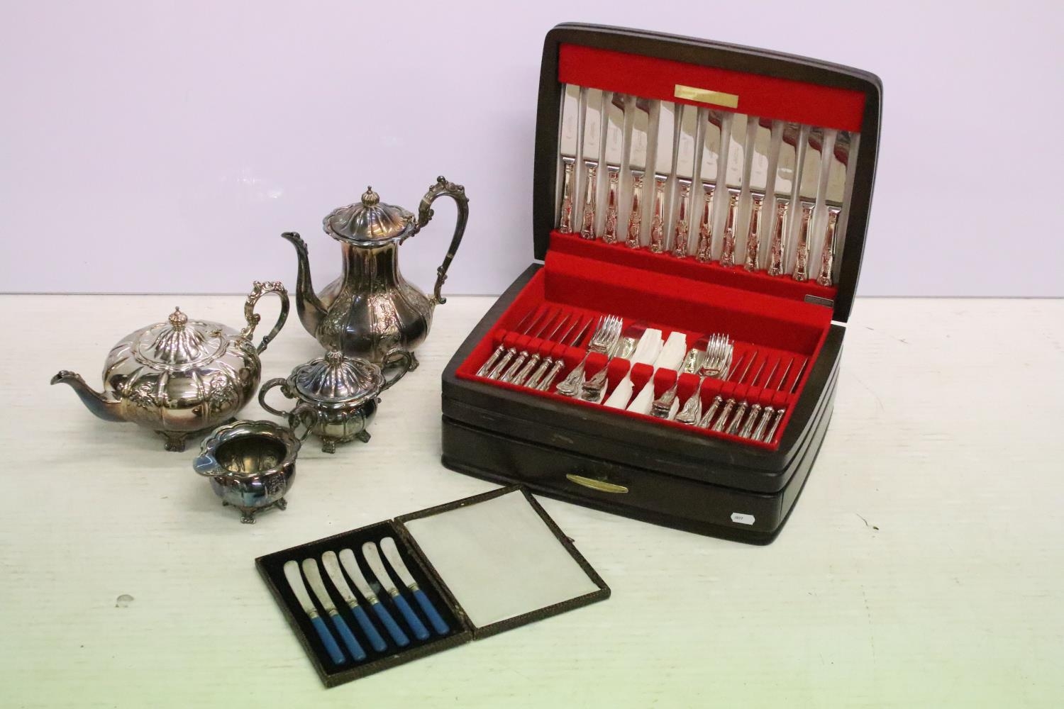 Windsor Challis (Silver) Ltd twelve setting canteen of silver plated Kings pattern cutlery, together with a four piece silver plated tea set and a cased set of knives