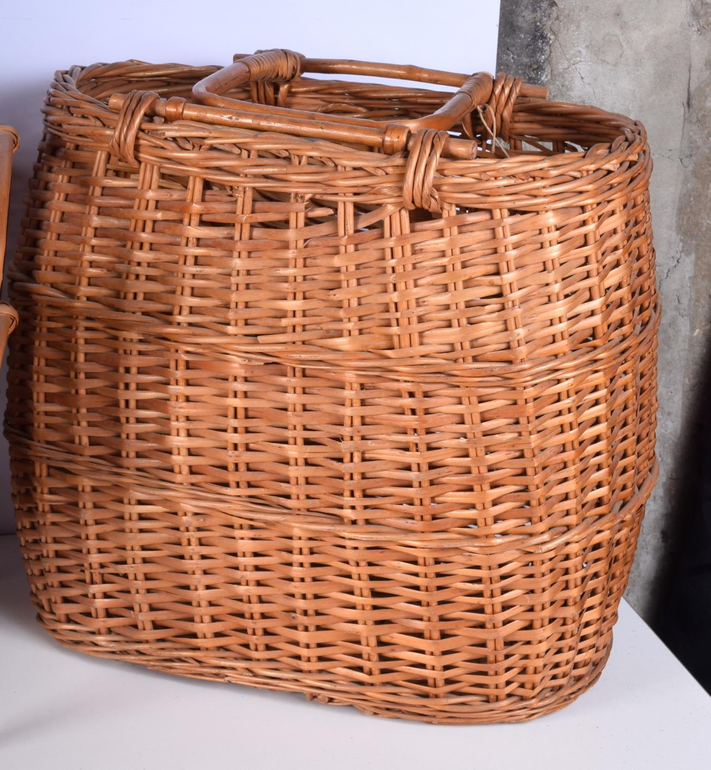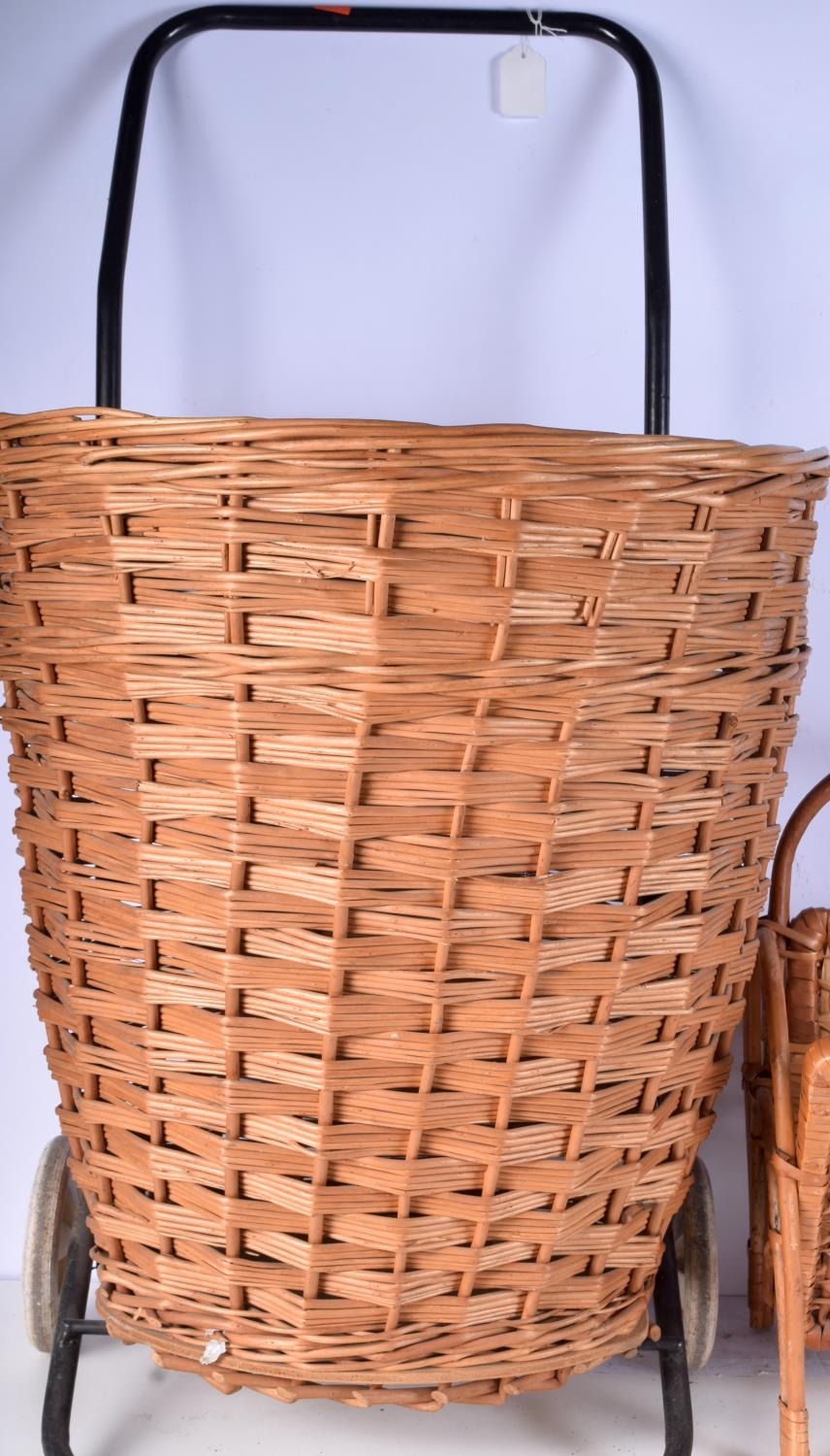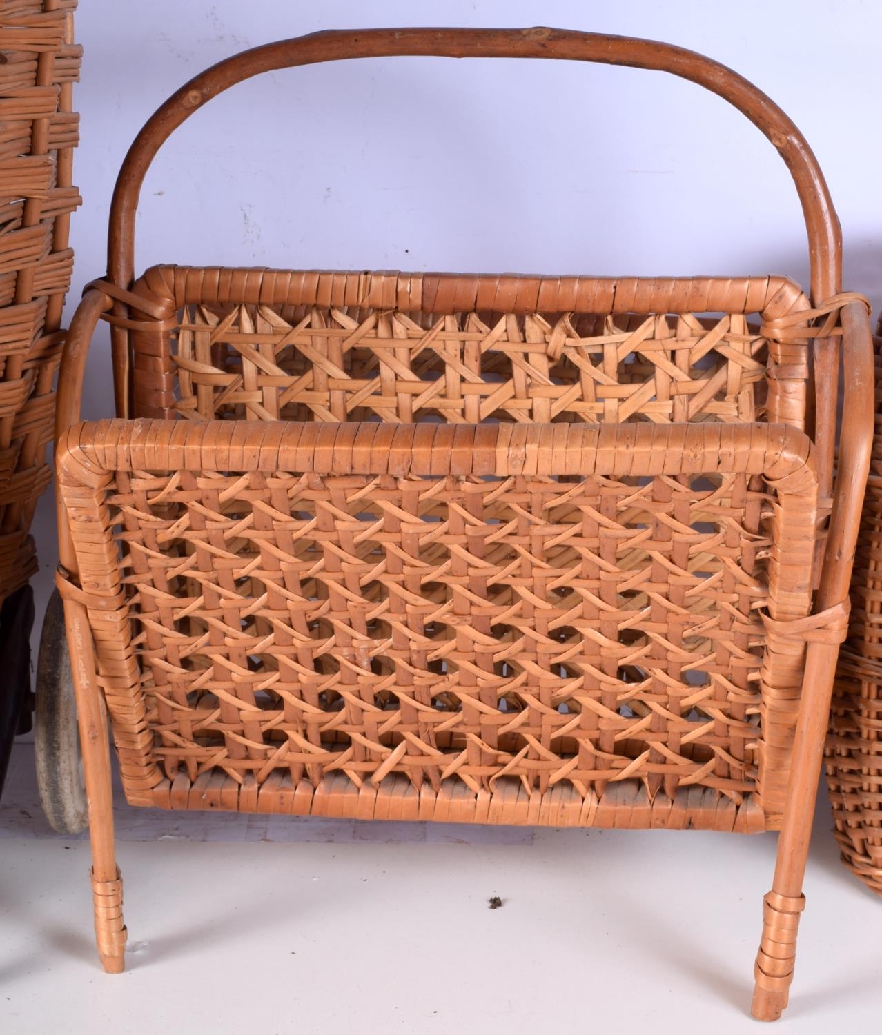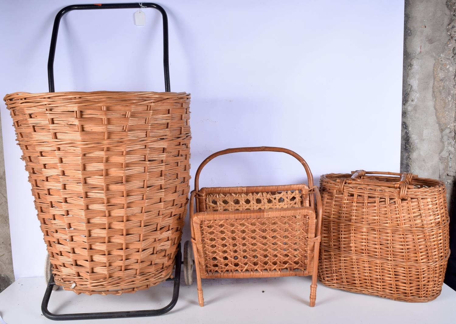 A wicker shopping trolley together with a basket and a magazine rack largest 92cm (3).