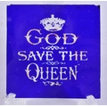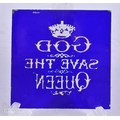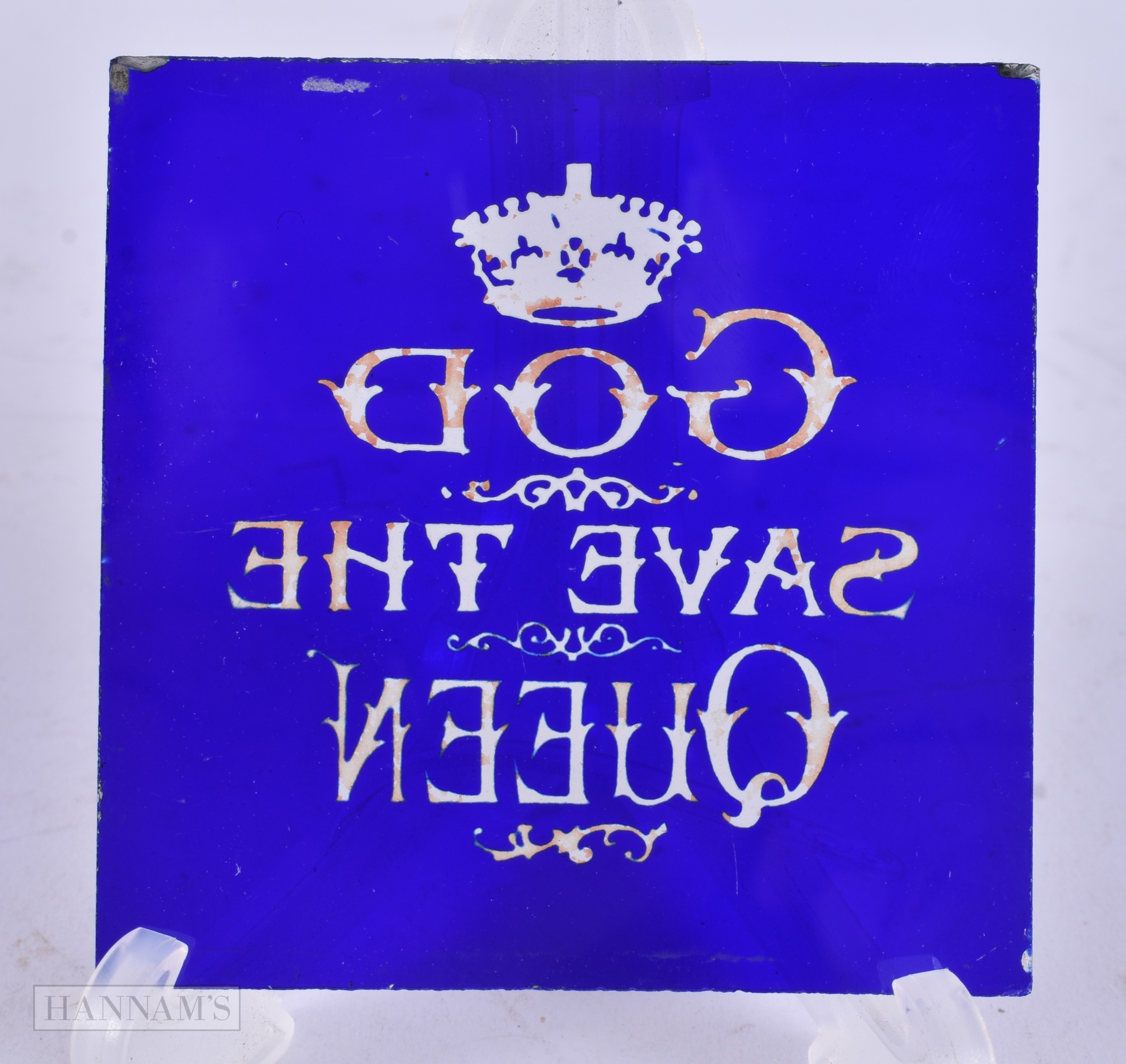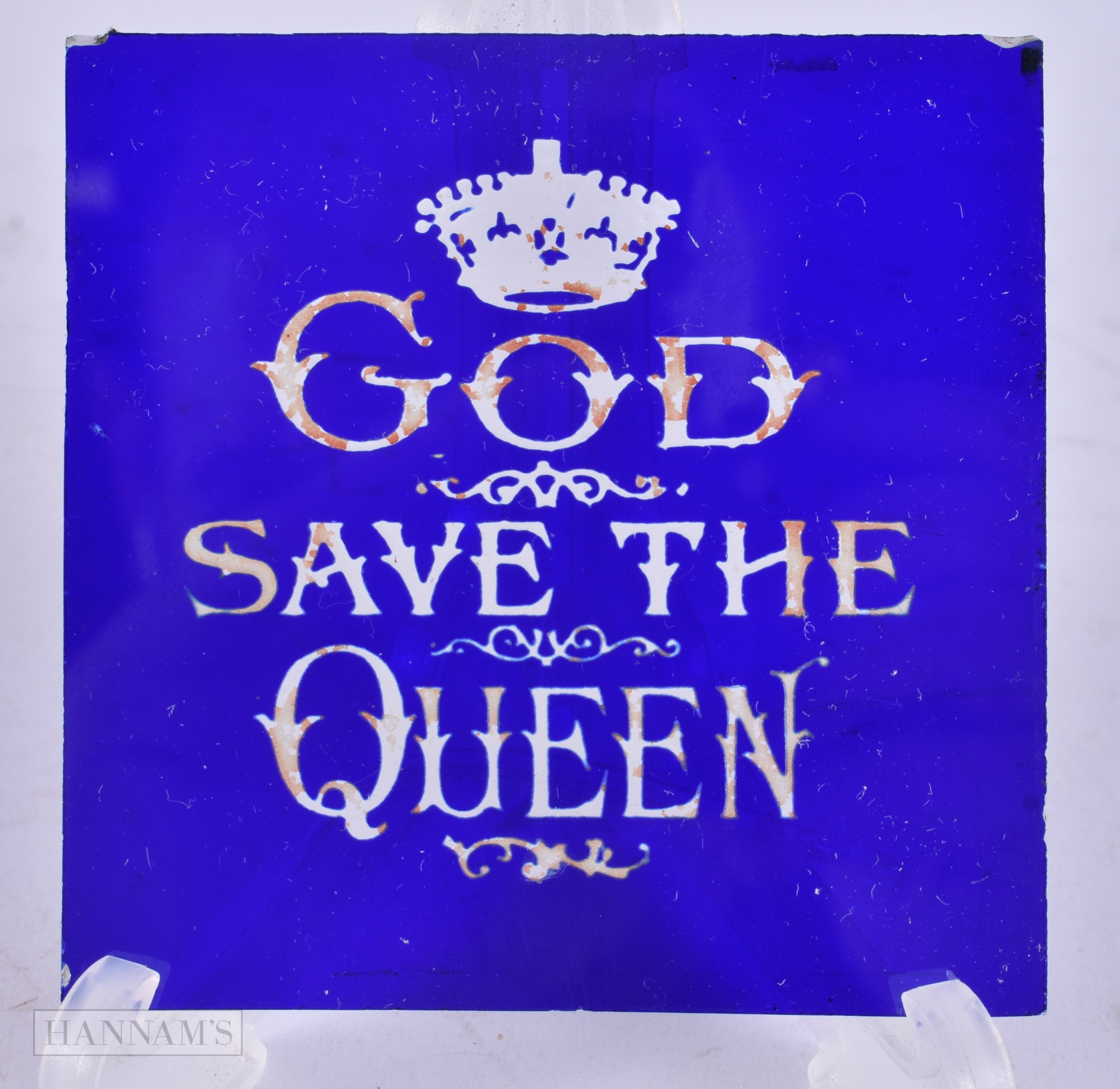 A VICTORIAN/EDWARDIAN BRISTOL BLUE GLASS GOD SAVE THE QUEEN PLAQUE. 8.25 cm square.