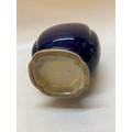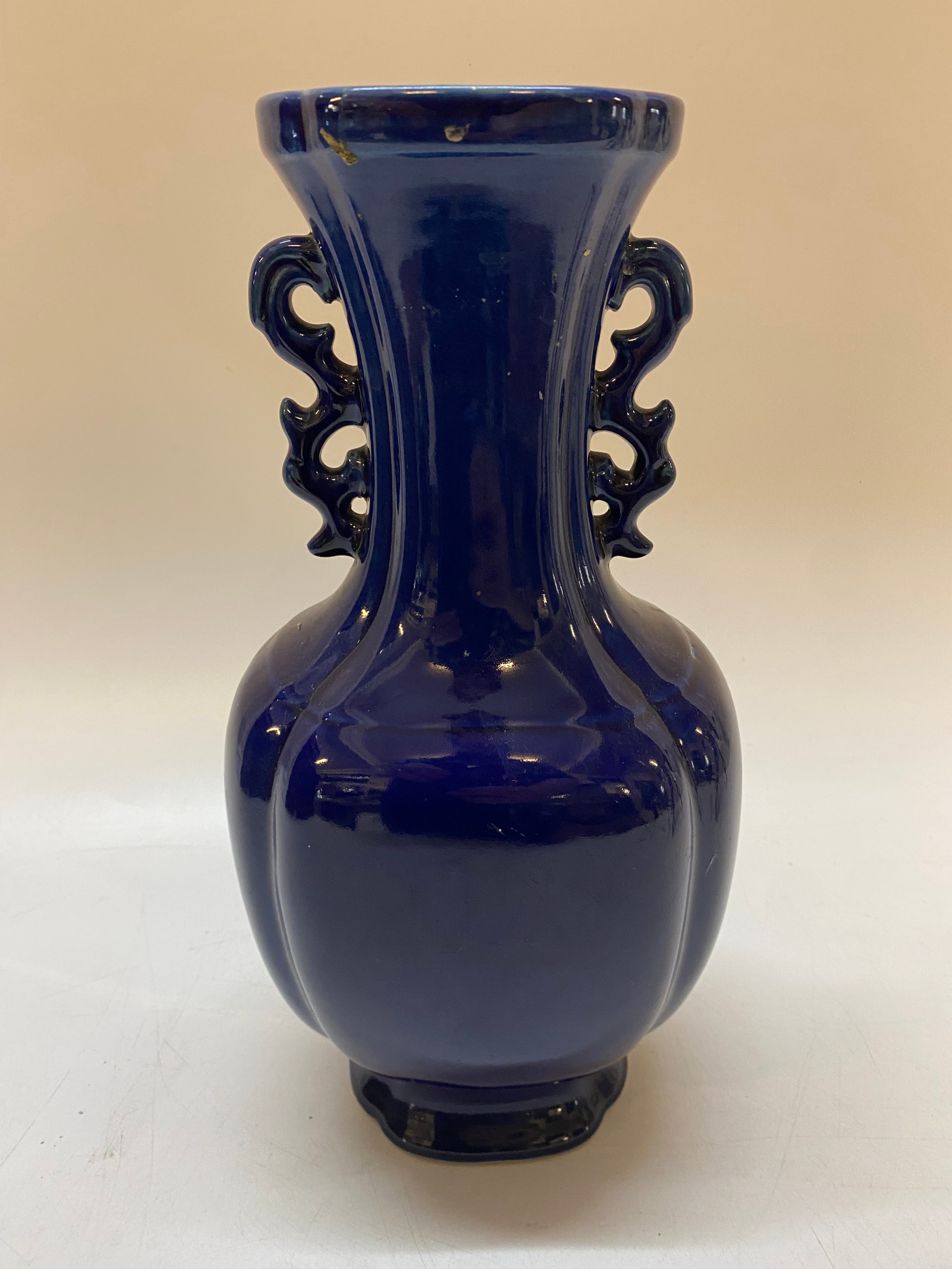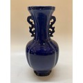 A Chinese blue glazed panelled vase with stylised handles - 12in. high
