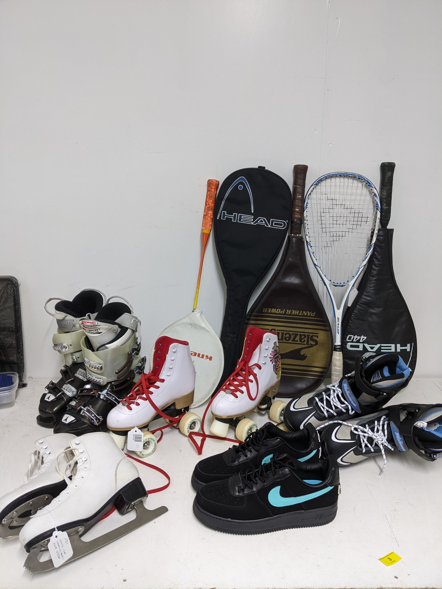 A mixed lot of sports equipment to include Rookie Roller skates advertising Coca Cola, AsySport Atomic ski boots, pair ice skating boots, mixed tennis and squash rackets, and other items.