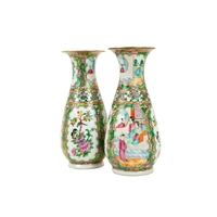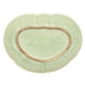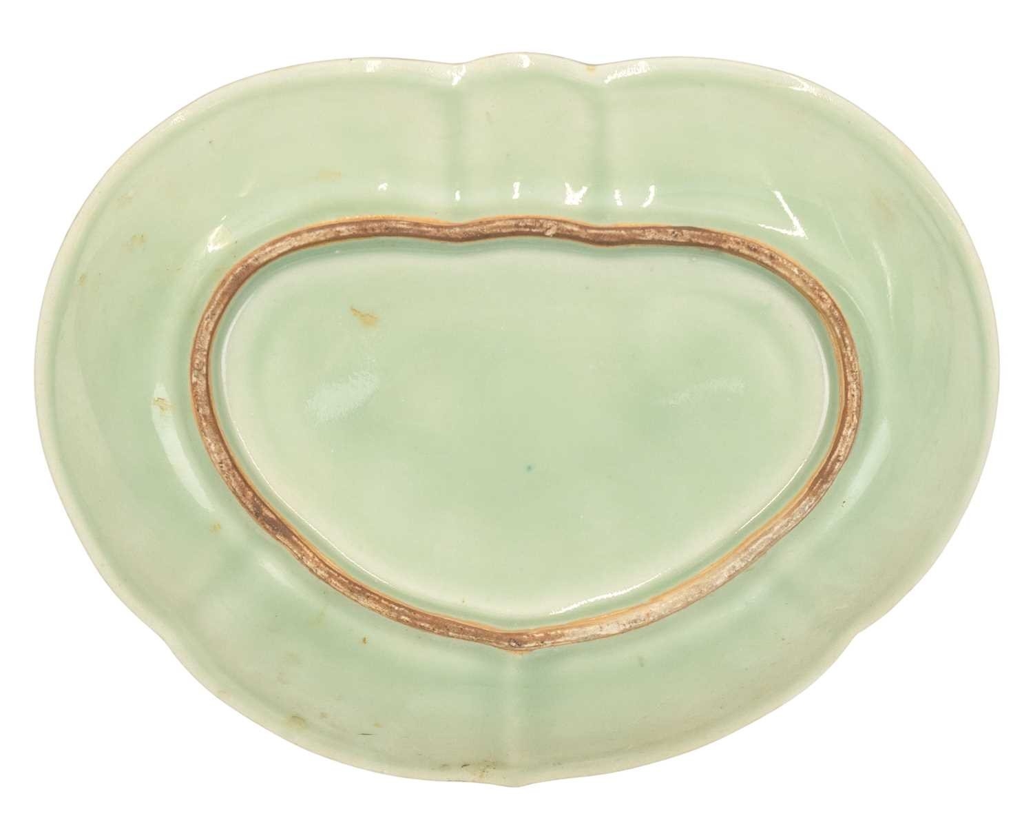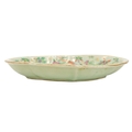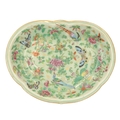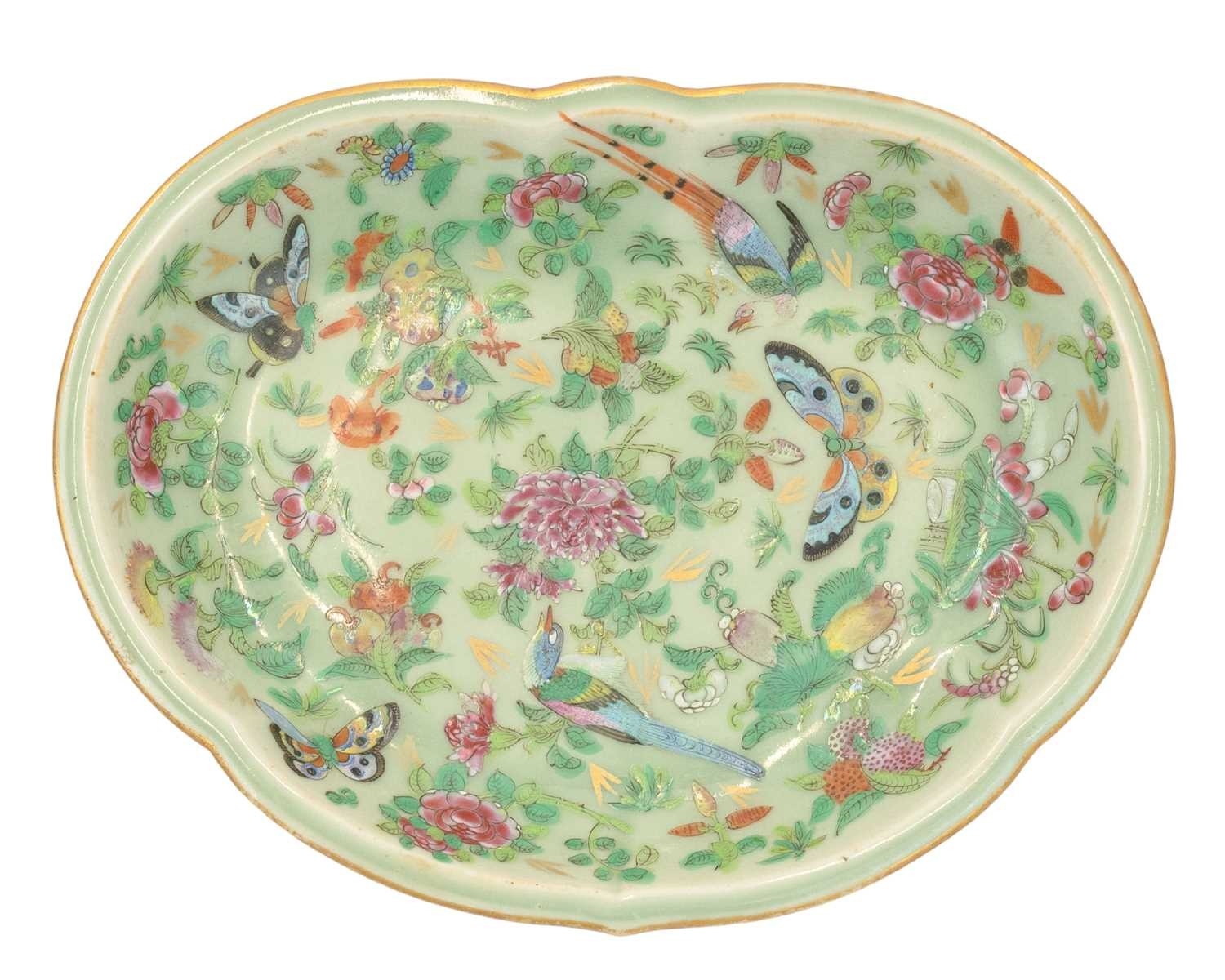 A Chinese Canton porcelain dish. Late 19th century, of kidney shape, painted in a famille rose palette with birds, insects, and flowers on a caladon ground, width 27cm.