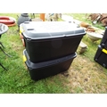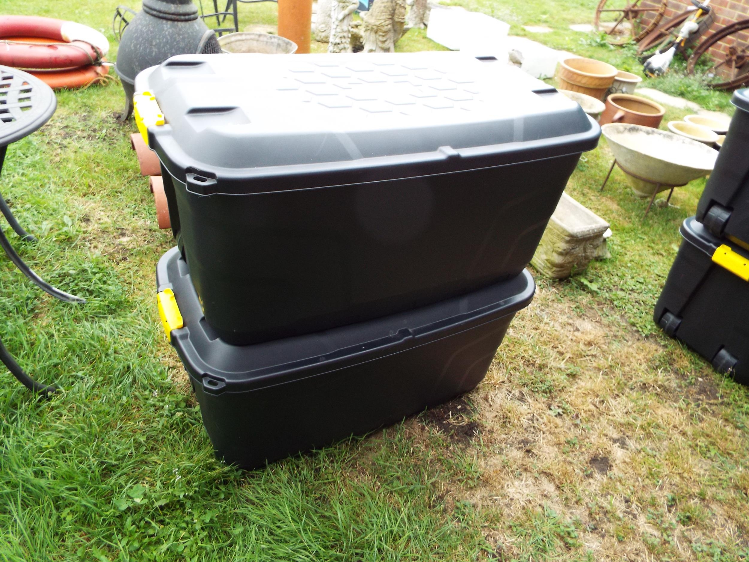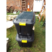 A pair of heavy duty plastic storage boxes with lids and four wheels, 145 litres