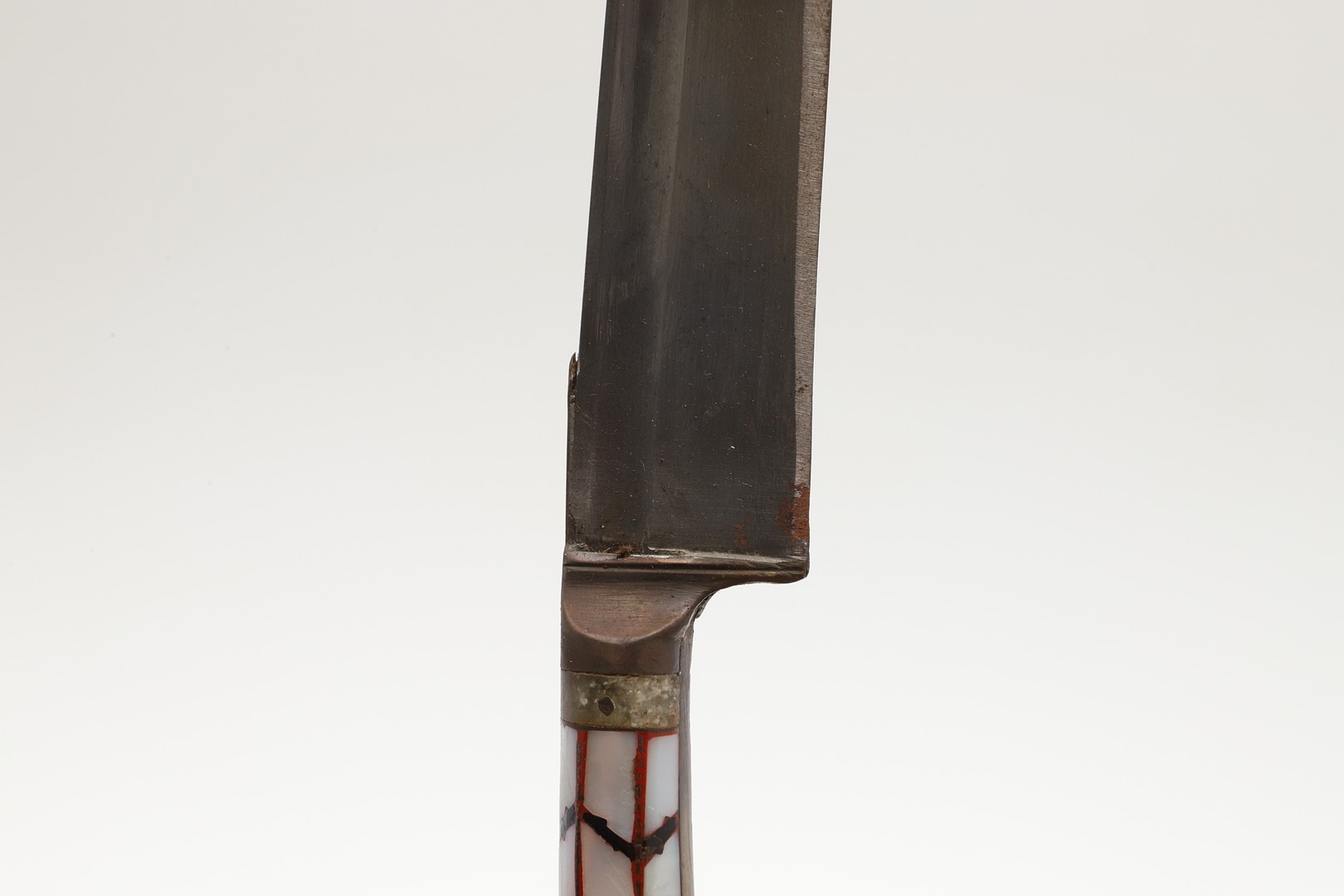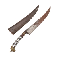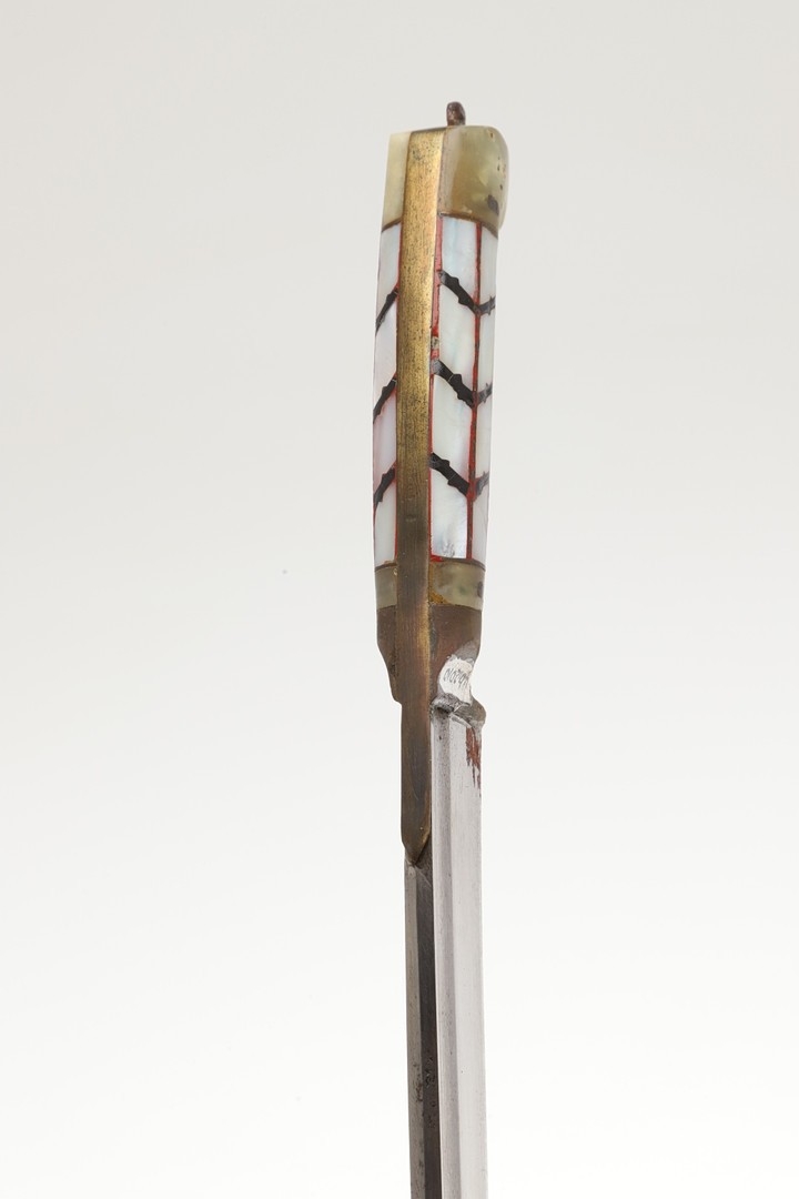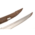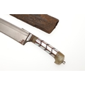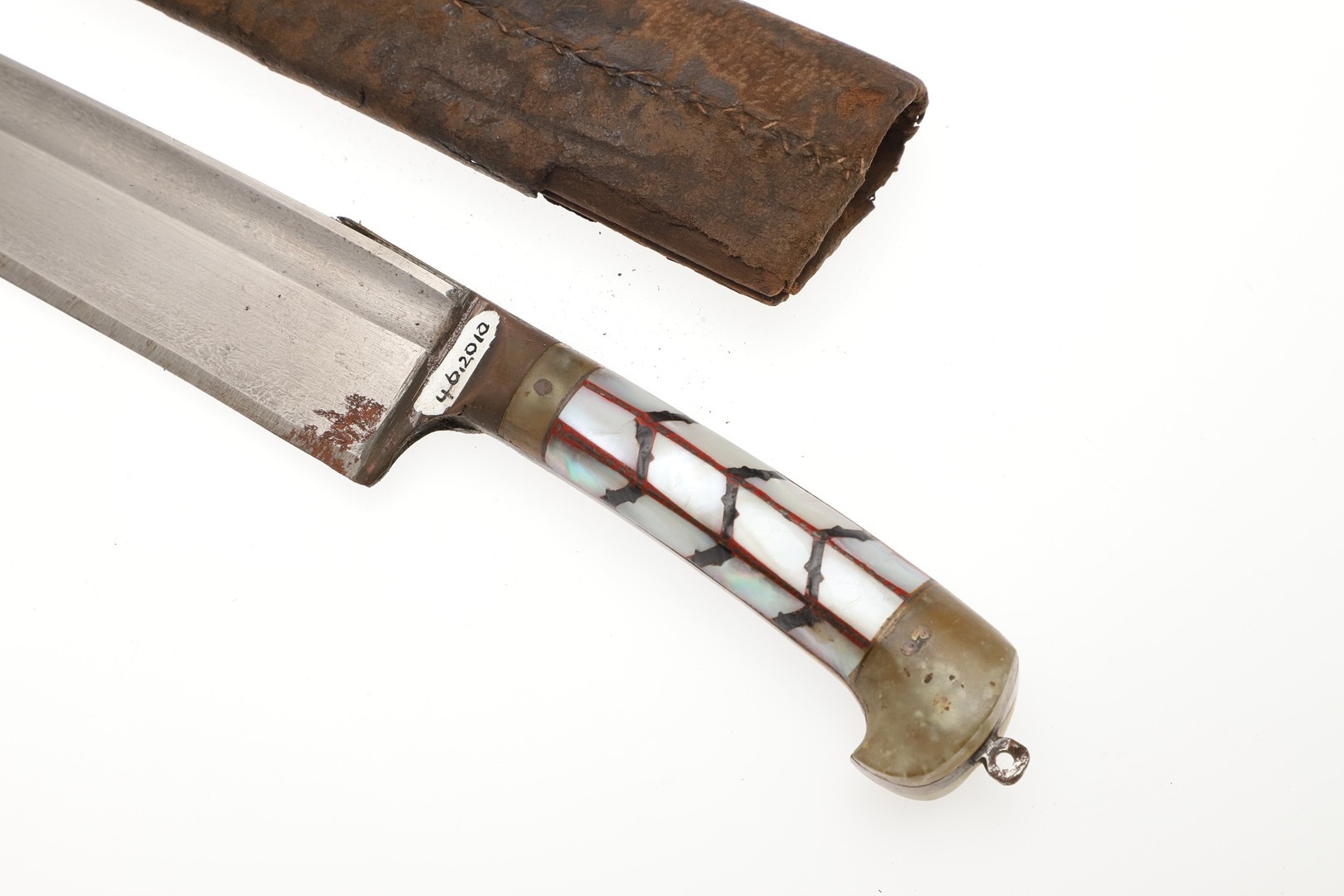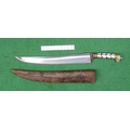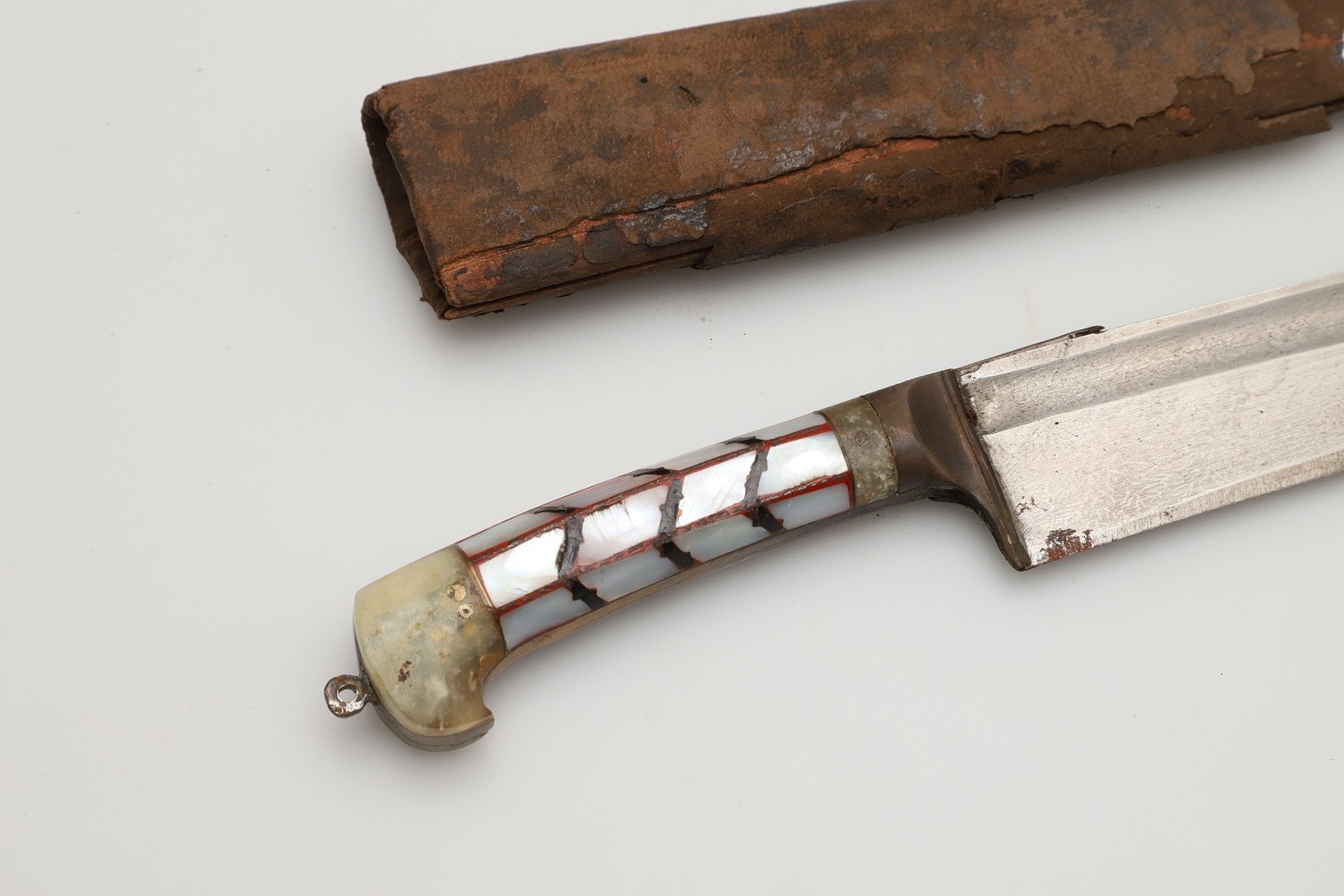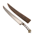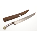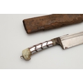 AN INDIAN OR AFGHAN CHHURA KNIFE WITH JADEITE GRIP. The 23 cm gently curved, pointed blade with a shallow fuller. Mounted on a decorative jadeite hilt set with mother of pearl panels. In a brown leather scabbard. 33 cm.