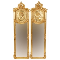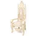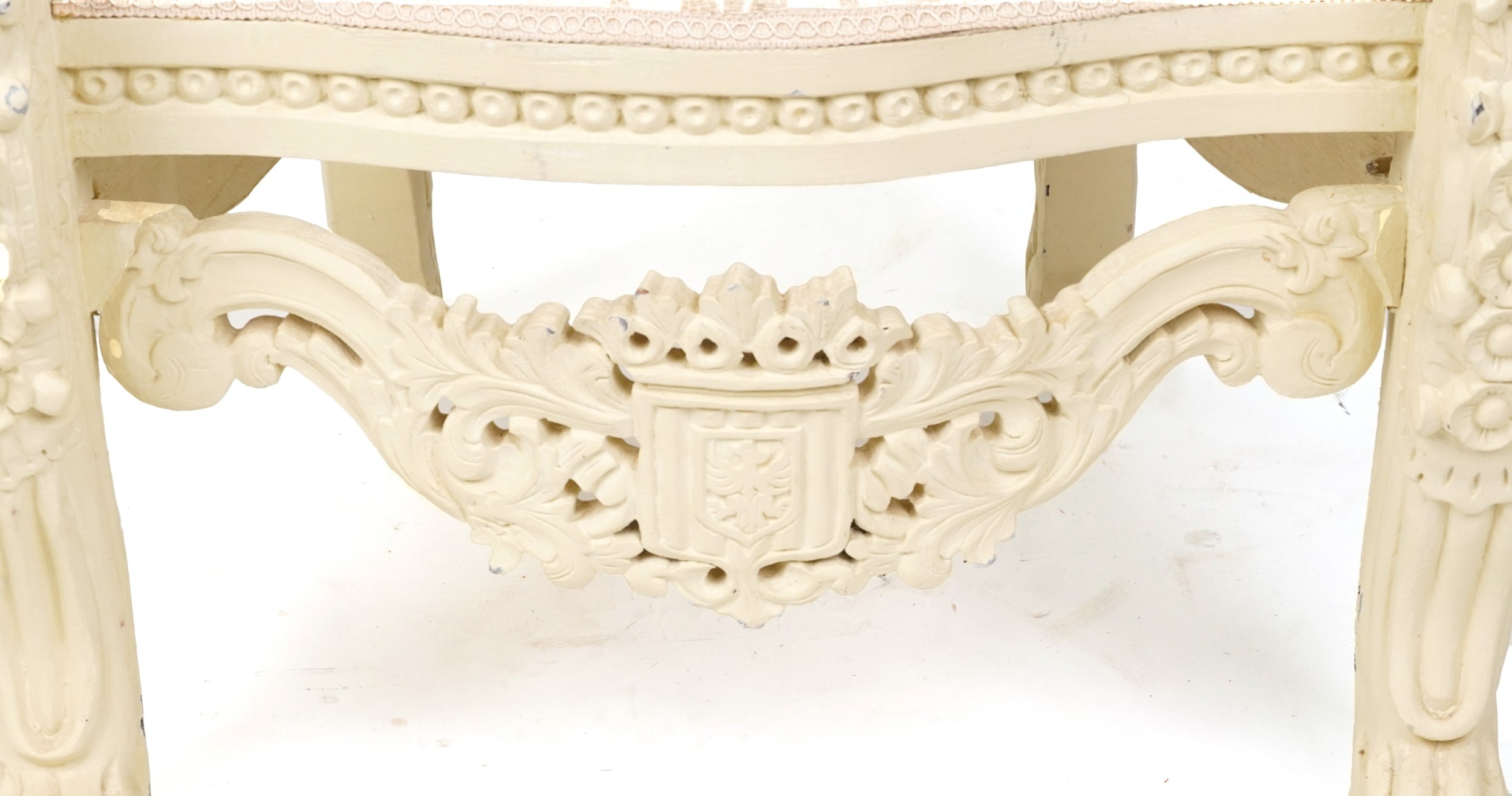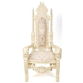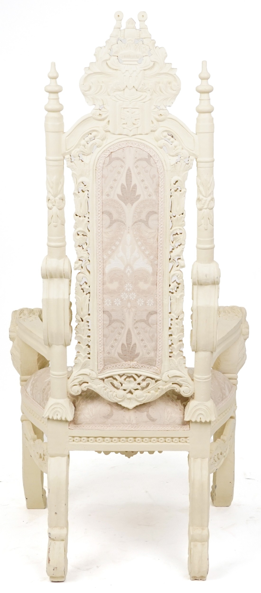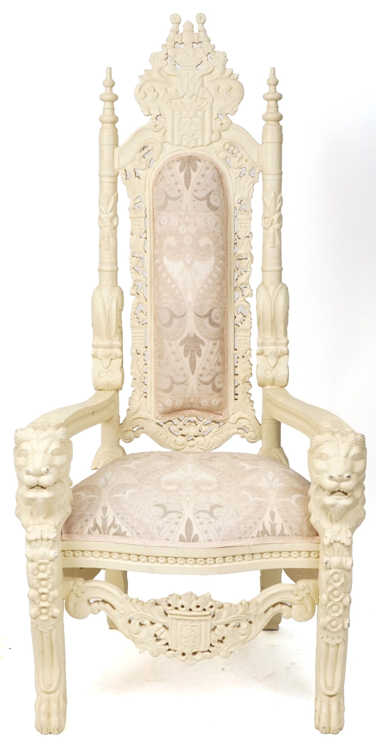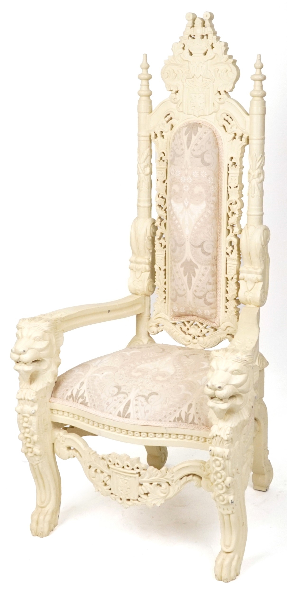 A 20th century white painted throne chair with carved decoration, the upholstered seat and back supported by lion mask arm supports, 154cm H x 75cm W x 61cm D.