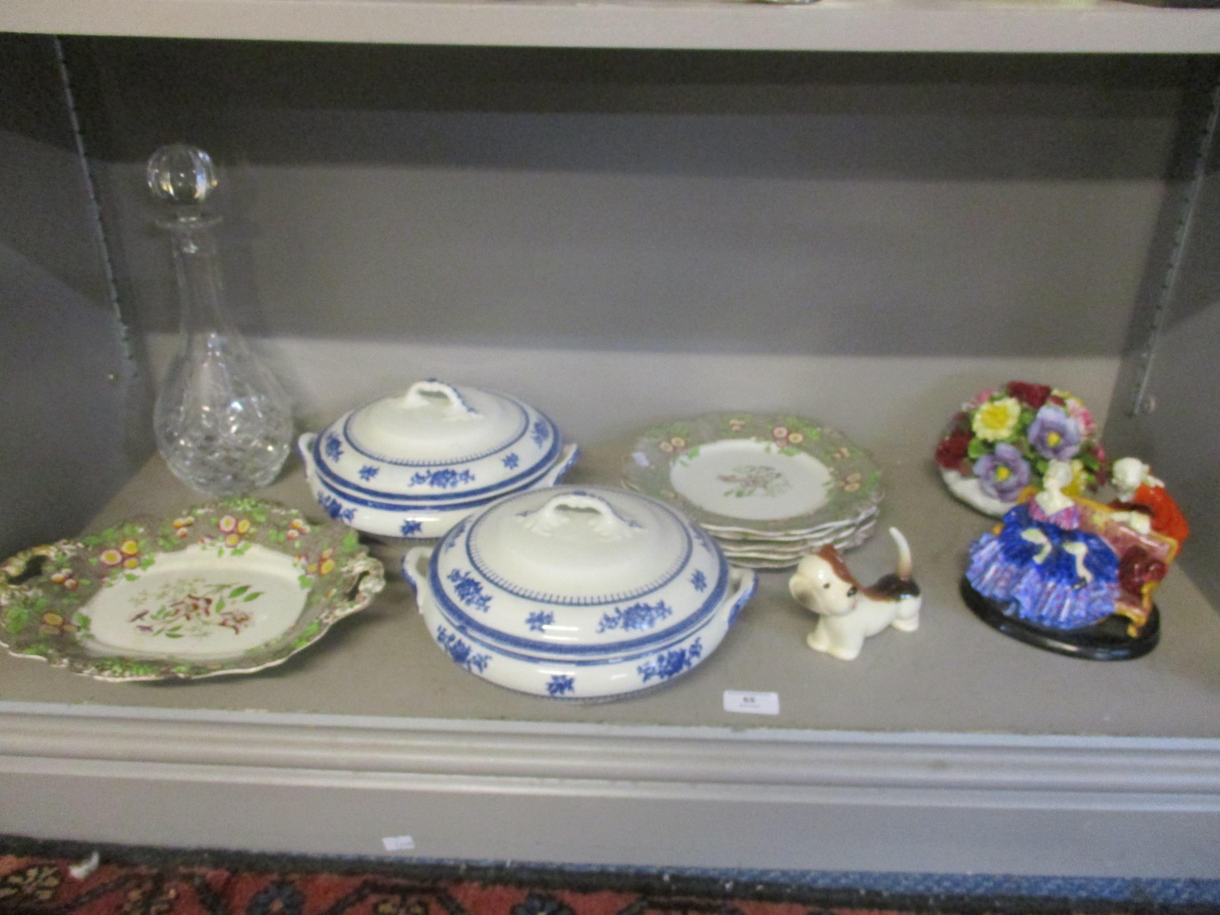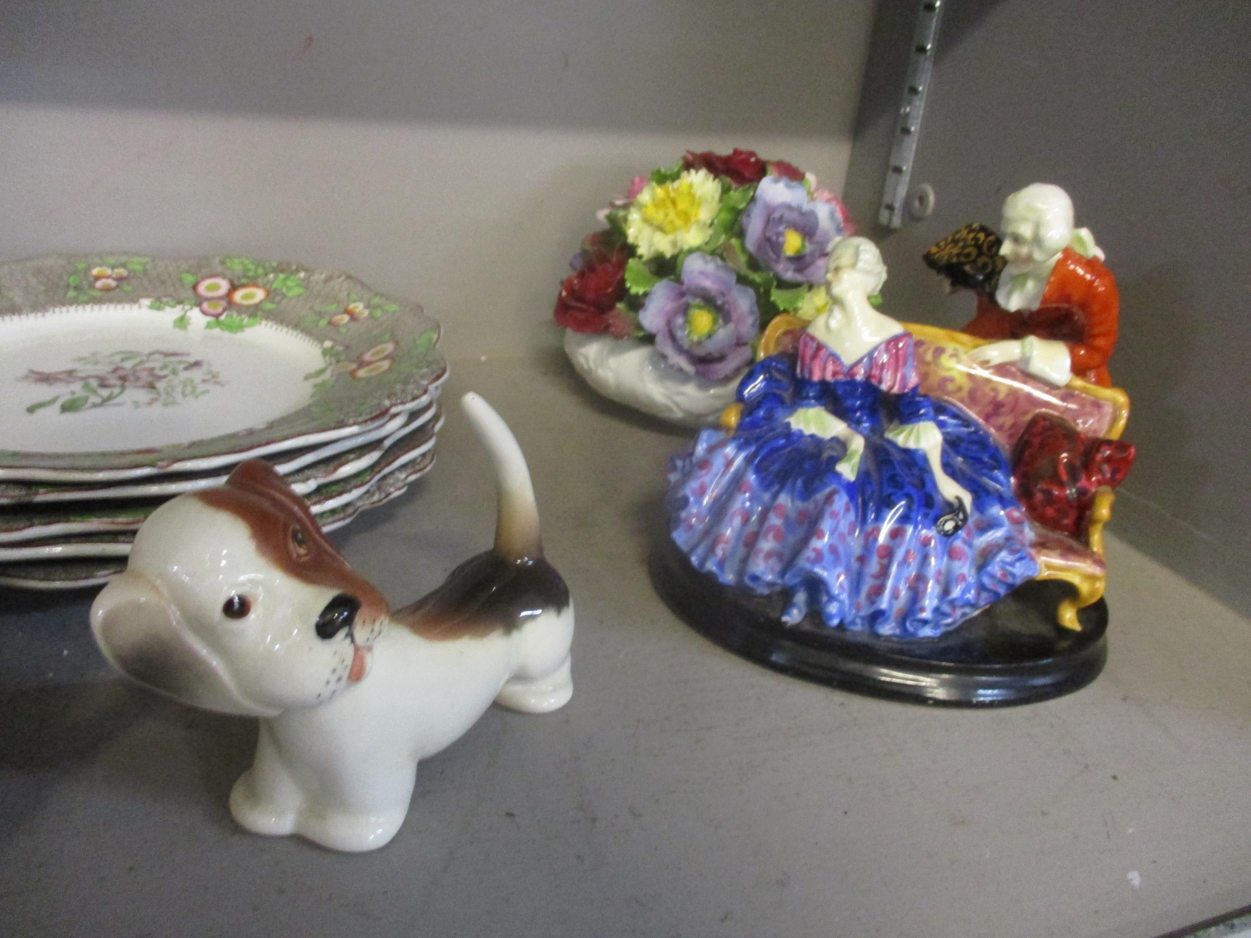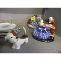 A selection of ceramics to include Tete-a-Tete - a Royal Doulton figure group (A/F), a Beswick model of a comical Dachshund from the Fun Models series, a Victorian part dessert service, cut glass decanter, and other items