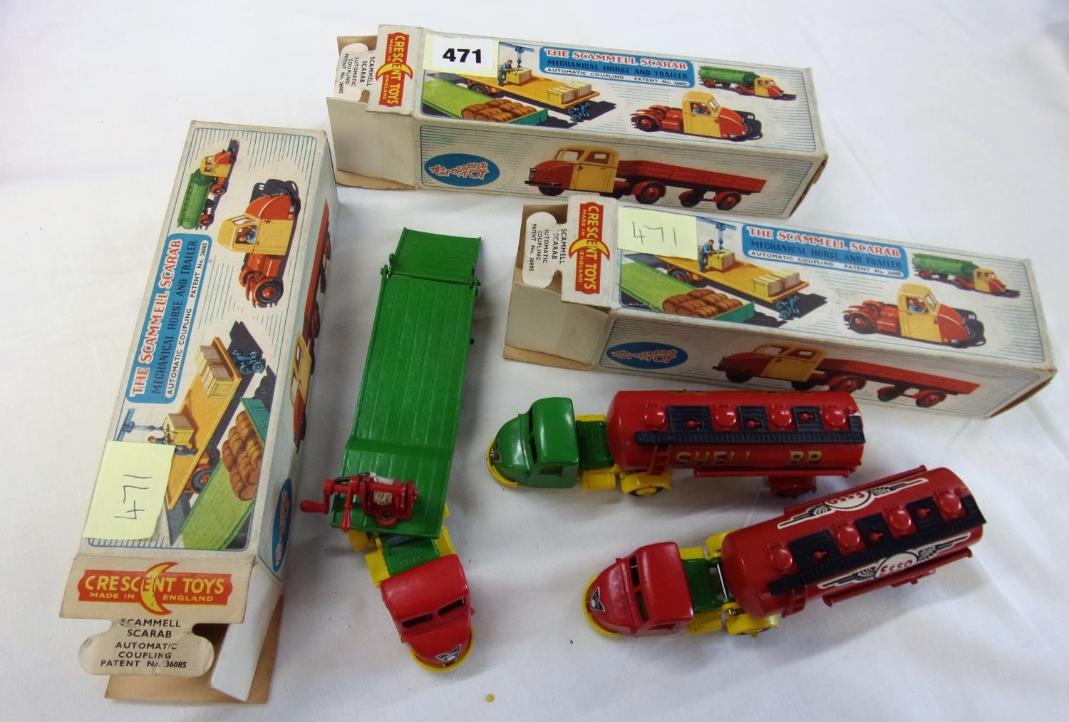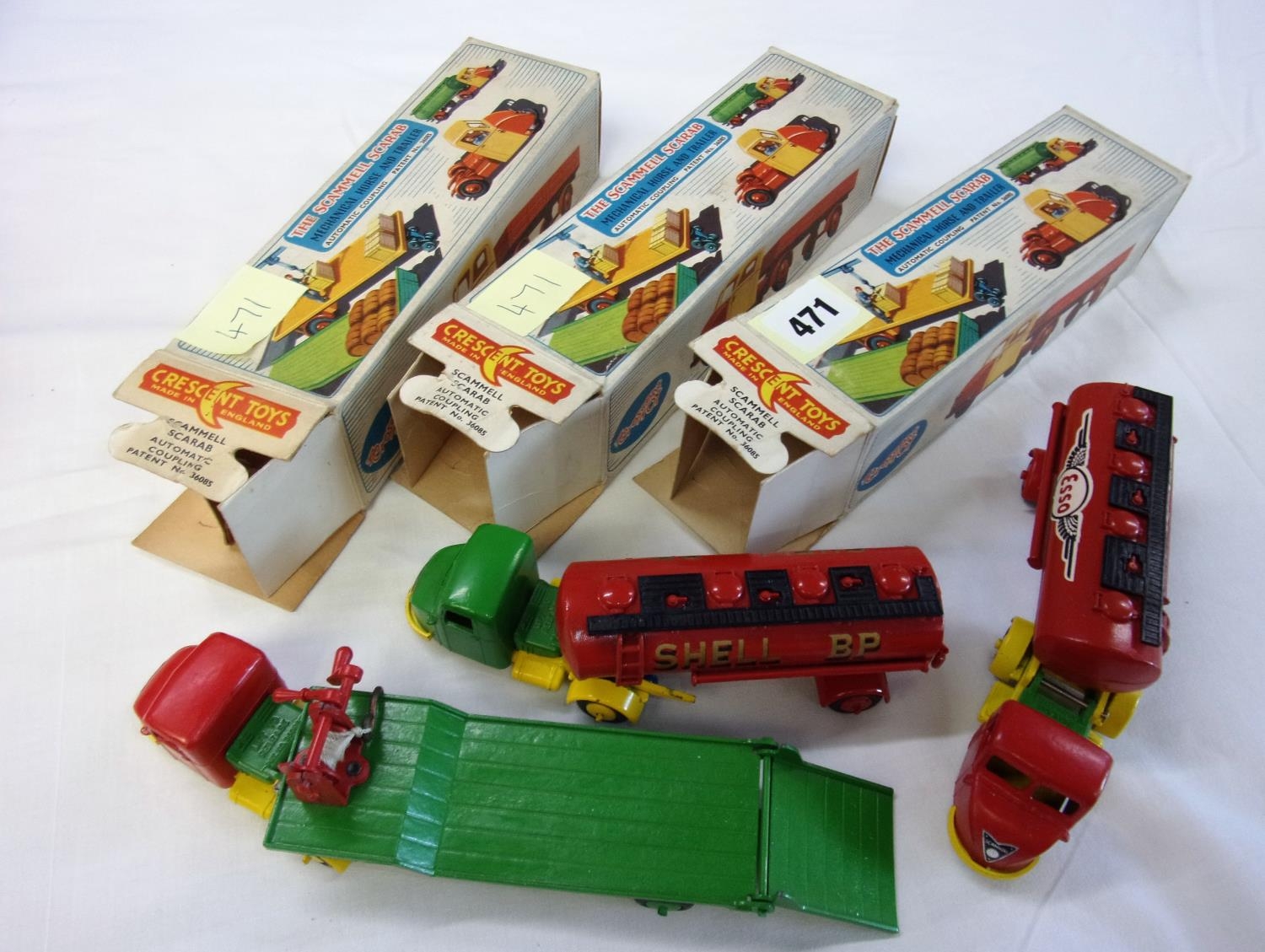 CRESCENT TOYS NUMBER 1276 SCAMMELL SCARAB WITH SHELL BP TANKER T/W 1276 SCAMMELL SCARAB WITH ESSO TANKER AND 1274 SCAMMELL SCARAB WITH LOW LOADER TRAILER ALL IN VERY GOOD CONDITION AND BOXED