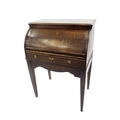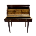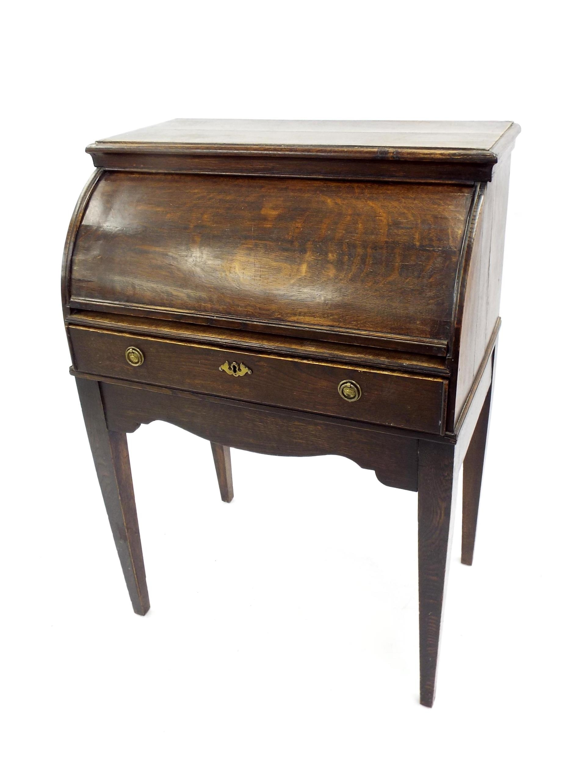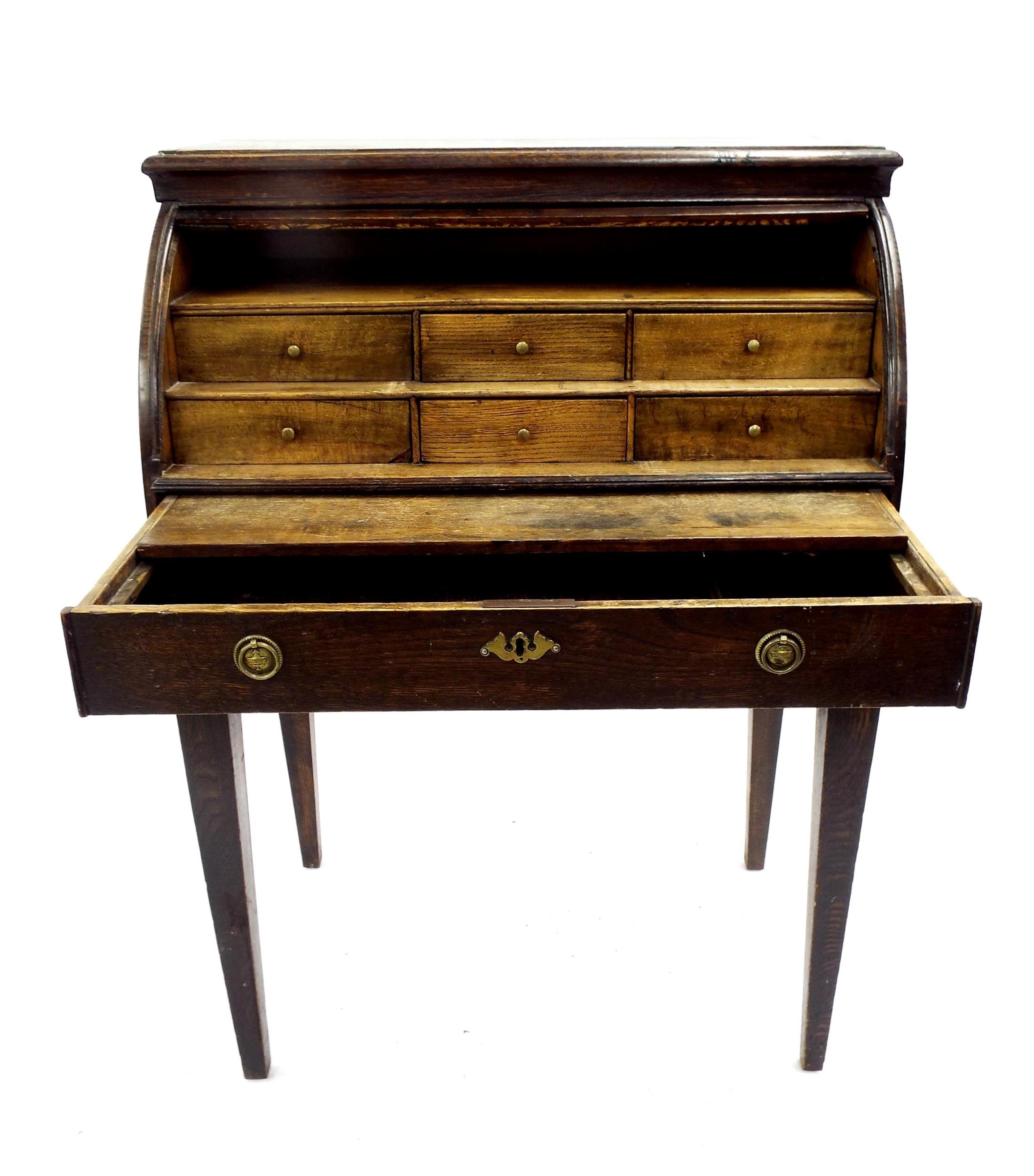 19th century oak cylinder desk, opening to reveal a two tier stepped interior of six small drawers over a single drawer, shaped frieze and square tapered legs, 30" wide, 41" high