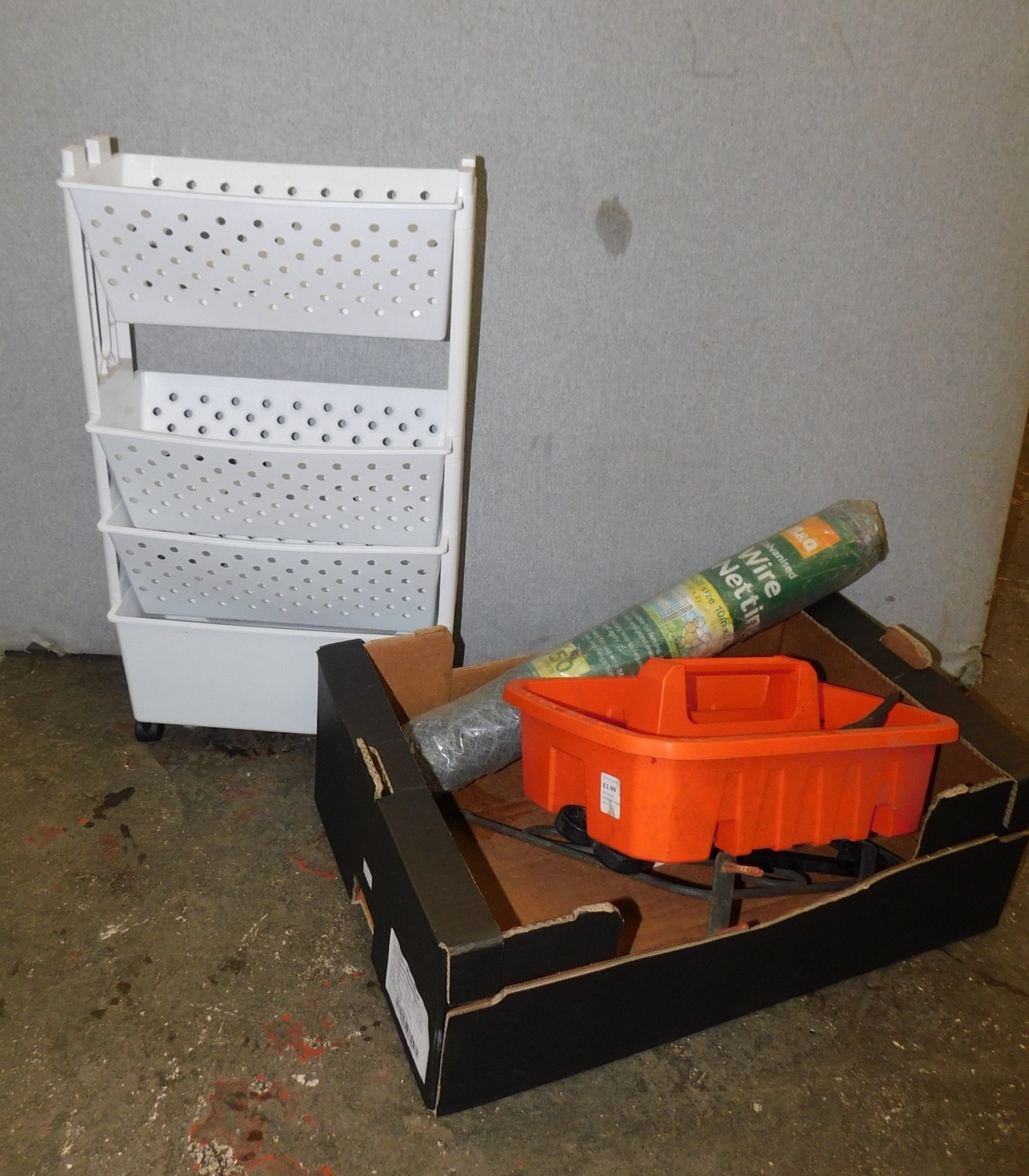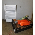 Feeding garden trolley and box of fencing, hanging baskets etc.