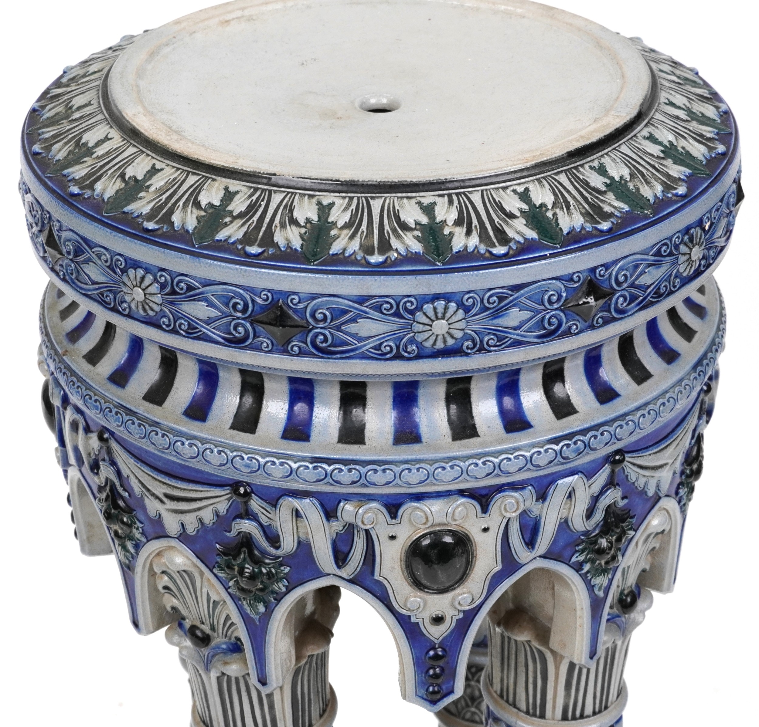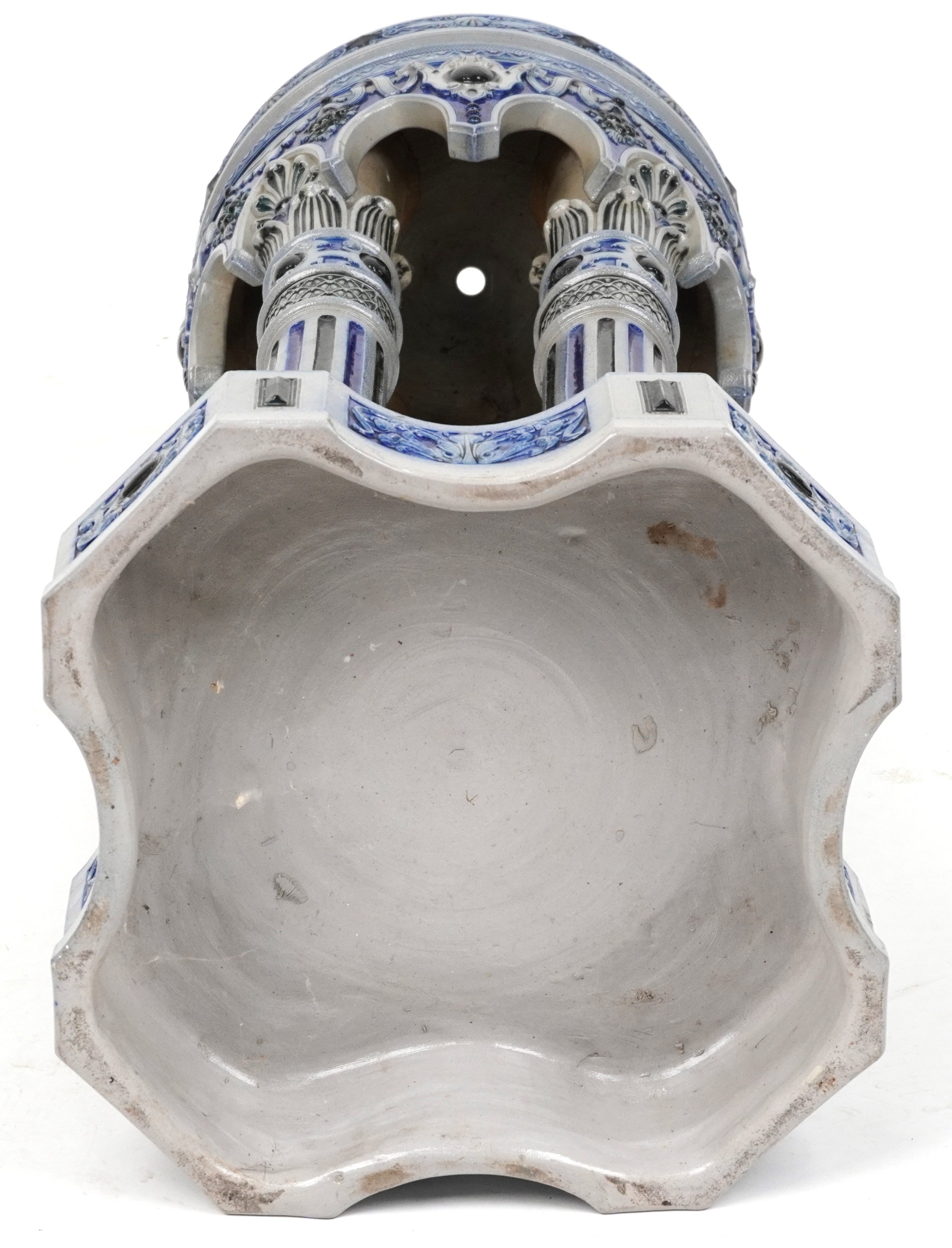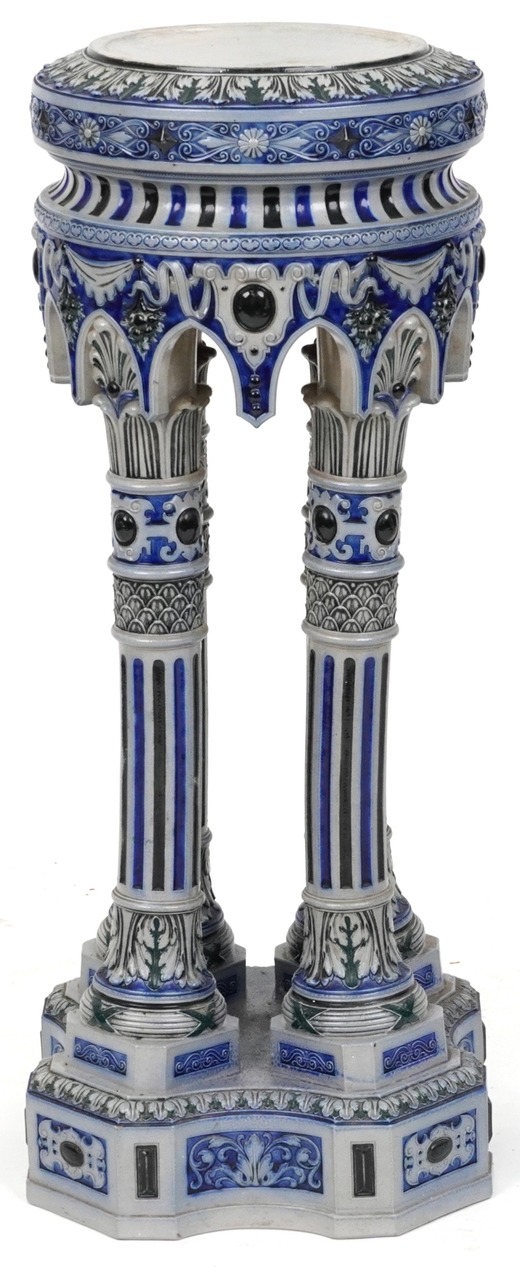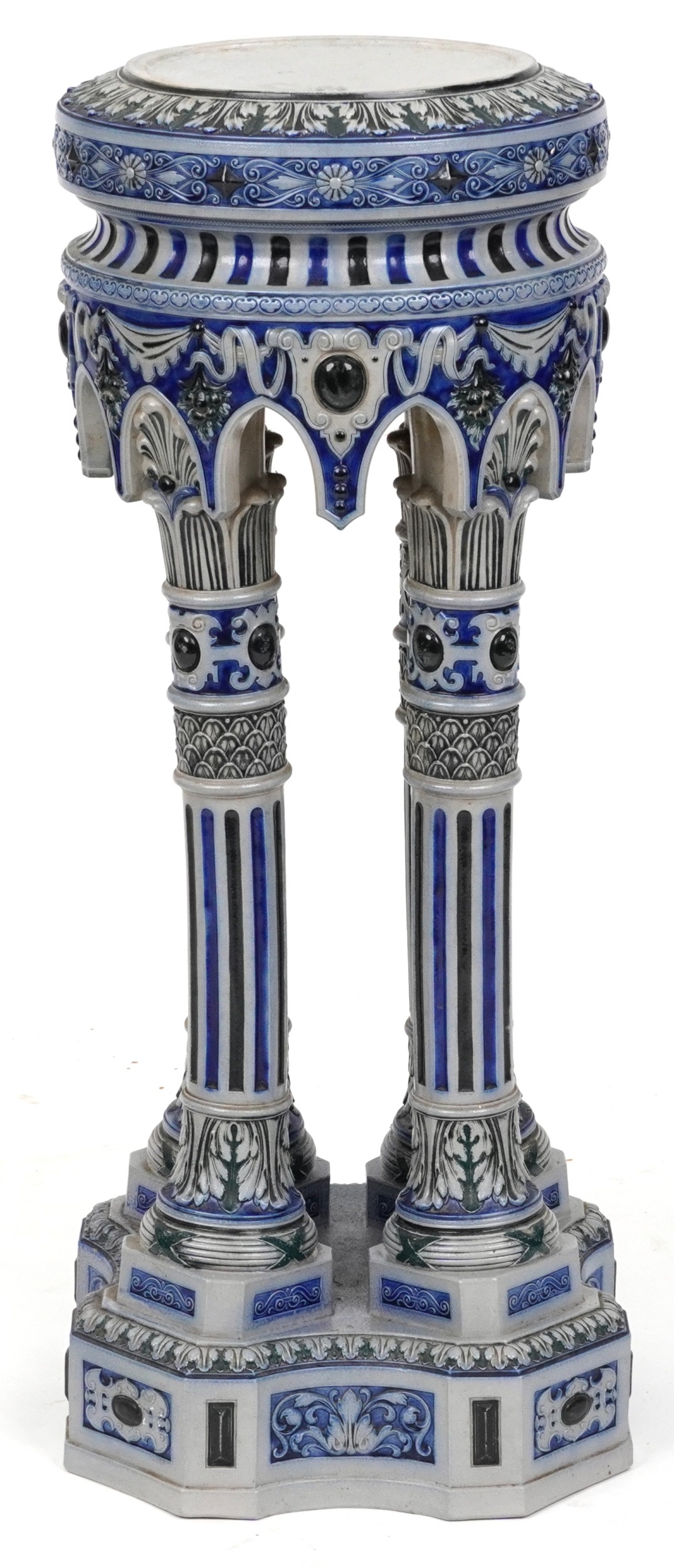 An early 20th century German Westerwald stoneware jardinière stand, the circular top raised on four fluted columns on a pedestal base, 83cm high.