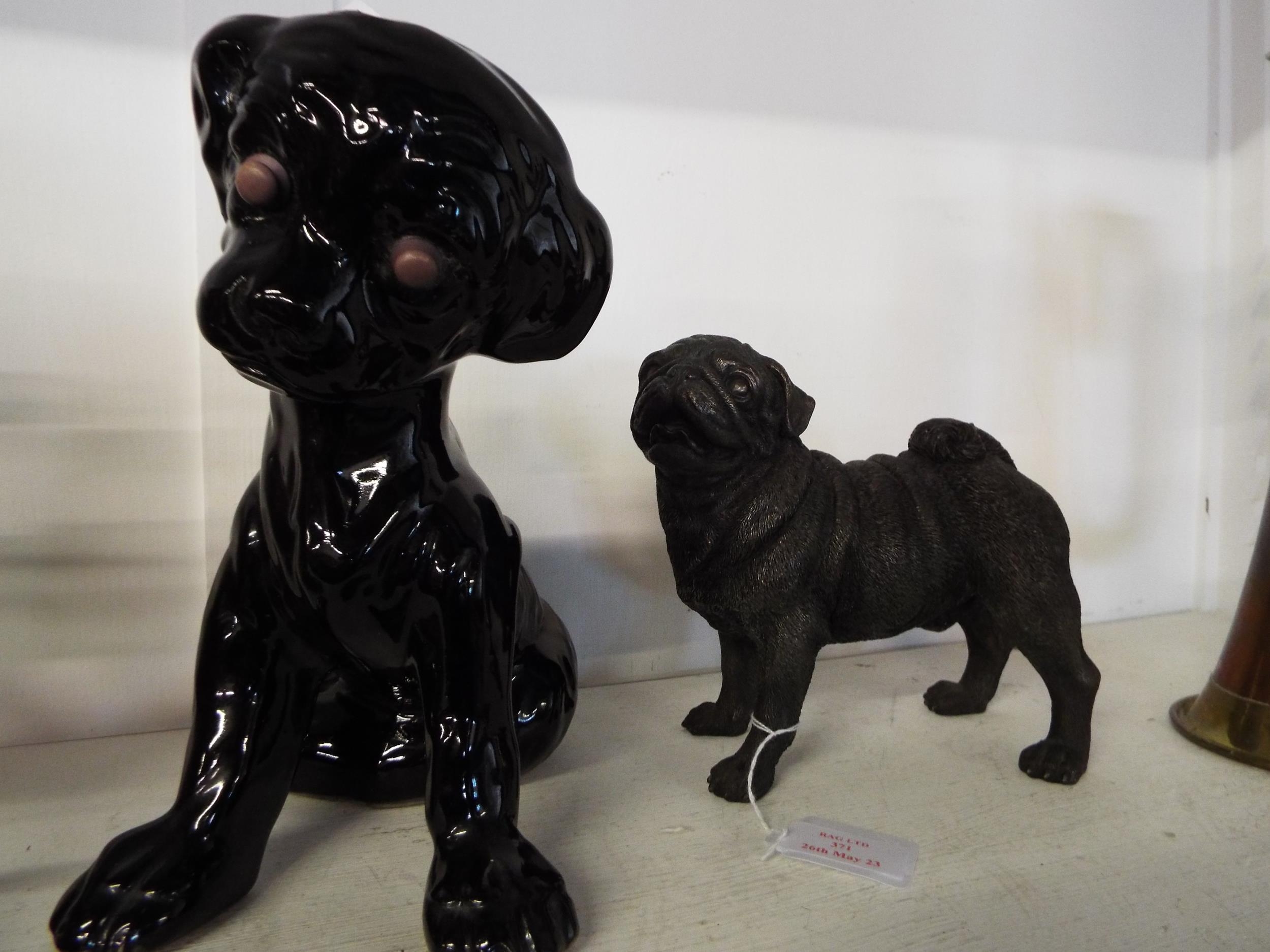 A Torquay pottery black glazed dog and a resin figure of a pug