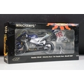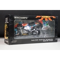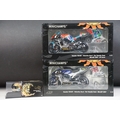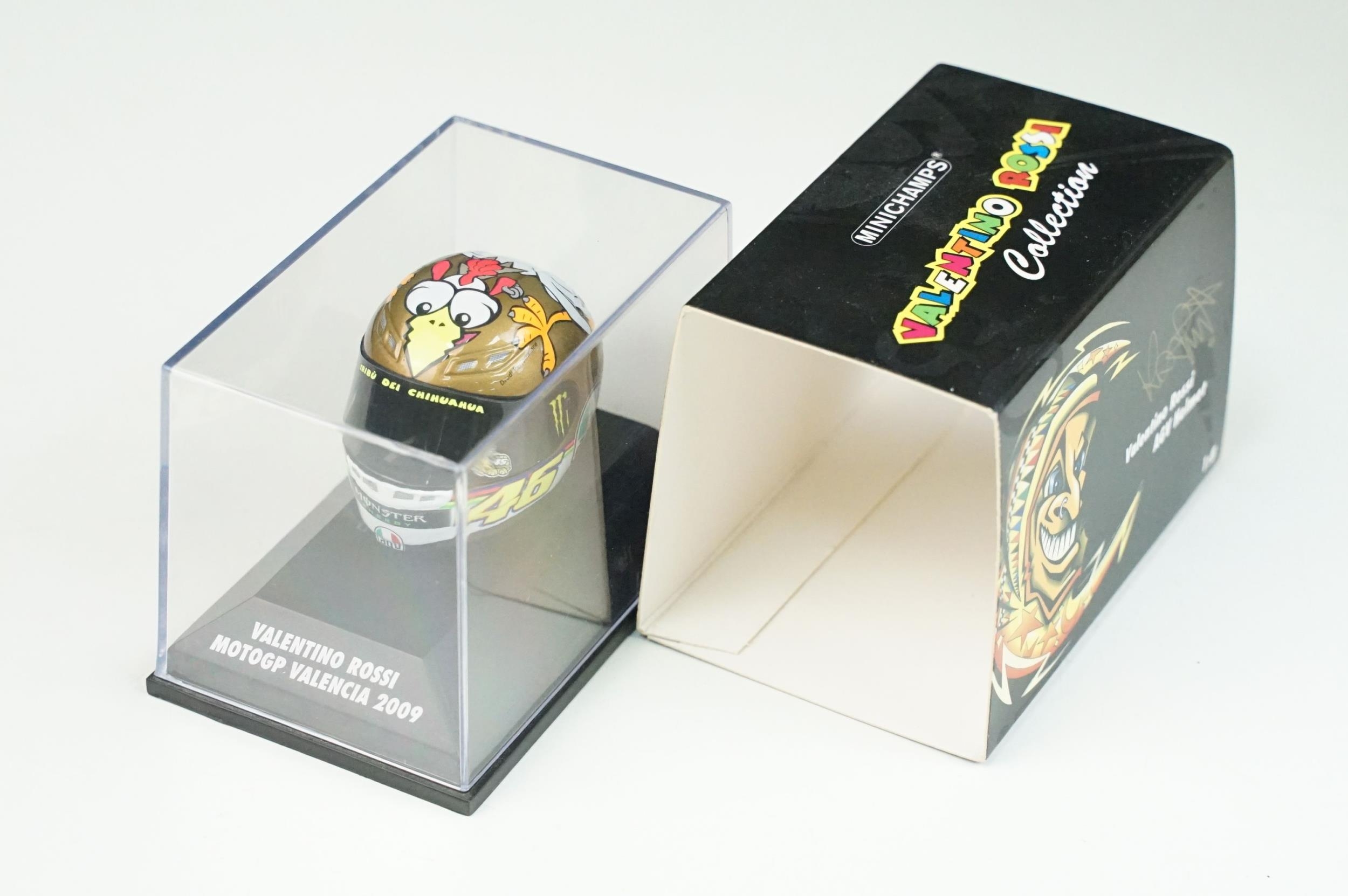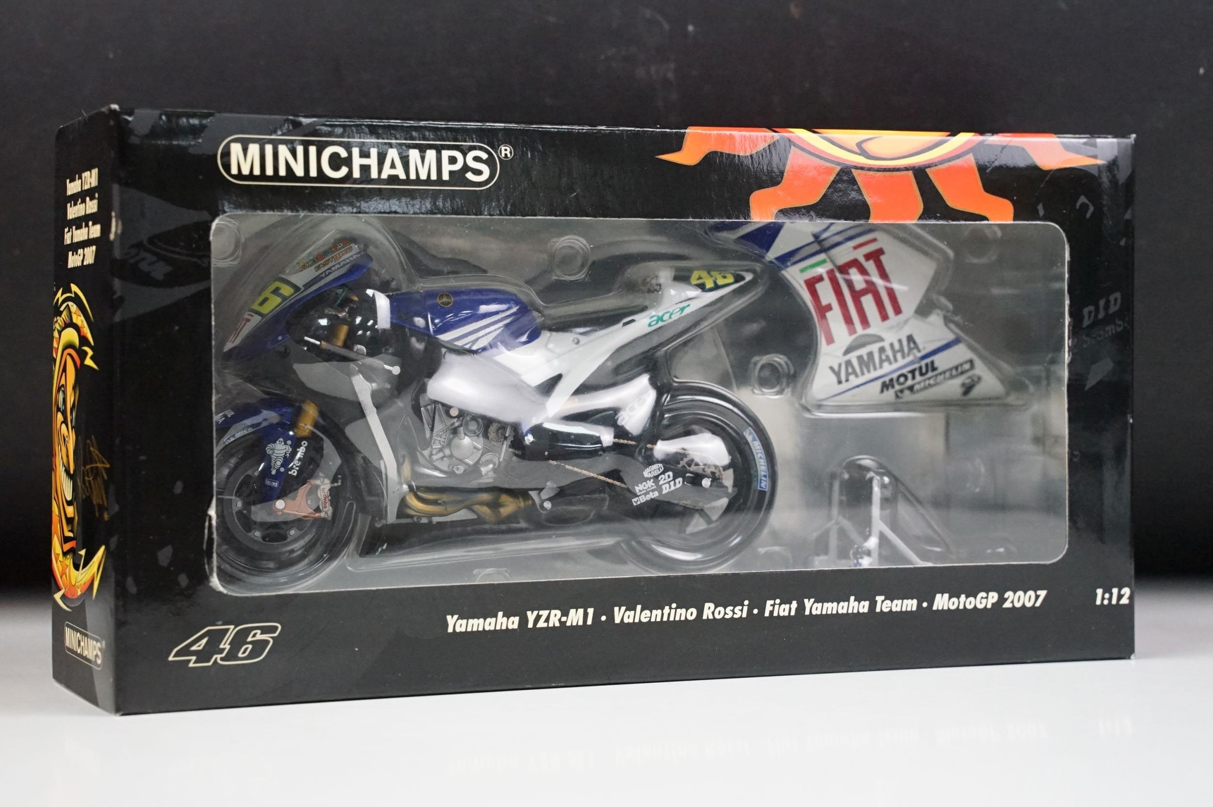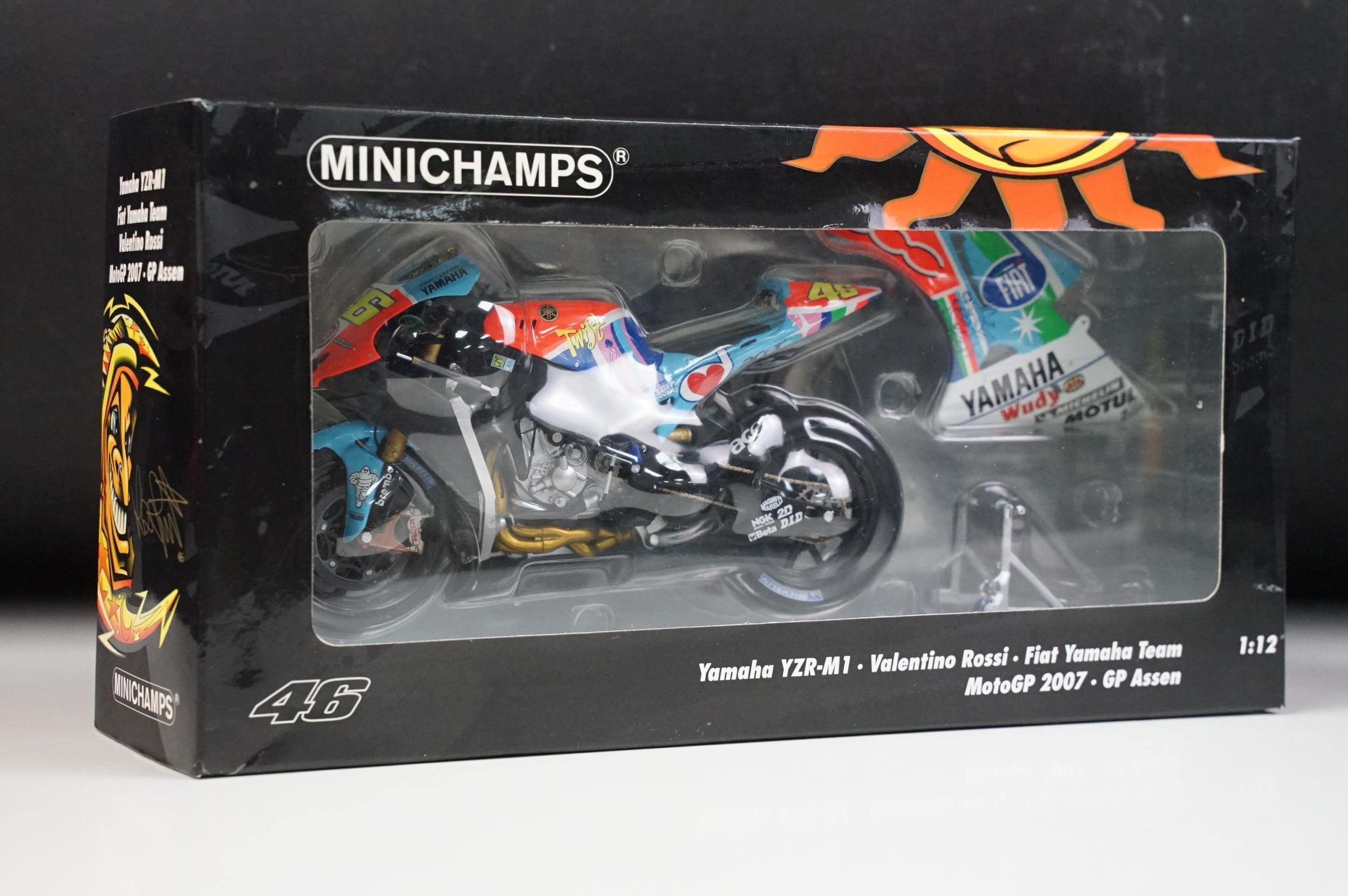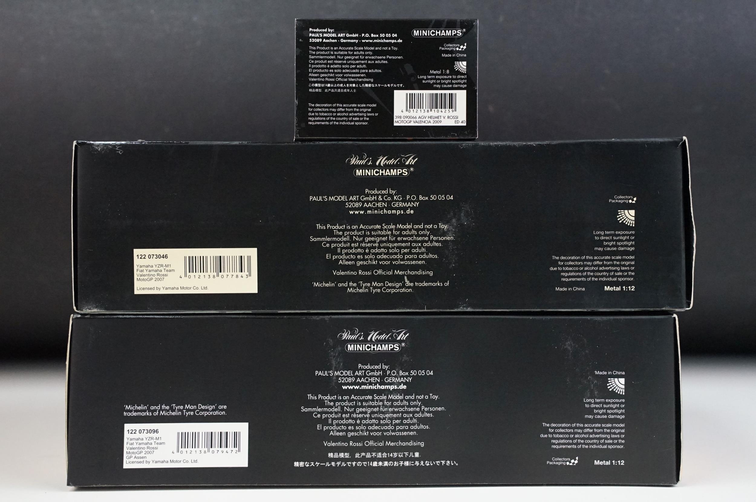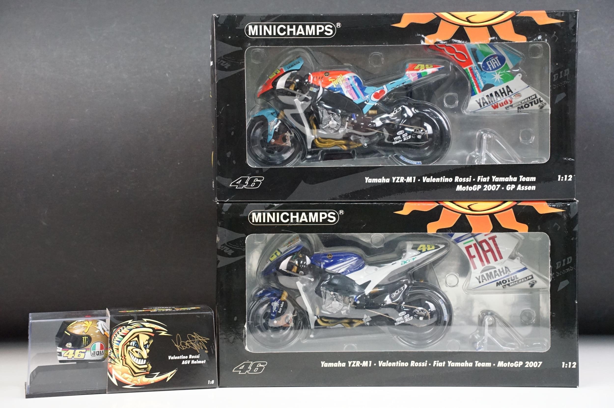 Two boxed Paul's Model Art Minichamps 1/12 Valentino Rossi Collection diecast models to include 122 073046 Yamaha YZR M1 Fiat Yamaha Team MotoGP 2007 and 122 073096 Yamaha YZR M1 Fiat Yamaha Team MotoGP 2007 GP Assen (bottom of box flap requires re-glue) plus a boxed Minichamps Valentino Rossi Collection 398 090066 AGV Helmet V Rossi MotoGP Valencia 2009, diecast ex, boxes gd (3 items)