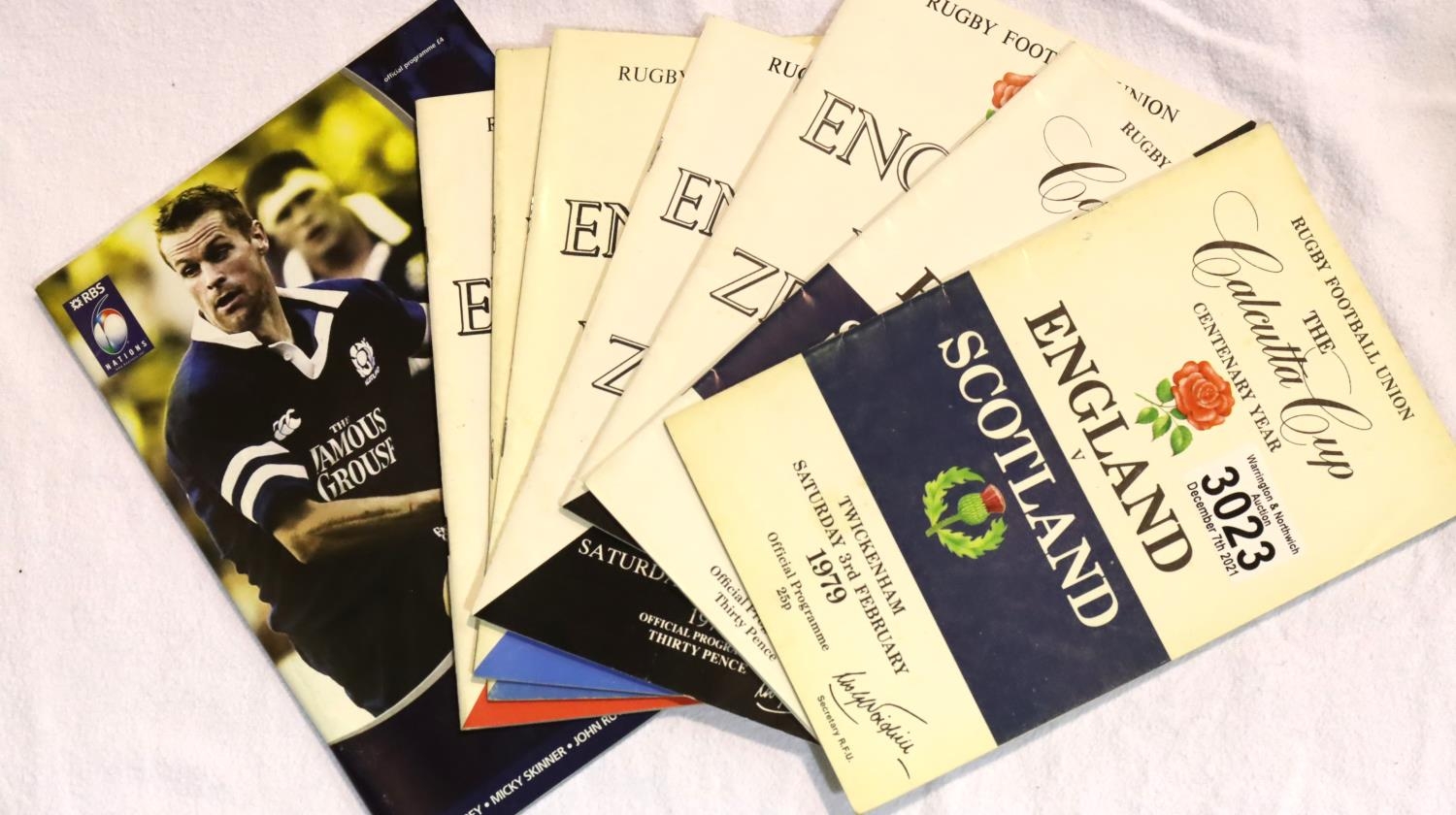 England Rugby Union programmes, Scotland 1979 and 1981, Wales 1980, New Zealand 1979 (2) and France 1979 (2). P&P Group 2 (£18+VAT for the first lot and £3+VAT for subsequent lots)