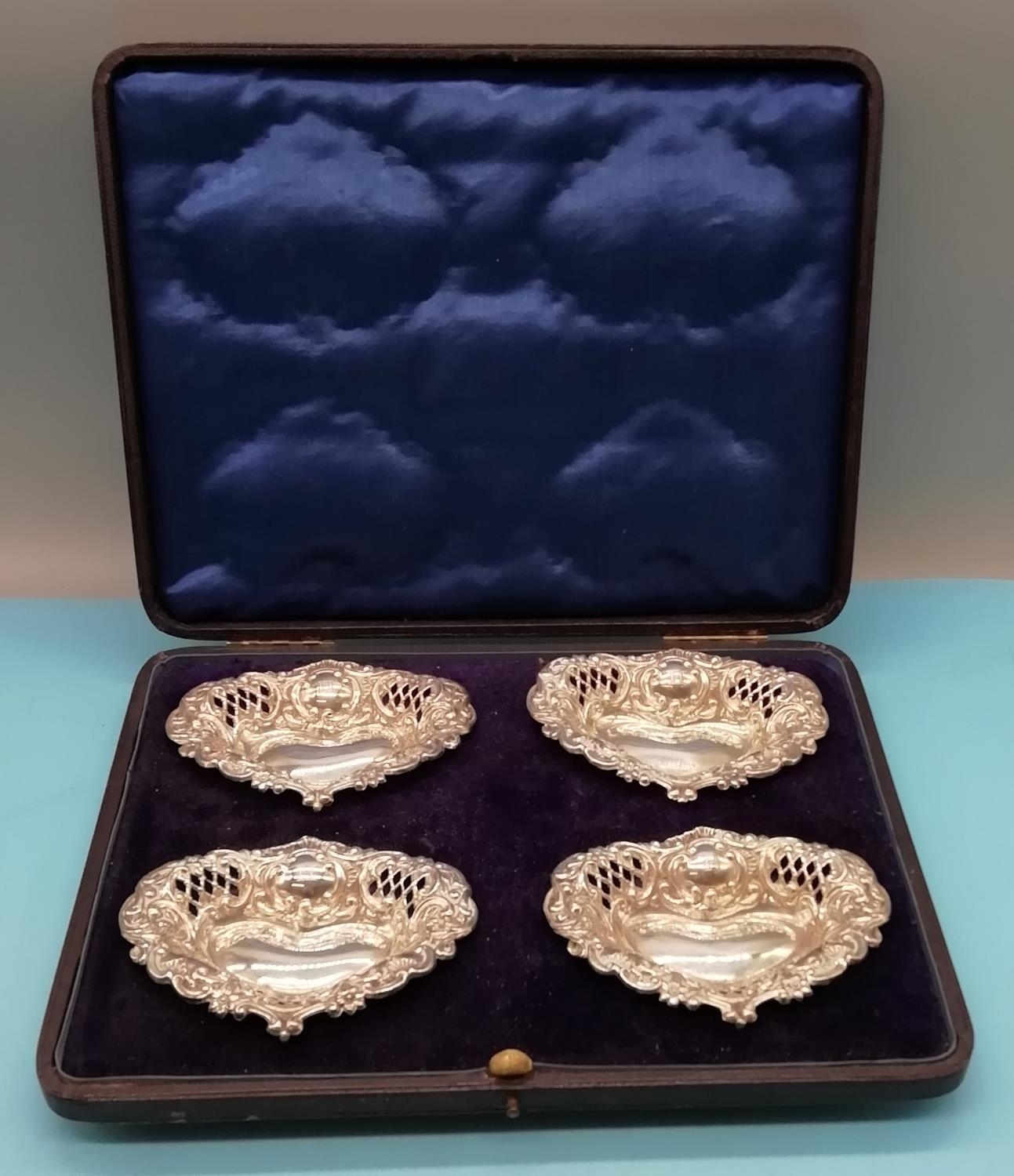 Silver Hallmarked Set of 4 Heart Shaped Bon Bon Dishes in Presentation Case. 70.6Grams.